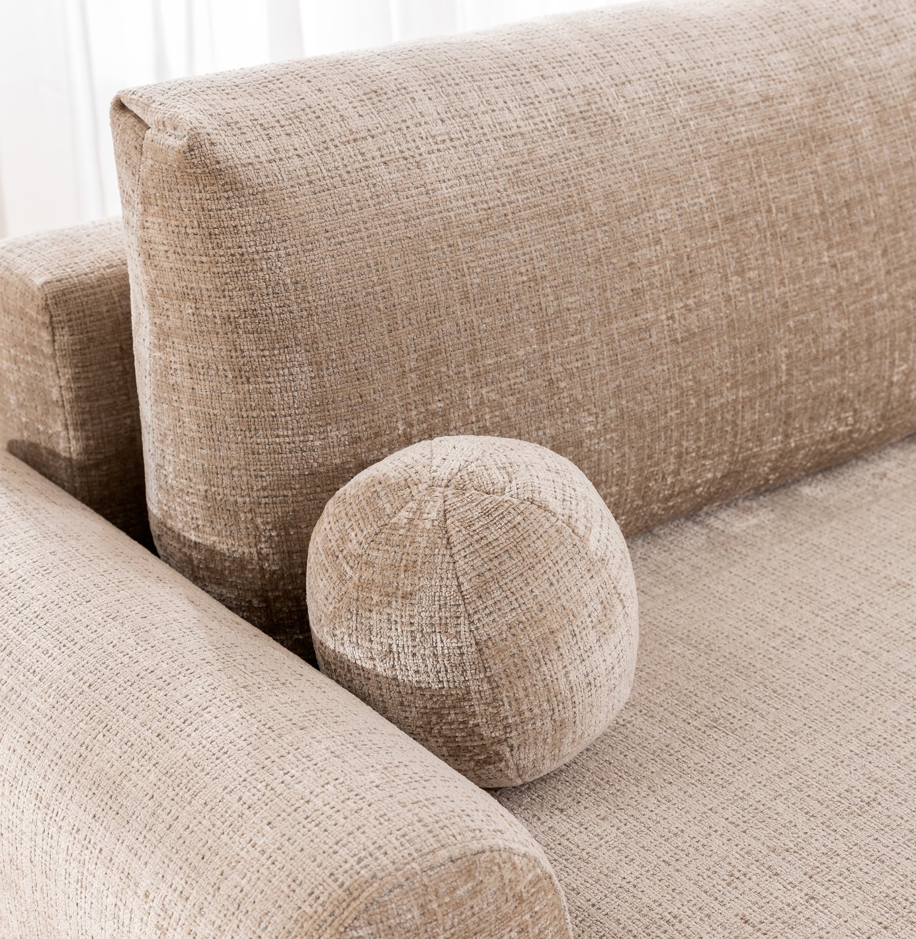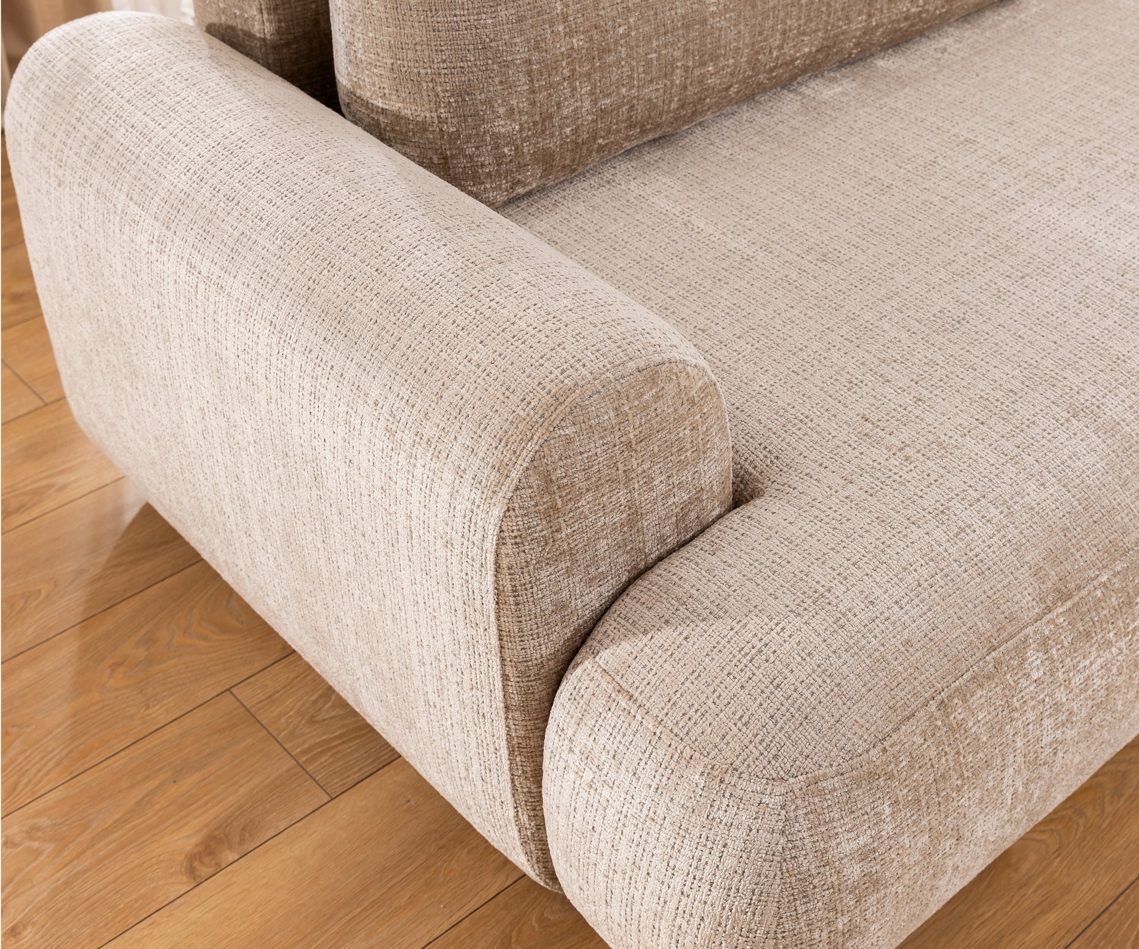 Okvir trosjeda izrađen je od drveta i iverice, što mu daje čvrstoću i dug vijek trajanja. Naslon i sjedalo sadrže poliuretansku pjenu T30, koja zadržava oblik i udobnost i nakon duže upotrebe. Dodatnu potporu pružaju valovite opruge tipa B, koje osiguravaju elastičnost i optimalnu raspodjelu težine. Tapeciranje od kvalitetne tkanine ugodno je na dodir, a istovremeno omogućuje jednostavno održavanje. Jastuci su punjeni mješavinom pjene, što stvara mekanu, ali istovremeno stabilnu potporu za leđa.