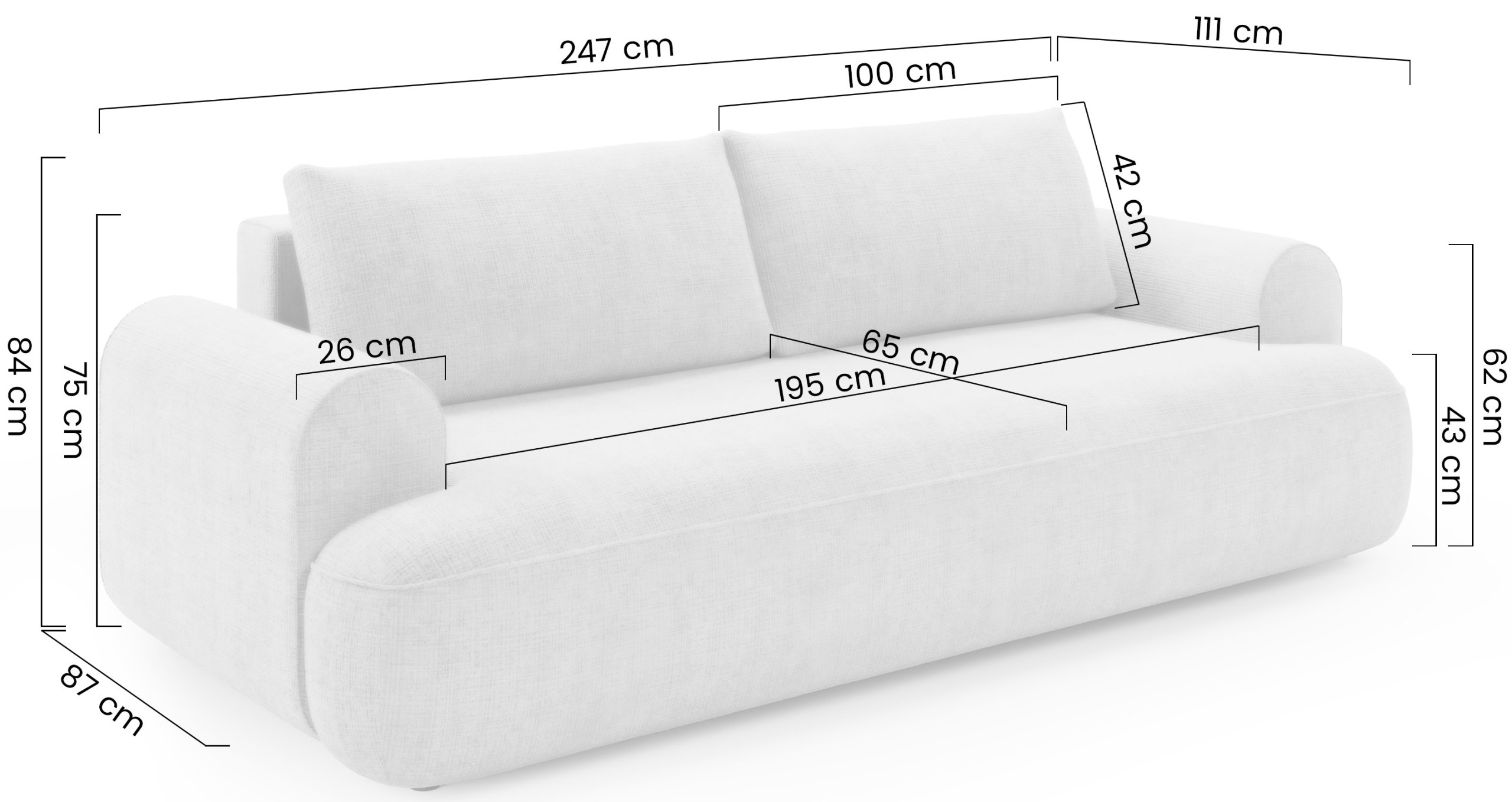 Dimenzije trosjeda iznose 247x111x84 cm, što omogućuje prostrano i udobno sjedenje za više osoba. Kada se razvuče, pretvara se u ležaj s korisnom površinom 195x154 cm, što nudi dovoljno prostora za ugodan odmor ili noćno spavanje. Visina sjedala je 43 cm, što je optimalna visina za udobno ustajanje i sjedenje. Plastične noge visine 3 cm osiguravaju stabilnost i olakšavaju čišćenje poda ispod kauča.