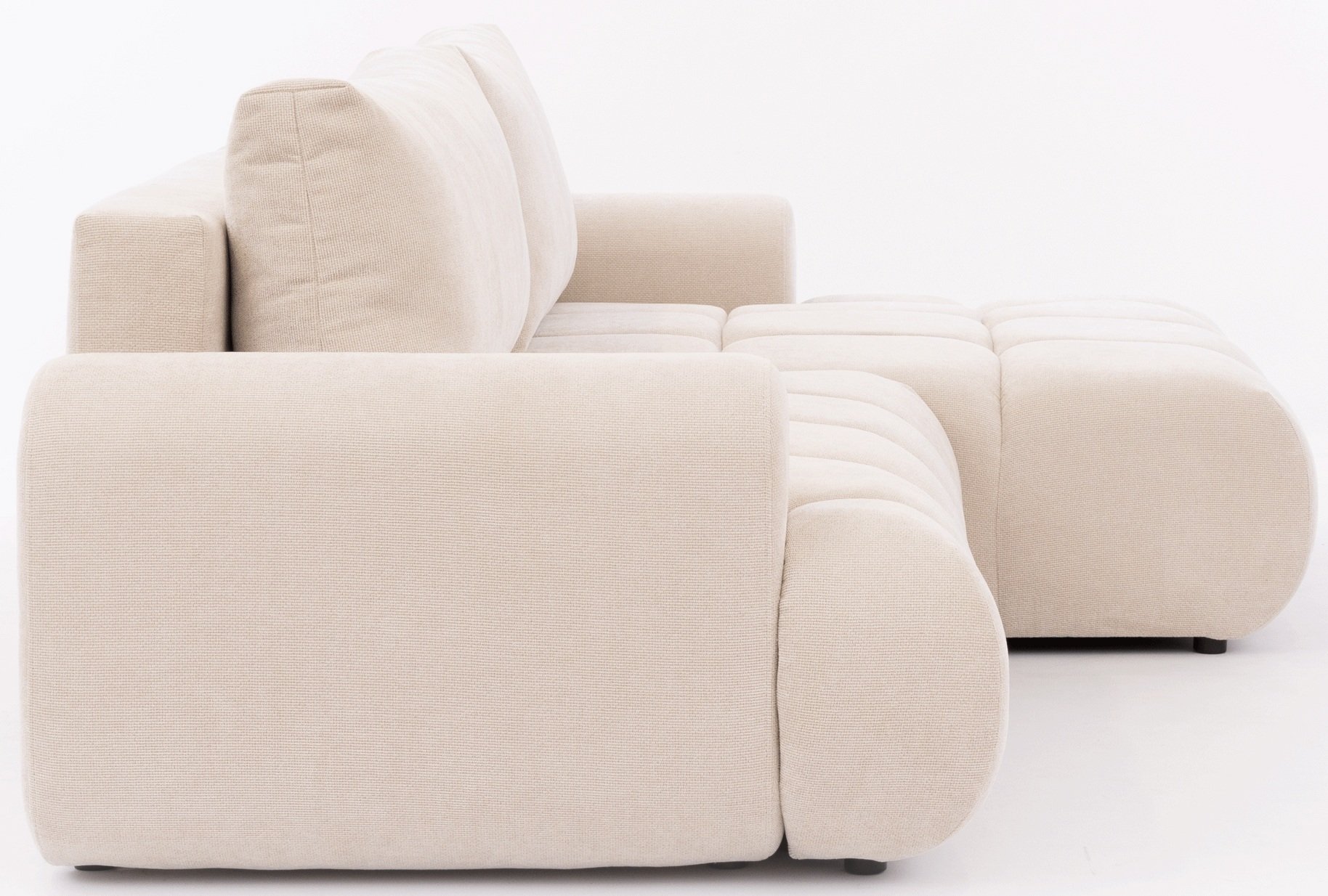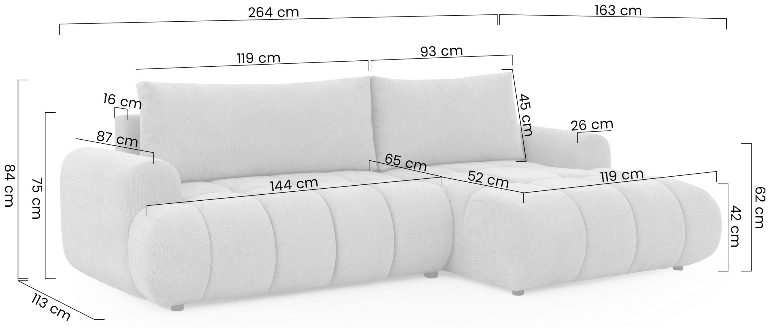 Kutna garnitura Lutario Mini spaja funkcionalnost, jednostavnost i estetsku savršenost suvremenog namještaja. S dimenzijama 264x163x84 cm nudi dovoljno prostora za udobno sjedenje, opuštanje ili druženje s prijateljima. Zbog svog kompaktnog oblika idealan je izbor za manje dnevne sobe, gdje želite zadržati osjećaj otvorenosti i prostranosti, a istovremeno ne pristajati na kompromise u udobnosti.