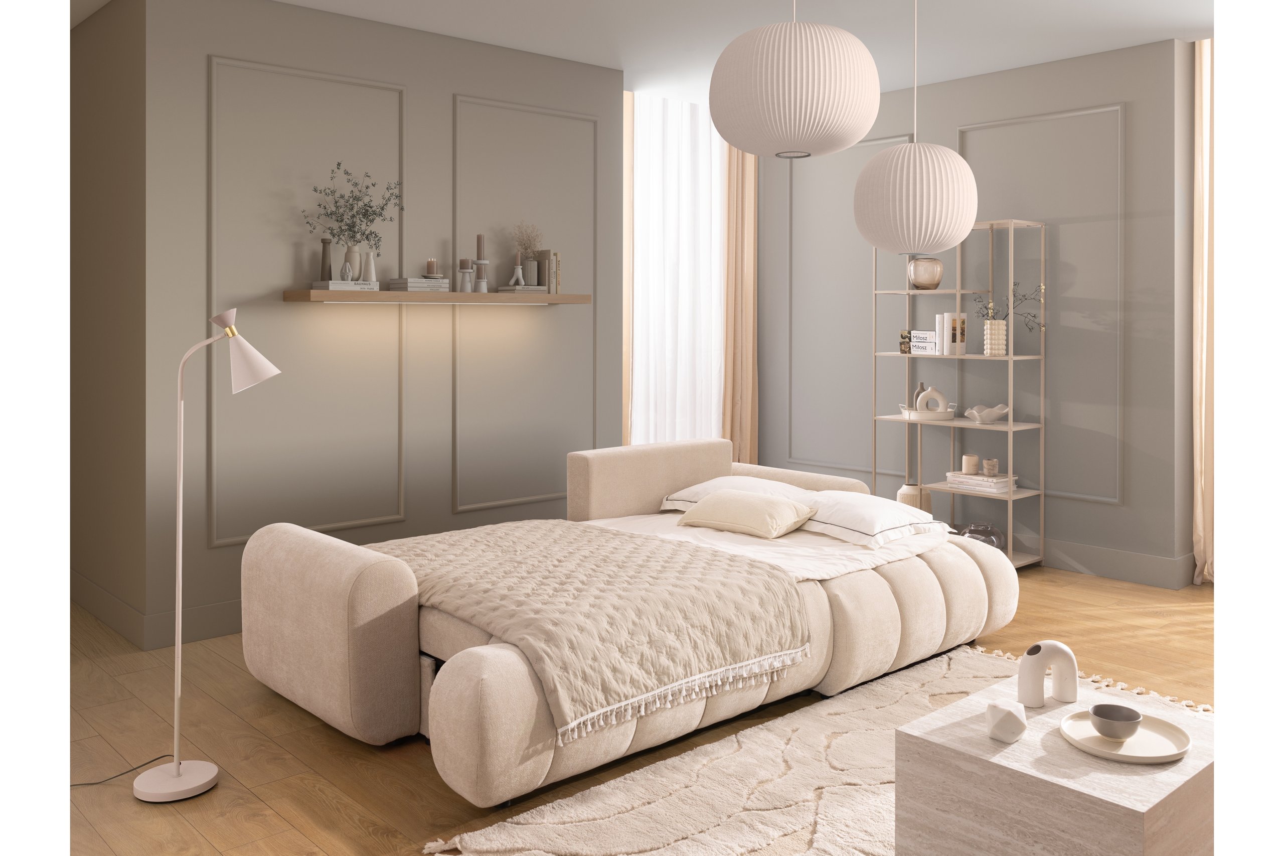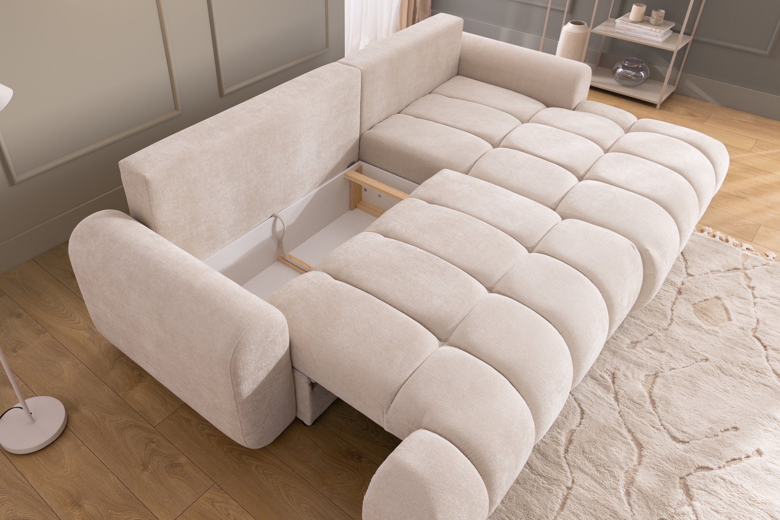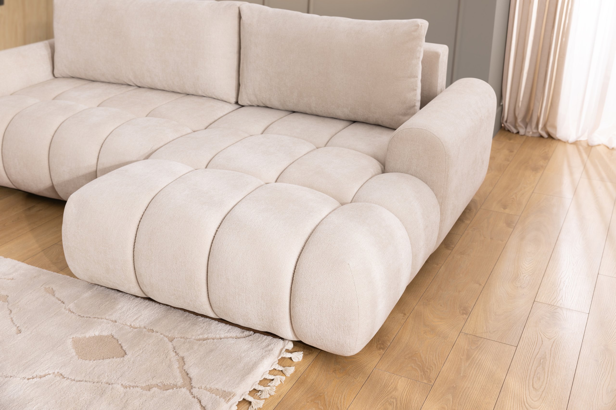 Jedna od ključnih prednosti garniture Lutario Mini je ugrađeni Euro mehanizam, koji omogućuje brzo i jednostavno razvlačenje. U nekoliko trenutaka kutna garnitura pretvara se u udoban ležaj dimenzija 213x141 cm. Ova funkcionalnost posebno je praktična u manjim stanovima, gdje dnevni boravak preko noći može postati ugodna spavaća soba za goste. Površina za spavanje osigurava dovoljno prostora za dvije osobe, dok širina prostora za spavanje iznosi 140 cm.