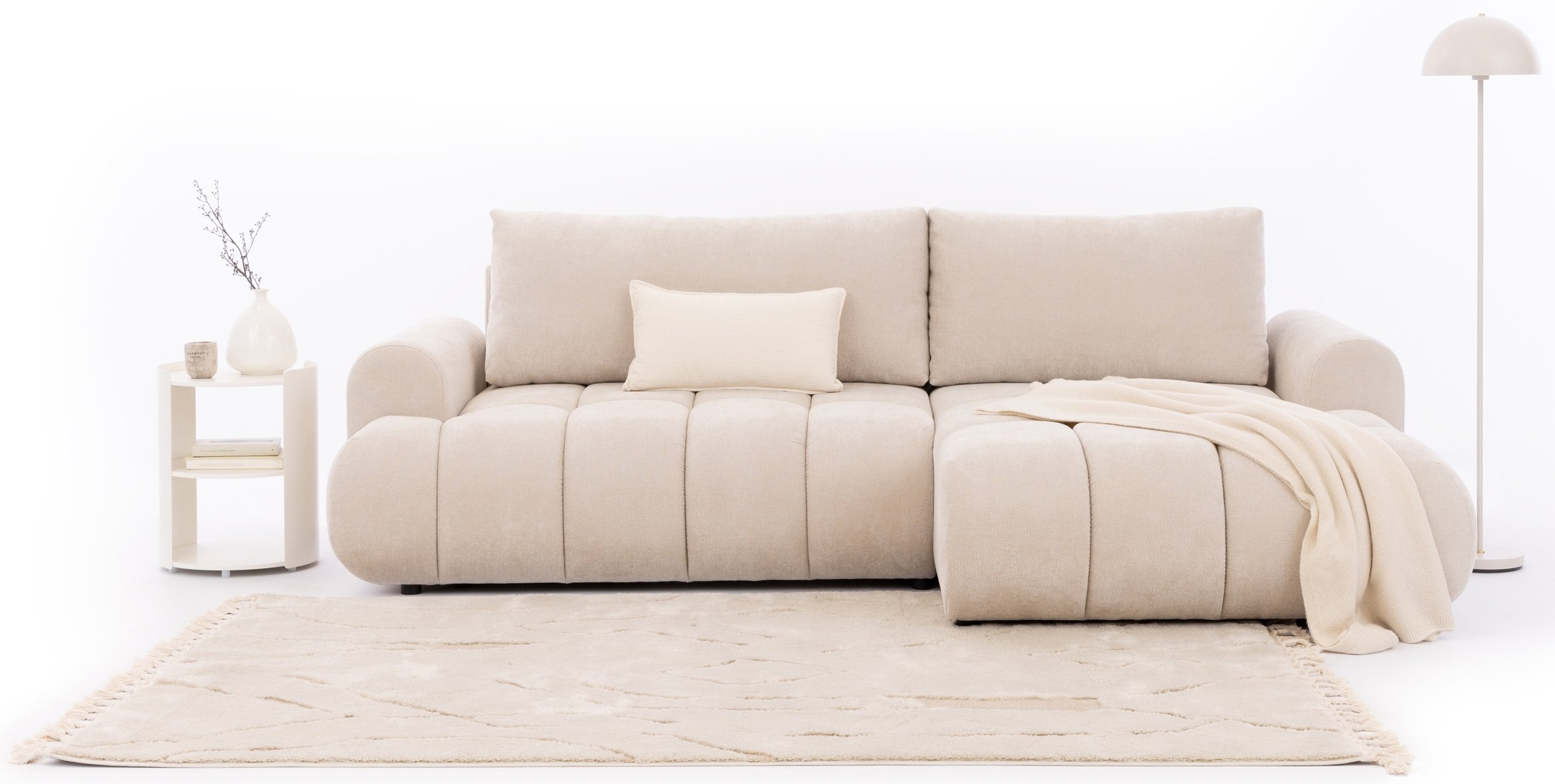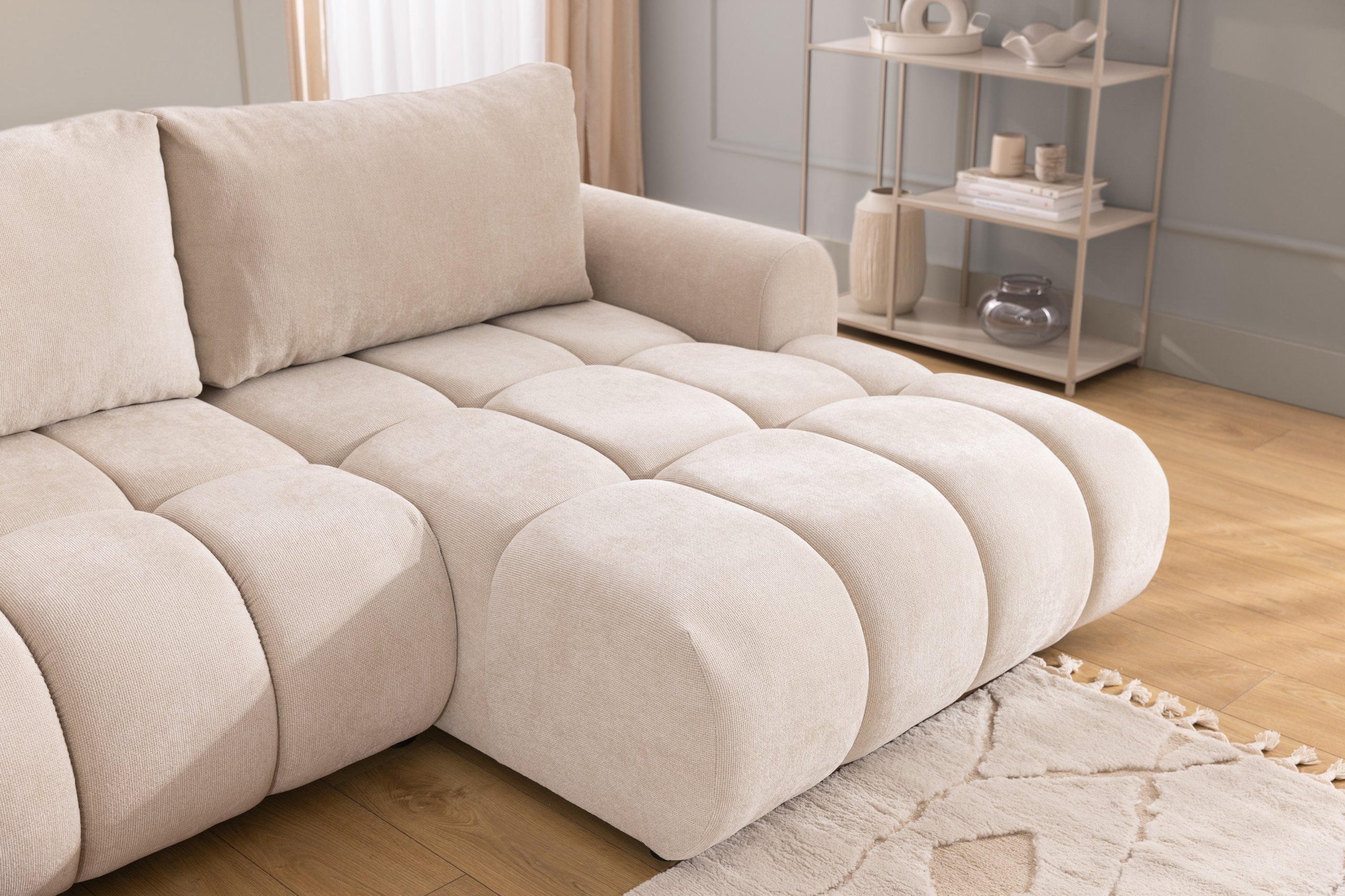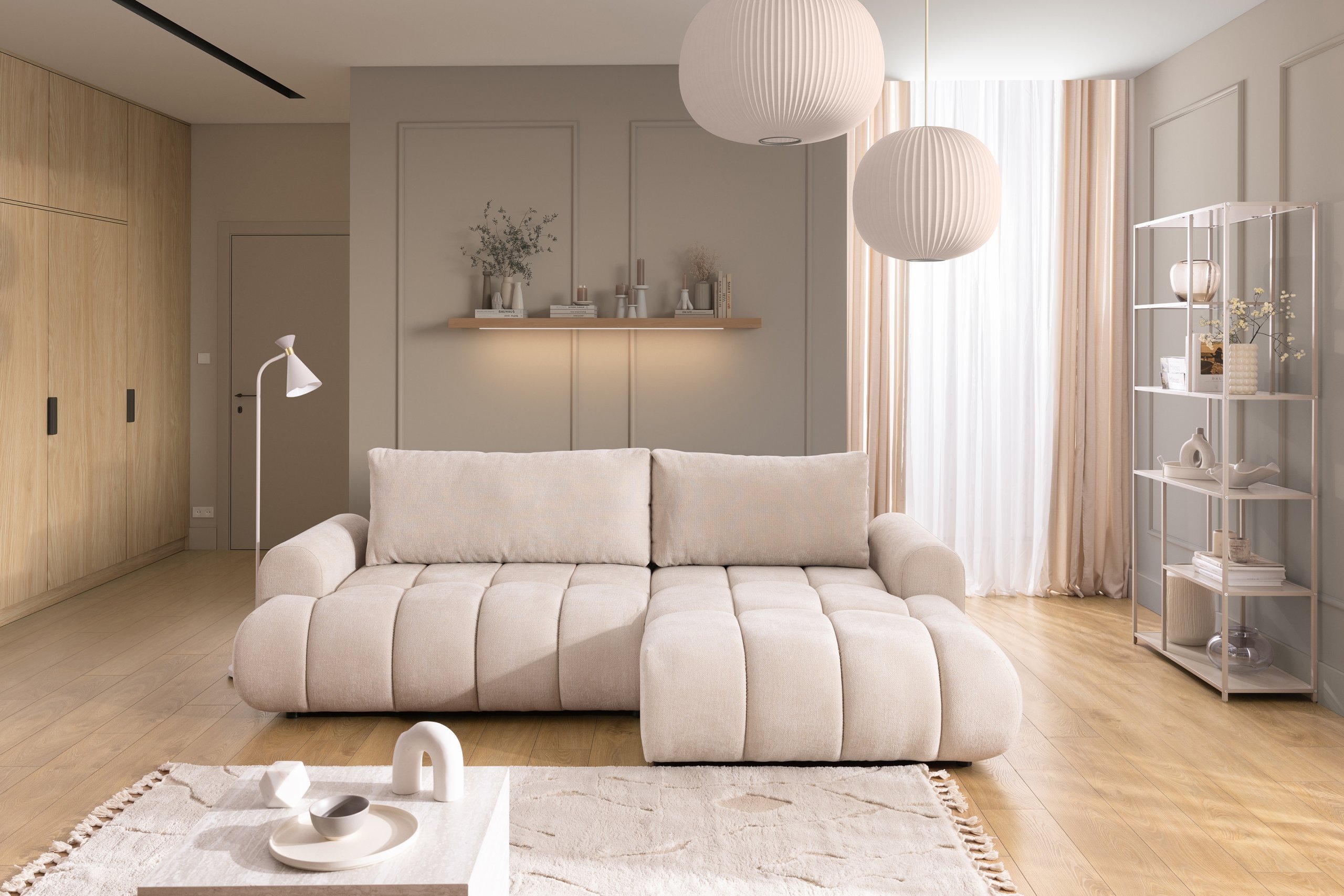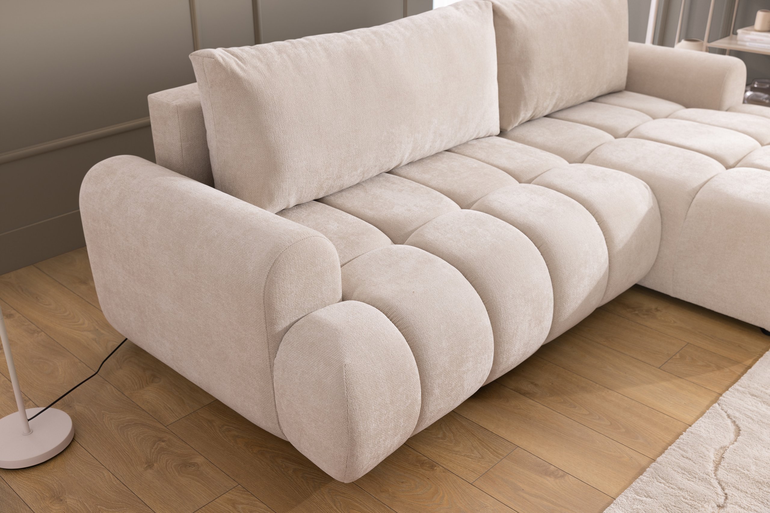Jedna od ključnih prednosti garniture Lutario Mini je ugrađeni Euro mehanizam, koji omogućuje brzo i jednostavno razvlačenje. U nekoliko trenutaka kutna garnitura pretvara se u udoban ležaj dimenzija 213x141 cm. Ova funkcionalnost posebno je praktična u manjim stanovima, gdje dnevni boravak preko noći može postati ugodna spavaća soba za goste. Površina za spavanje osigurava dovoljno prostora za dvije osobe, dok širina prostora za spavanje iznosi 140 cm.