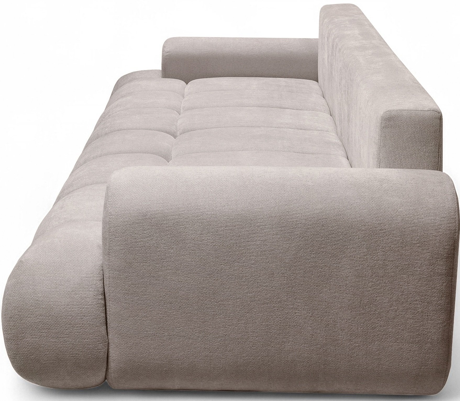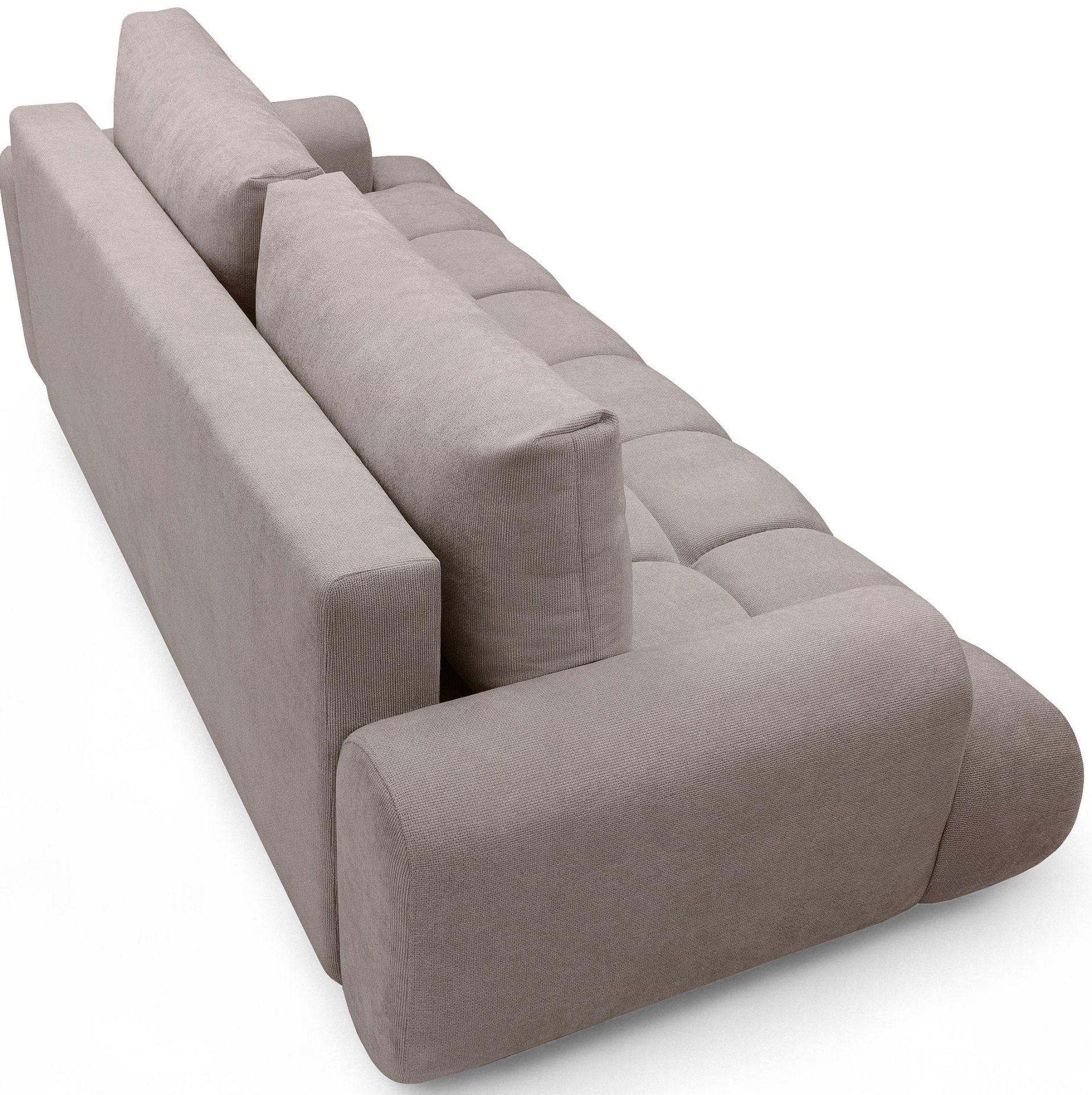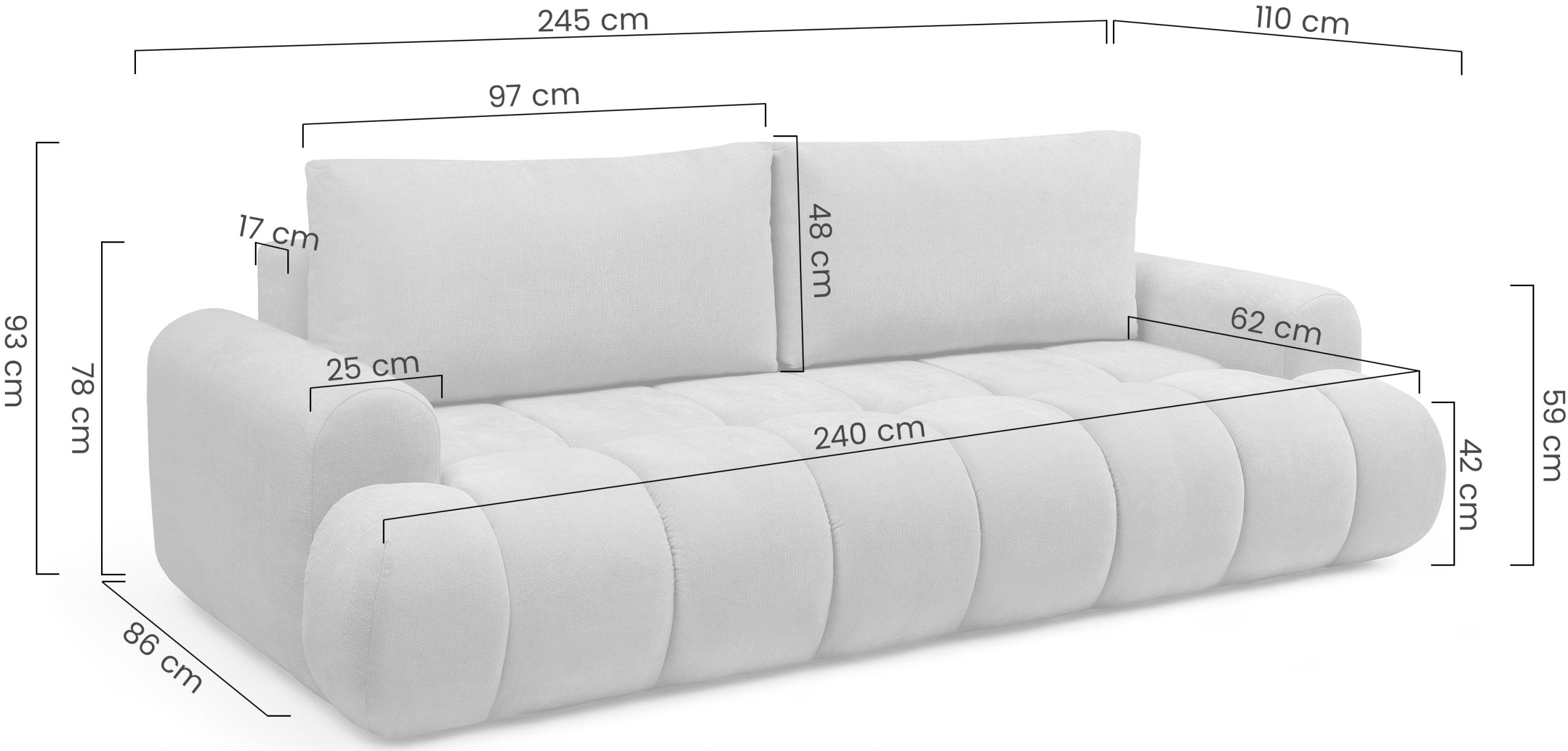 Plastične nogice visine 3 cm diskretne su, ali stabilne, omogućuju jednostavno čišćenje ispod kauča i pridonose suvremenoj estetici. Visina sjedala od 42 cm osigurava udoban položaj pri sjedenju i ustajanju, pa je trosjed prikladan i za starije korisnike.