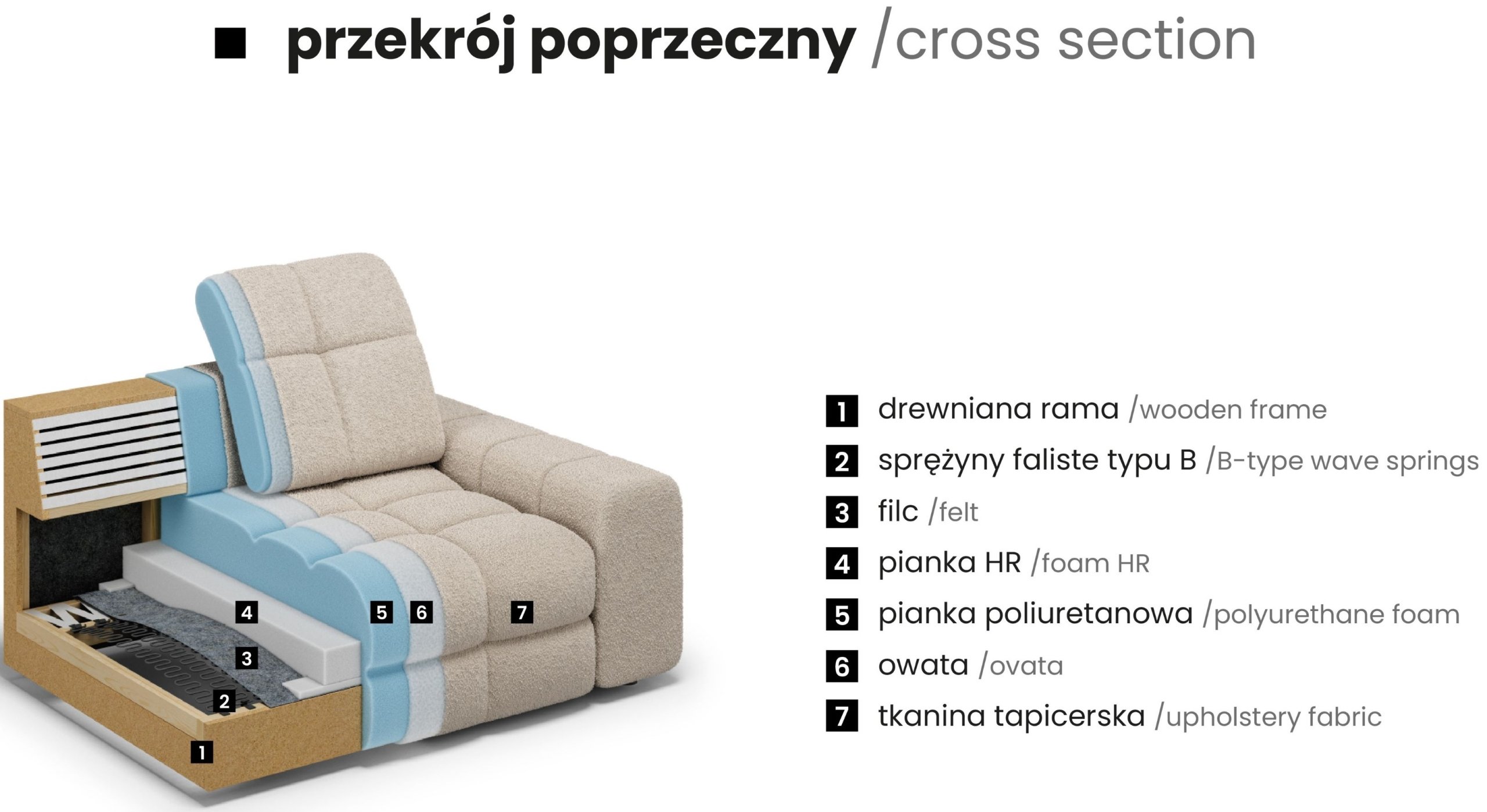 Posebnost modela Magnelio III je kombinacija različitih materijala: drveni okvir pruža čvrstu potporu, valovite opruge (Wave Spring) brinu se za elastičnost, dok pjena T25 i HR visokoelastična pjena osiguravaju optimalnu udobnost sjedenja. Takav sastav stvara ergonomsku potporu koja se prilagođava tijelu i zadržava svoj oblik i nakon dugotrajne upotrebe.