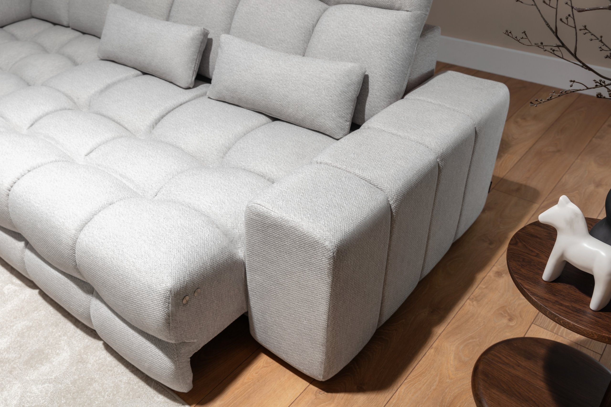 Magnelio Prestige predstavlja kombinaciju suvremene estetike, kvalitetnih materijala i napredne funkcionalnosti. Električno izvlačenje sjedala omogućuje jednostavno prilagođavanje dubine sjedenja, što povećava udobnost. Drvena konstrukcija u kombinaciji s HR pjenom i džepastim oprugama osigurava optimalan omjer mekoće i potpore, zbog čega će ovaj modularni sustav biti dugotrajno i privlačno rješenje za svaki dom. Zahvaljujući mogućnosti modularnog sastavljanja, izvrsno se prilagođava različitim prostornim zahtjevima – od manjih dnevnih boravaka do većih, otvorenih stambenih prostora.
