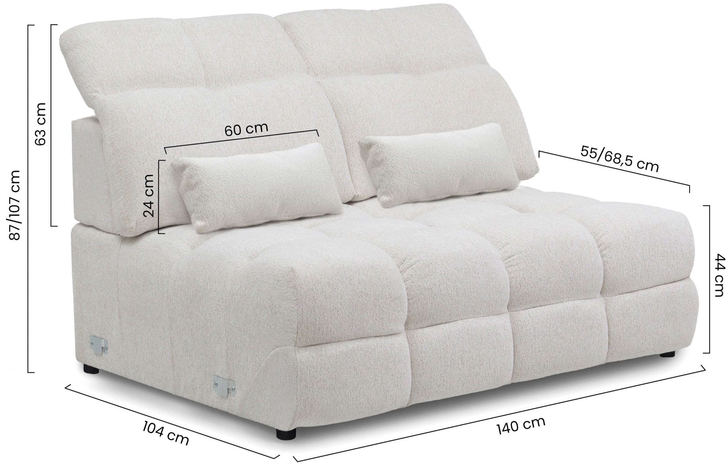 Sustav nema klasični mehanizam za razvlačenje, ali nudi mogućnost električnog izvlačenja sjedala, što značajno povećava udobnost pri sjedenju ili odmoru. Dubina izvučenog sjedala iznosi 94 cm, što omogućuje opušteno i udobno korištenje. Visina sjedala je 44 cm, što odgovara ergonomskim zahtjevima suvremenog sjedenja, a noge su izrađene od plastike visine 3 cm. Najveće dopušteno opterećenje iznosi 150 kg po osobi, što potvrđuje čvrstoću konstrukcije i kvalitetu korištenih materijala.