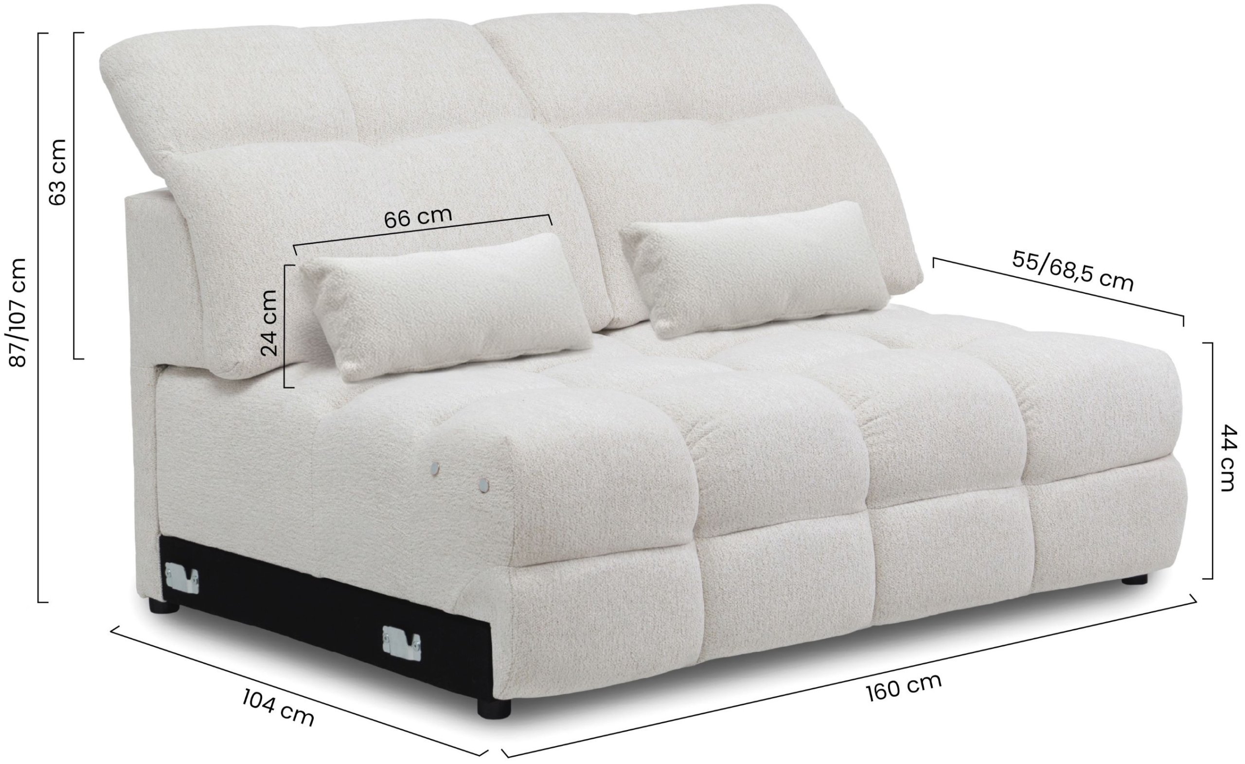 Sustav je bez klasičnog mehanizma za razvlačenje, ali nudi mogućnost električnog izvlačenja sjedala, što znatno povećava udobnost pri sjedenju ili odmoru. Dubina izvučenog sjedala iznosi 94 cm, što omogućuje opuštenu i udobnu upotrebu. Visina sjedala je 44 cm, što odgovara ergonomskim zahtjevima suvremenog sjedenja, a noge su izrađene od plastike visine 3 cm. Najveće dopušteno opterećenje iznosi 150 kg po osobi, što potvrđuje čvrstoću konstrukcije i kvalitetu korištenih materijala.