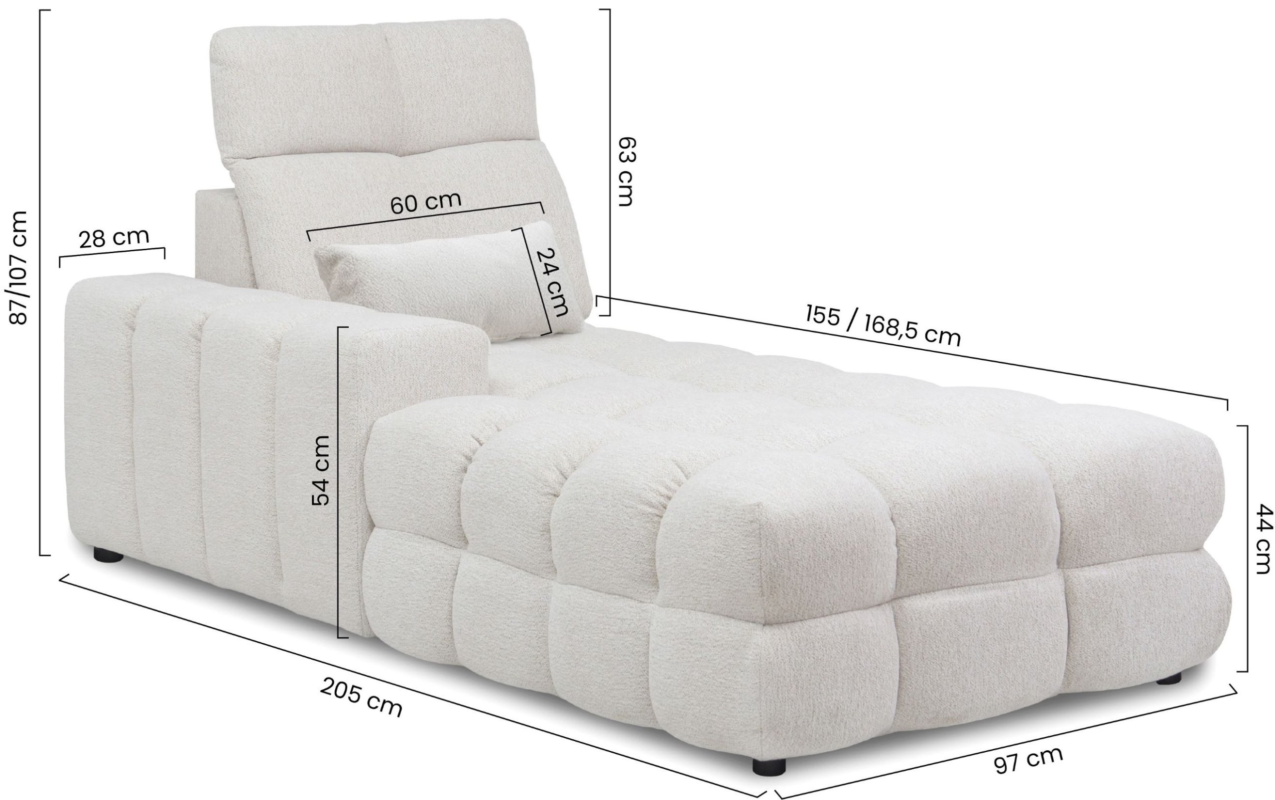 Sustav nema klasični mehanizam za razvlačenje, ali nudi mogućnost električnog izvlačenja sjedala, što značajno povećava udobnost pri sjedenju ili odmoru. Dubina izvučenog sjedala iznosi 94 cm, što omogućuje opušteno i udobno korištenje. Visina sjedala je 44 cm, što odgovara ergonomskim zahtjevima suvremenog sjedenja, a noge su izrađene od plastike visine 3 cm. Najveće dopušteno opterećenje iznosi 150 kg po osobi, što potvrđuje čvrstoću konstrukcije i kvalitetu upotrijebljenih materijala.