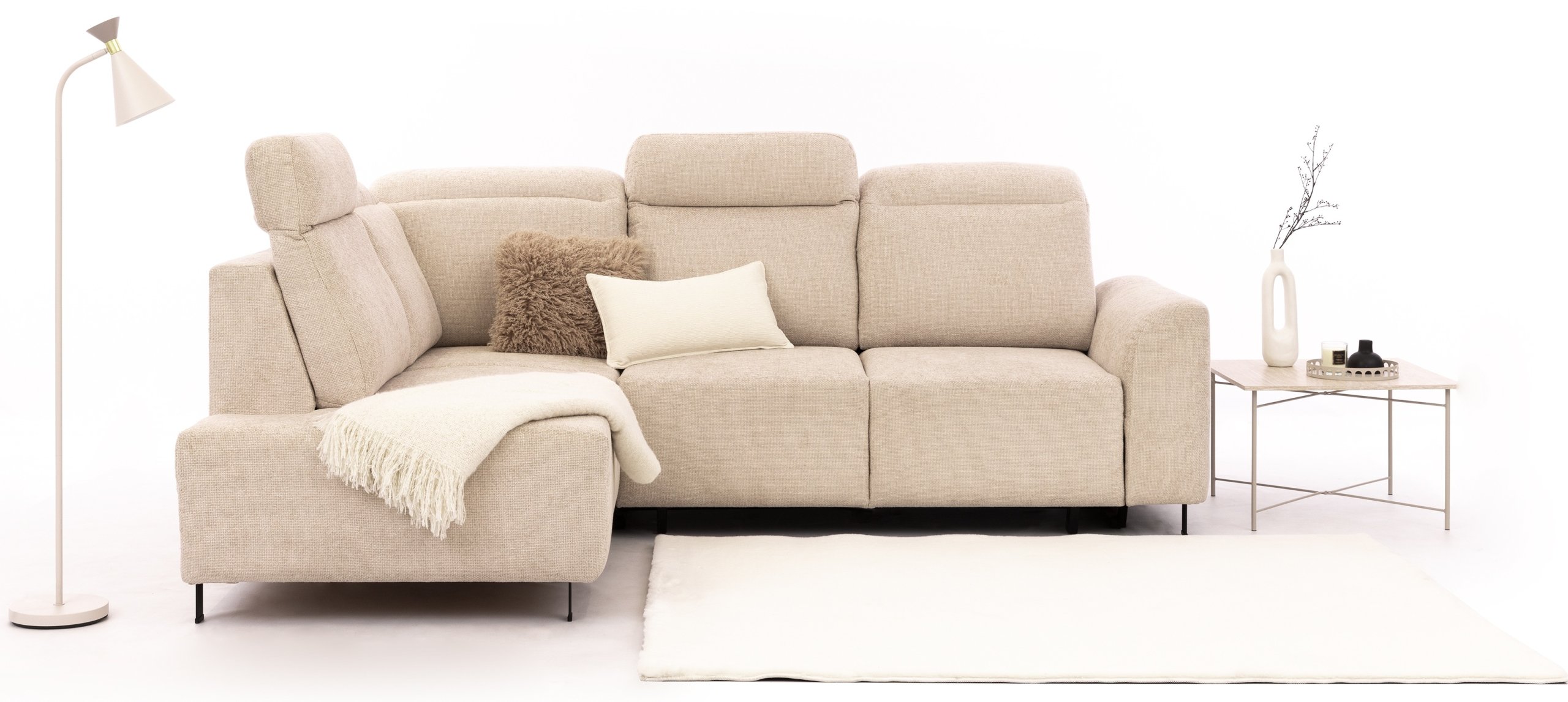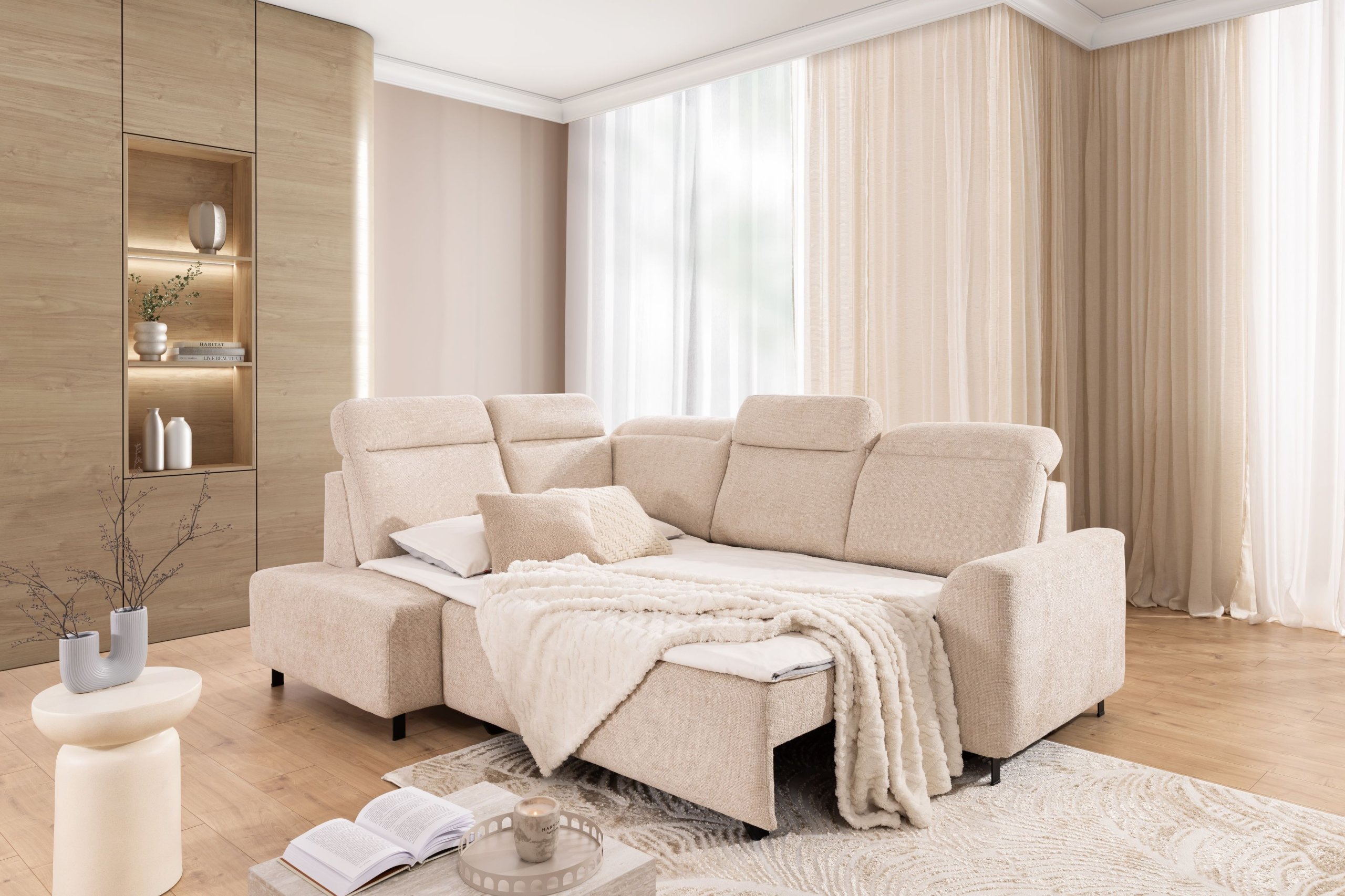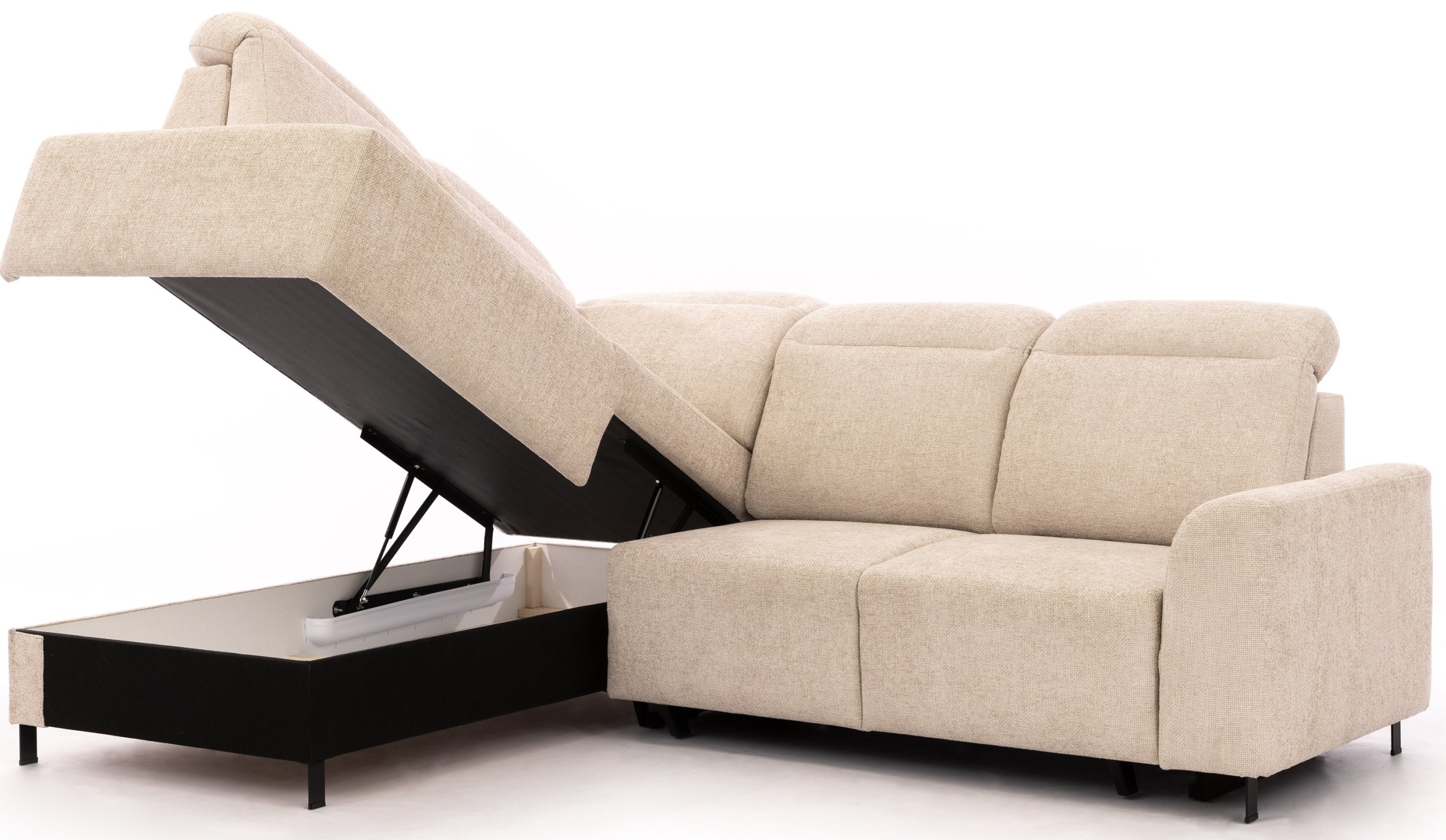 Kombinacija kvalitetnih materijala, precizne izrade i promišljene funkcionalnosti čini kutnu garnituru Magnis idealnim izborom za suvremene domove. Nudi dovoljno prostora za opuštanje, a istovremeno omogućuje brzo pretvaranje u udoban ležaj. Metalni detalji i čiste linije pridonose modernom izgledu, dok robusna konstrukcija od drva i iverice osigurava izdržljivost. Podesivi nasloni za glavu i prostrana ladica za pohranu predstavljaju dodatnu prednost za svakodnevnu upotrebu.
