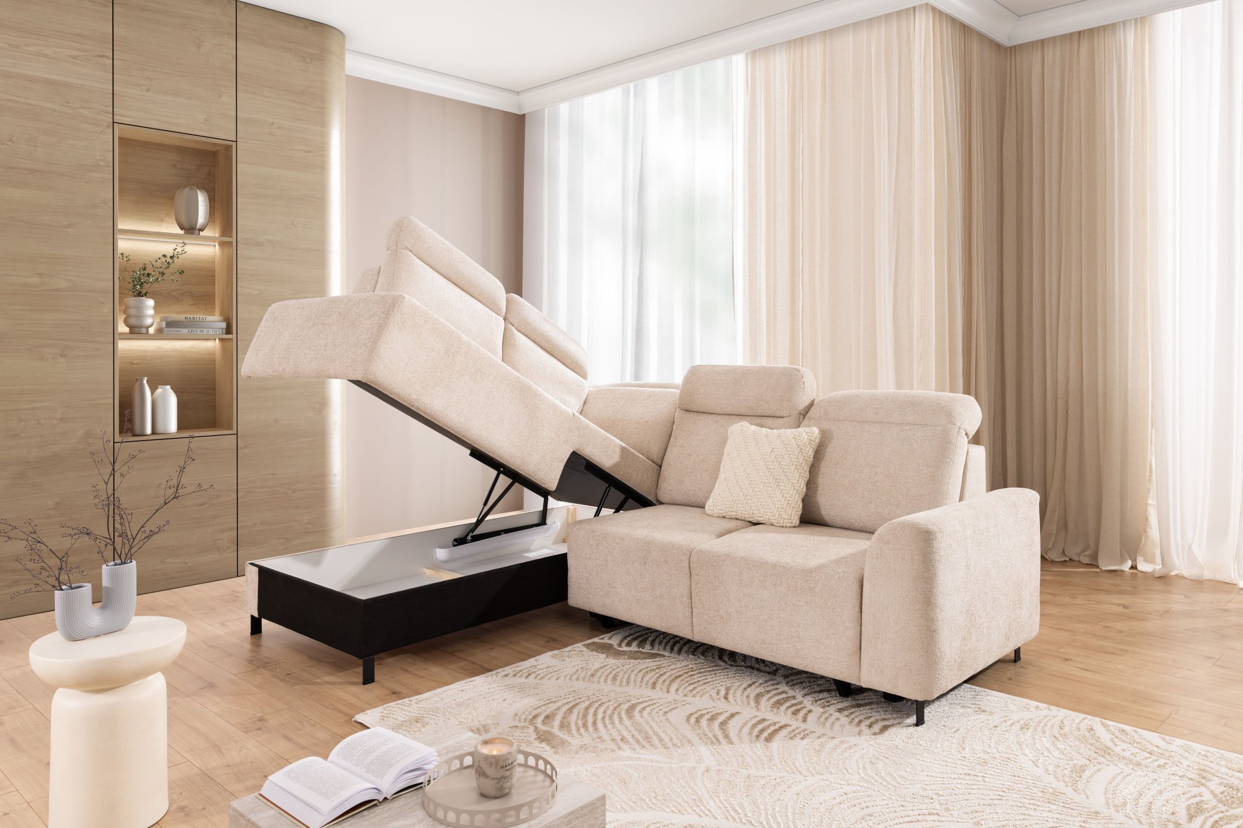 Magnis nije samo estetski privlačan komad namještaja, već i izuzetno praktičan. Ugrađeni mehanizam Dolphin omogućuje da garnituru brzo pretvorite u dodatni ležaj, što je idealno za goste. Površina ležaja mjeri 194x134 cm, što osigurava dovoljno prostora za udoban odmor. Ispod sjedišta skriva se prostrana ladica za posteljinu, koja omogućuje pohranu deka, jastuka ili plahti te tako pomaže održavati red u prostoru.