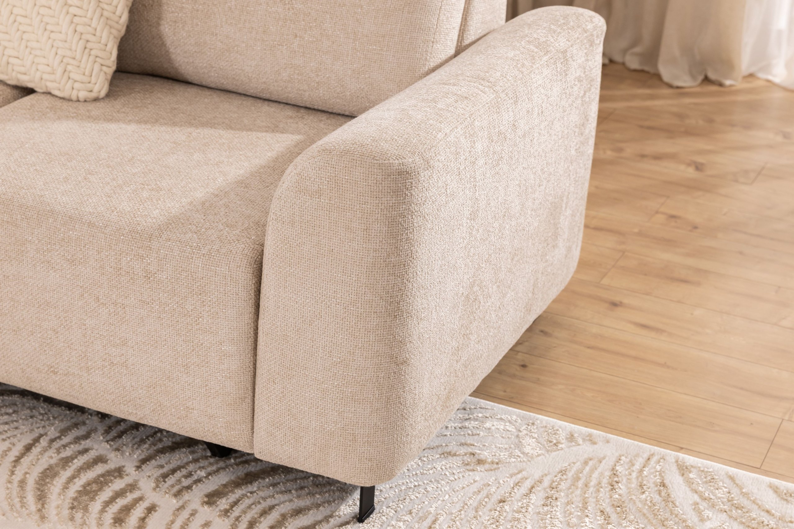 Okvir garniture izrađen je od kombinacije drva i iverice, što osigurava stabilnost i dug vijek trajanja proizvoda. Sjedište i naslon sastoje se od valovite opruge i poliuretanske pjene, koje zajedno stvaraju udobnu, ali čvrstu potporu pri sjedenju. Površina je presvučena kvalitetnom tkaninom, ugodnom na dodir i jednostavnom za održavanje. Metalne noge u crnoj mat boji upotpunjuju moderan izgled i pridonose stabilnosti garniture.