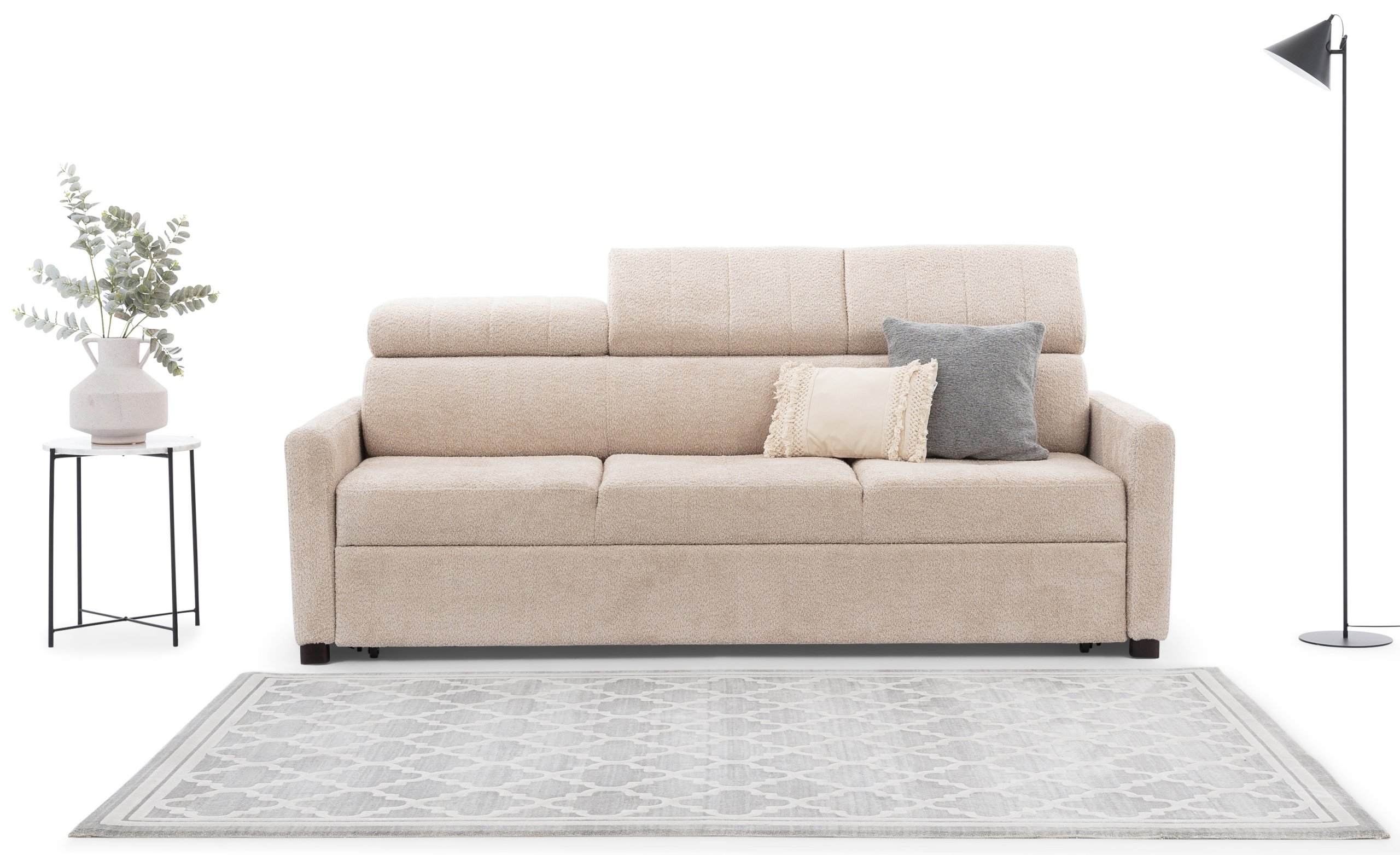 Trosjed Taremo oblikovan je u modernom stilu, koji odgovara različitim unutarnjim ambijentima – od minimalističkih do klasično uređenih dnevnih soba. Dostupan je u više boja, što omogućuje jednostavno usklađivanje s postojećom opremom. Tekstilna presvlaka je ugodna na dodir, otporna na habanje i jednostavna za održavanje, pa će trosjed zadržati svjež izgled i nakon dugotrajne uporabe.
