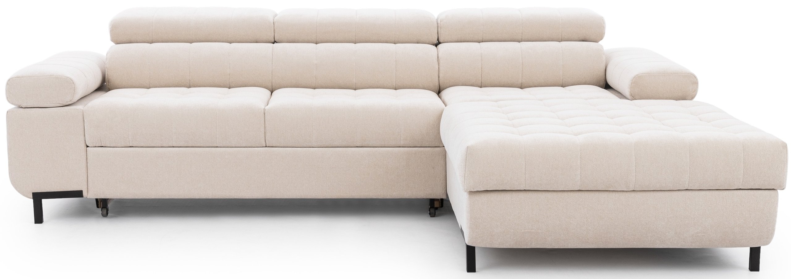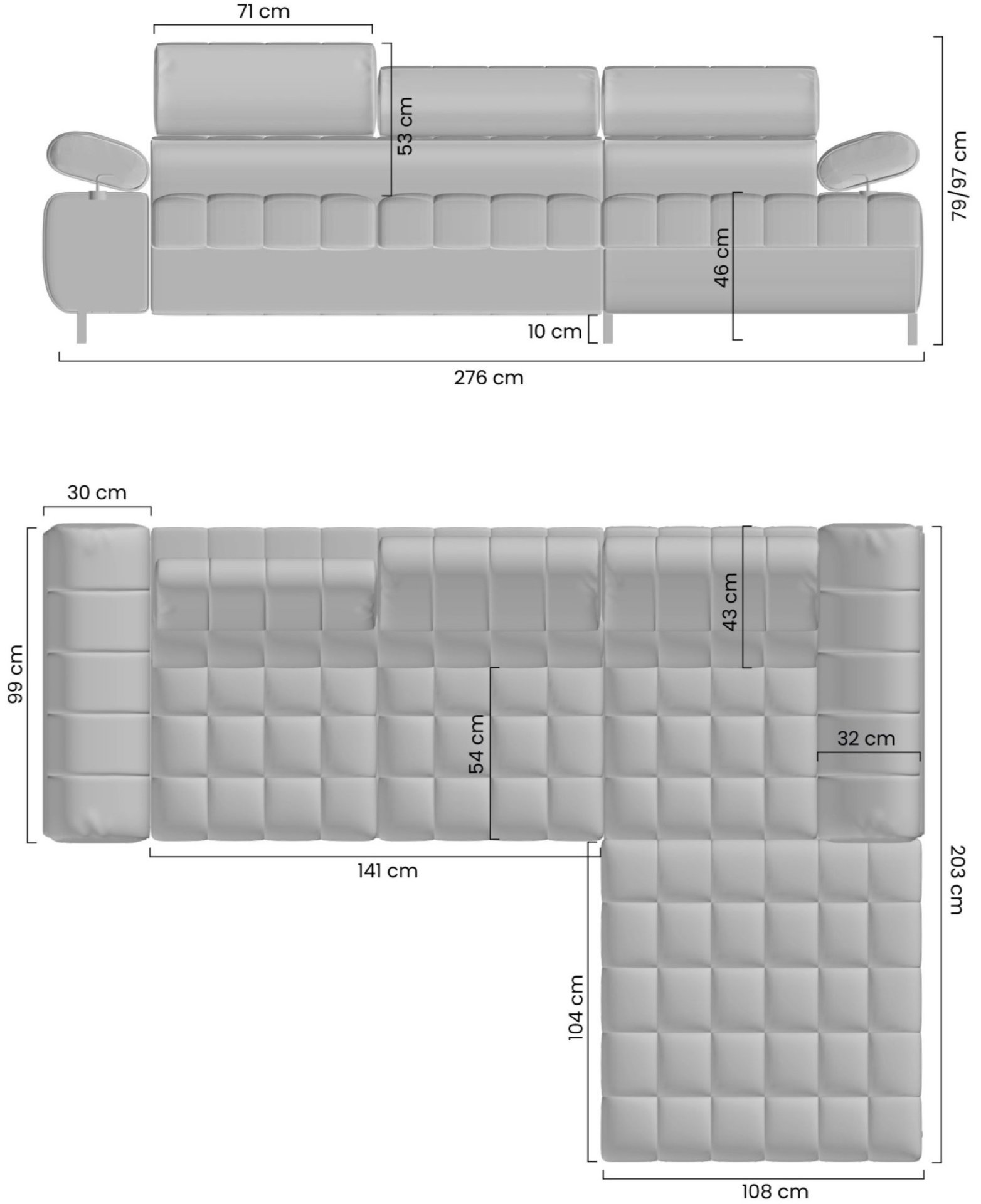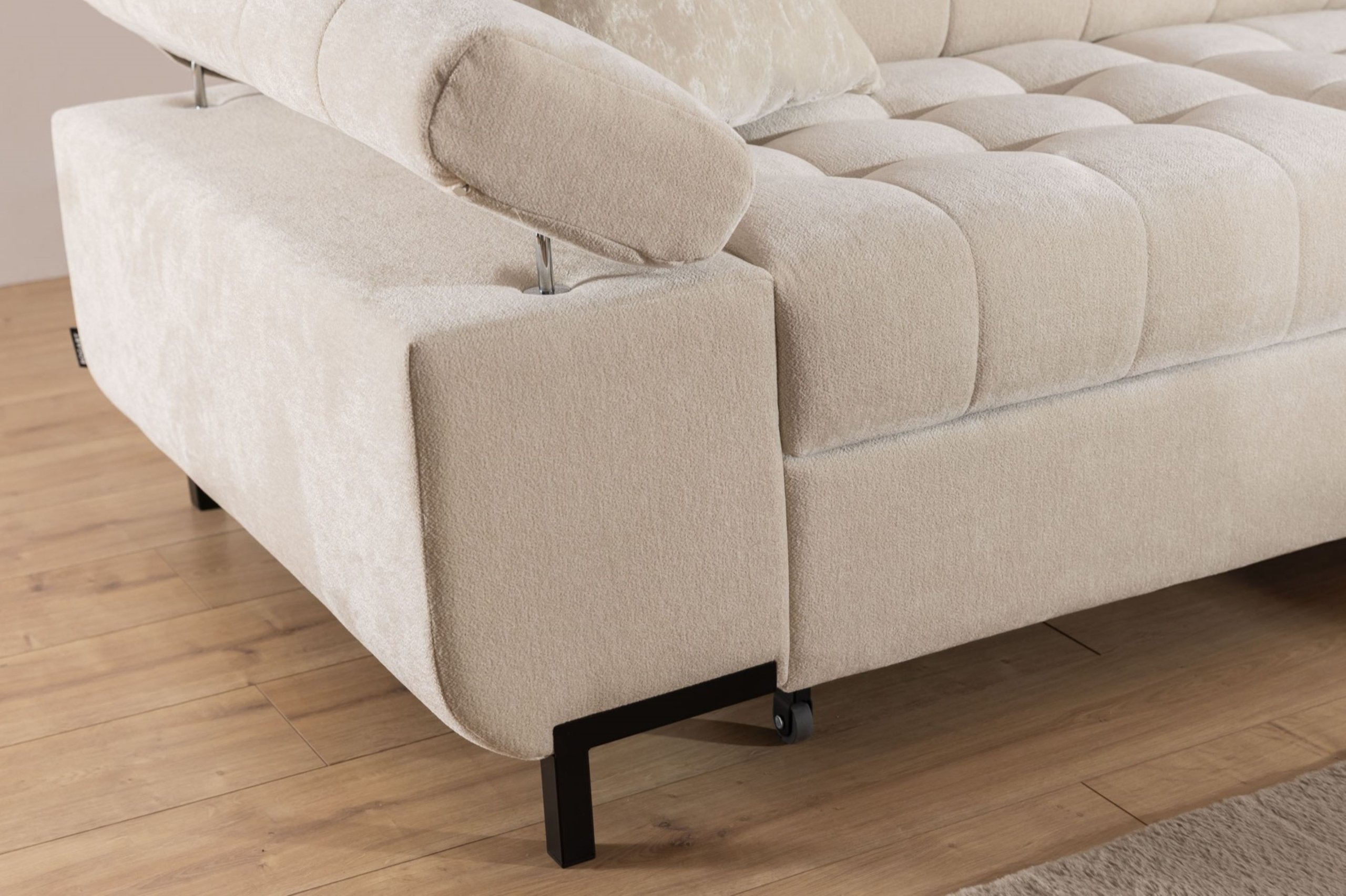 Posebnost modela Tyrion L II su podesivi nasloni za glavu, koji omogućuju prilagodbu nagiba prema željama korisnika. Visina sjedala iznosi 46 cm, što osigurava ugodnu ergonomiju pri sjedenju. Najveće dopušteno opterećenje iznosi 150 kg po sjedalu, što svjedoči o čvrstoj izradi i pouzdanoj konstrukciji. Ispod sjedećeg dijela nalazi se i prostrana ladica za posteljinu, u koju možete spremiti deke, jastuke ili dodatne navlake – praktično rješenje koje dodatno povećava uporabnost garniture.