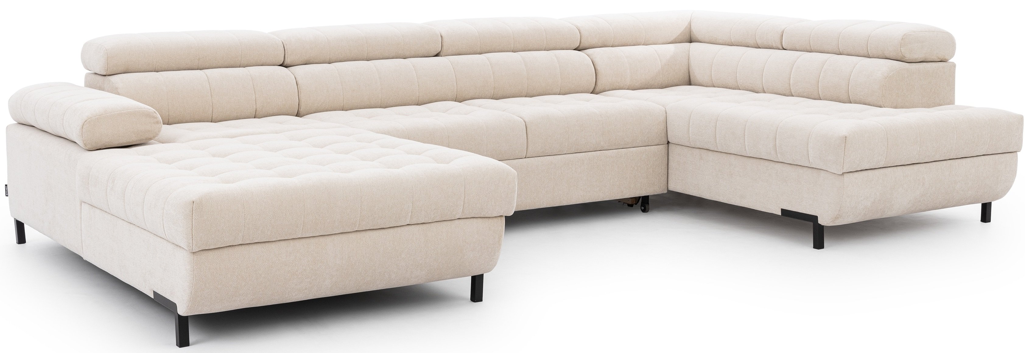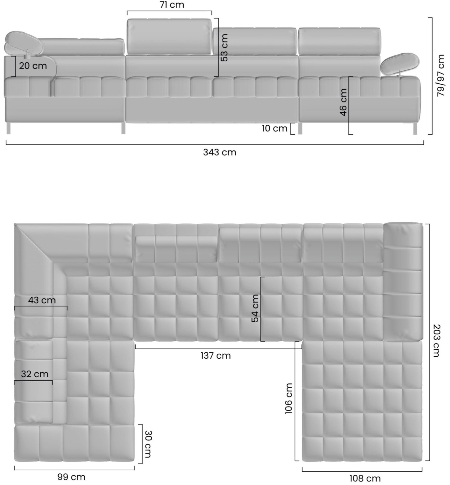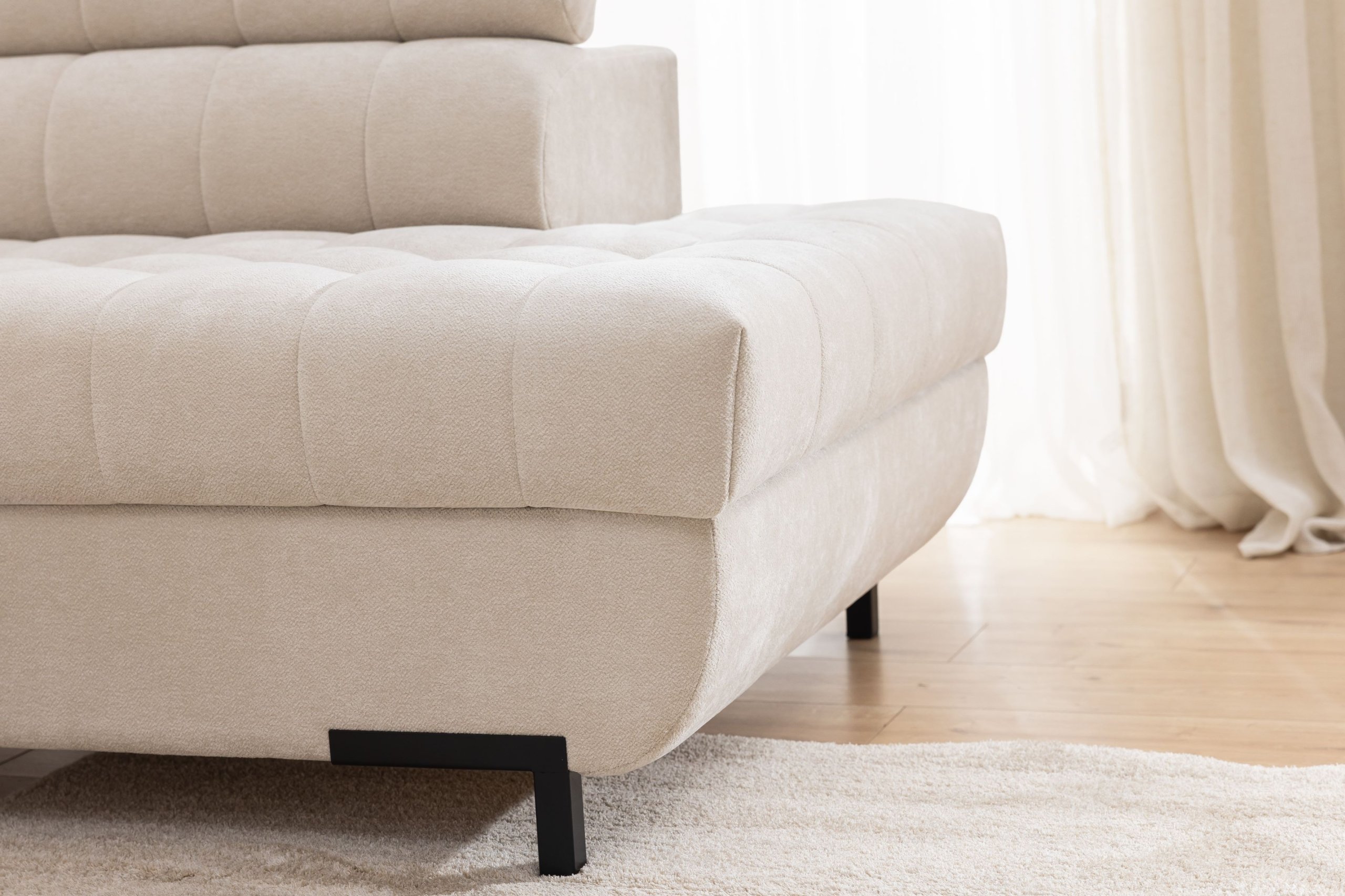 Kutna garnitura Tyrion II može se pohvaliti elegantnim metalnim nogama u crnoj boji, visine 10 cm, koje pridonose modernom izgledu i omogućuju jednostavno čišćenje poda ispod garniture. Visina sjedala iznosi 46 cm, što osigurava udobno sjedenje i nižim i višim korisnicima. Podesivi nasloni za glavu i nasloni za ruke omogućuju individualno podešavanje položaja sjedenja, što dodatno povećava udobnost pri gledanju televizije, čitanju ili opuštanju nakon napornog dana.
