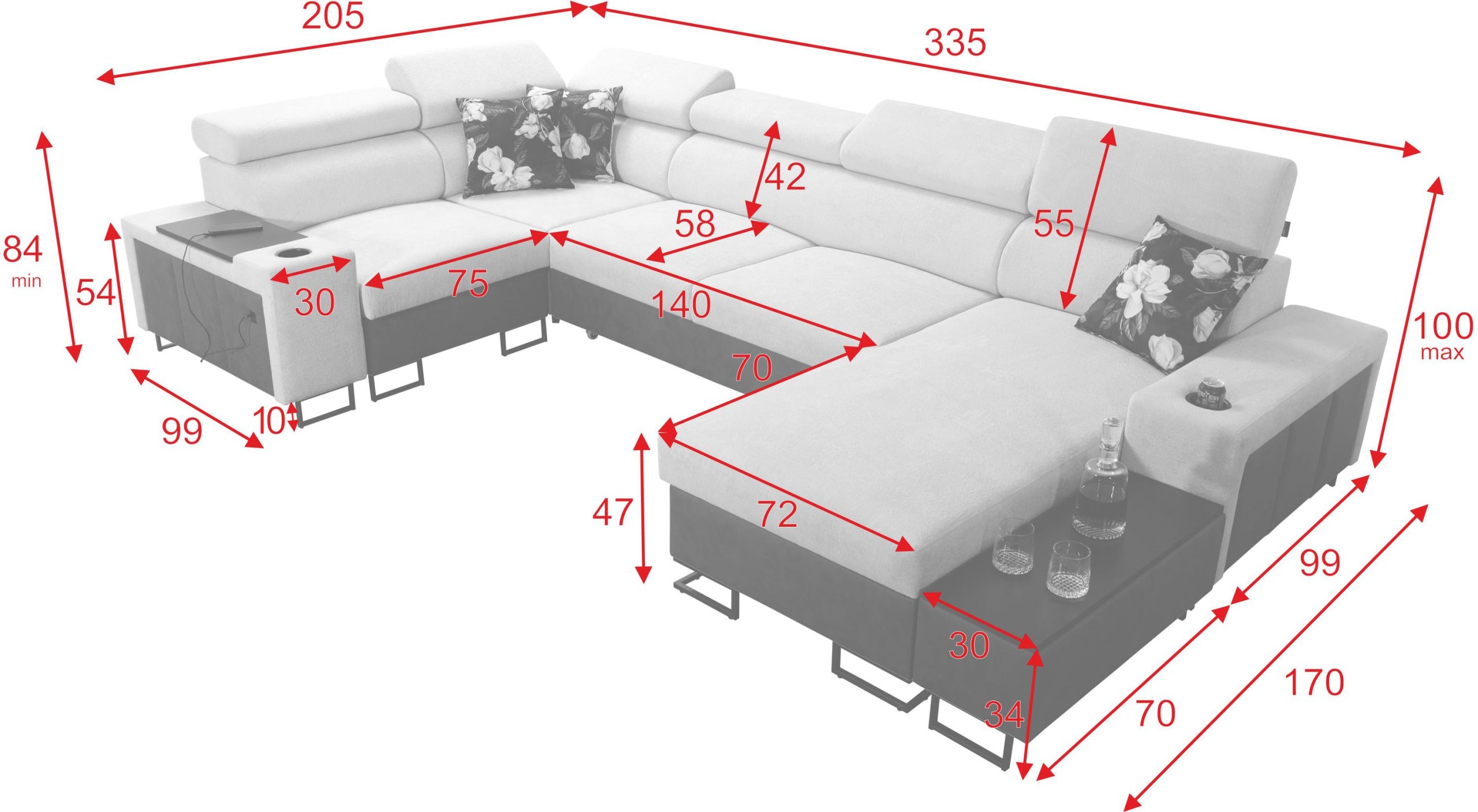 Garnitura je opremljena s šest podesivih naslona za glavu, koji omogućuju potpunu prilagodbu položaja glave i vrata. Visina sjedišta 47 cm osigurava udoban položaj sjedenja, dok kvalitetno punjenje od učvršćene pjene T-30 i valovite opruge pruža izvrsnu potporu i elastičnost. Po želji je moguće naručiti i izvedbu s pjenom HR-35, koja nudi veću gustoću te kombinaciju čvrstoće i fleksibilnosti.