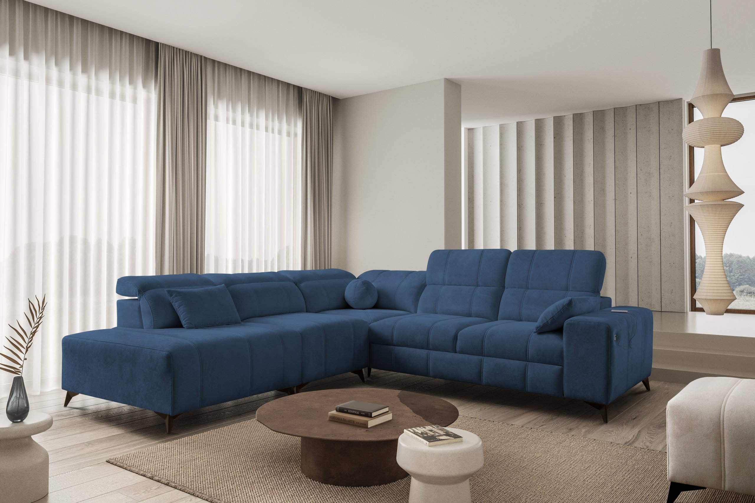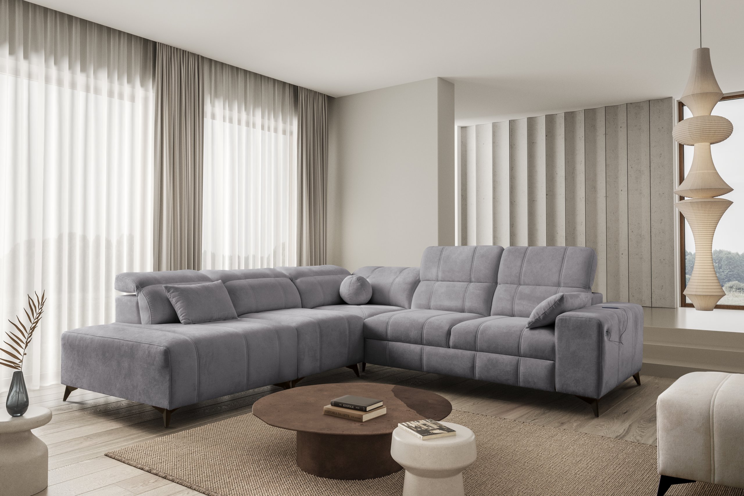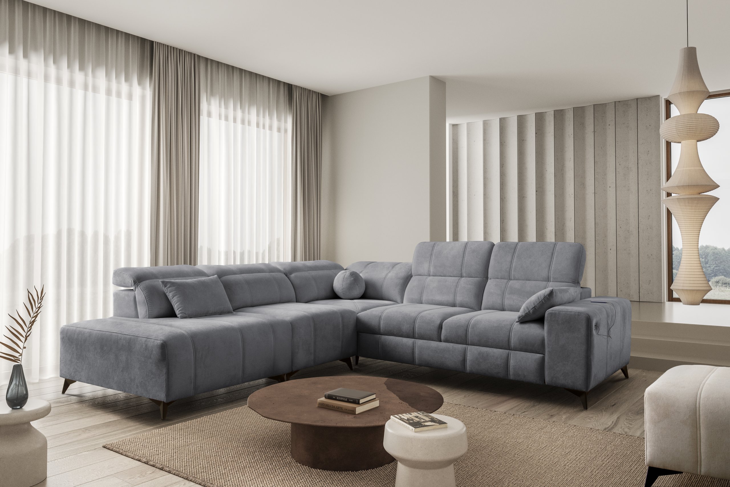 Takav odabir omogućuje potpuno prilagođavanje kutne garniture prema stilu prostora i ostalom namještaju. Bez obzira na odabranu kombinaciju nogica i tkanine, cijeli komad ostaje iznimno stabilan i estetski dovršen.