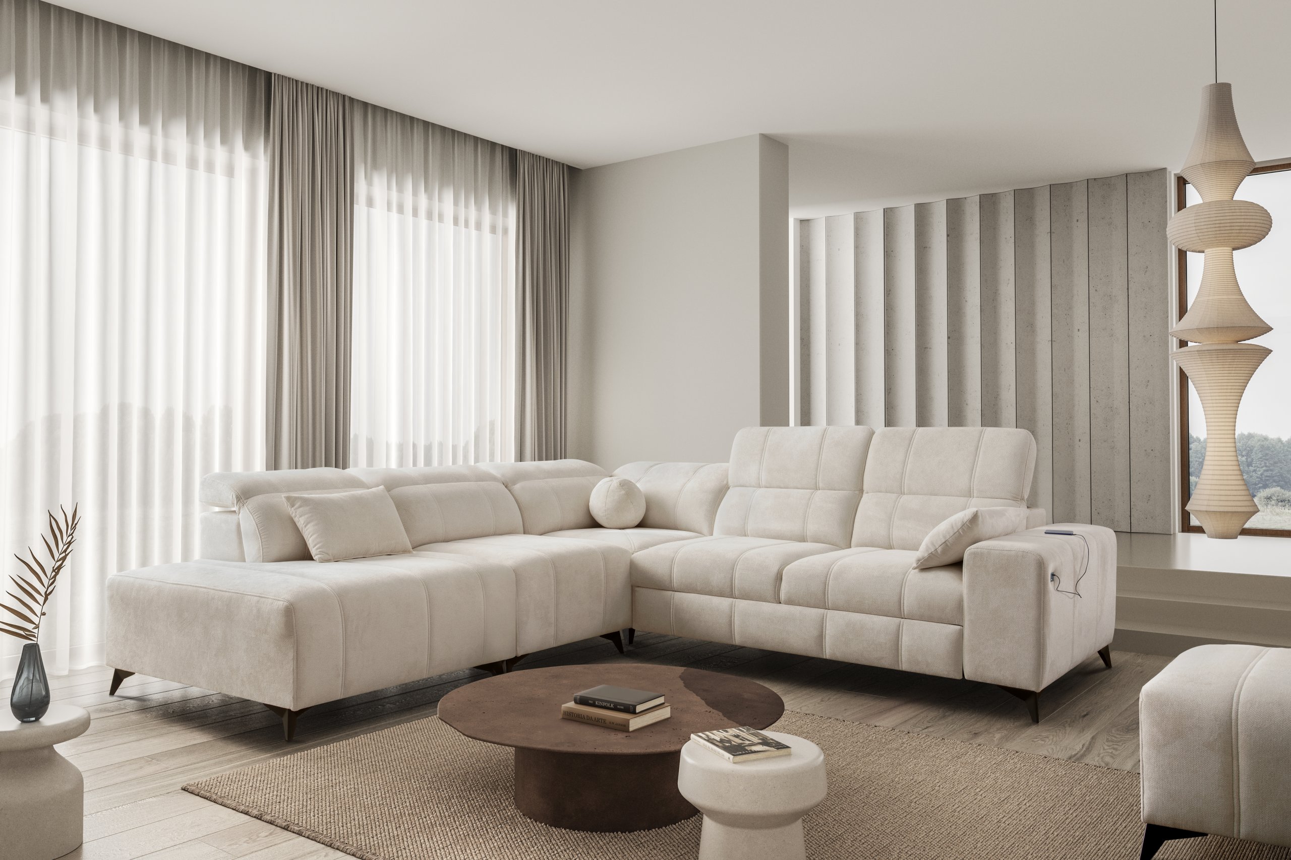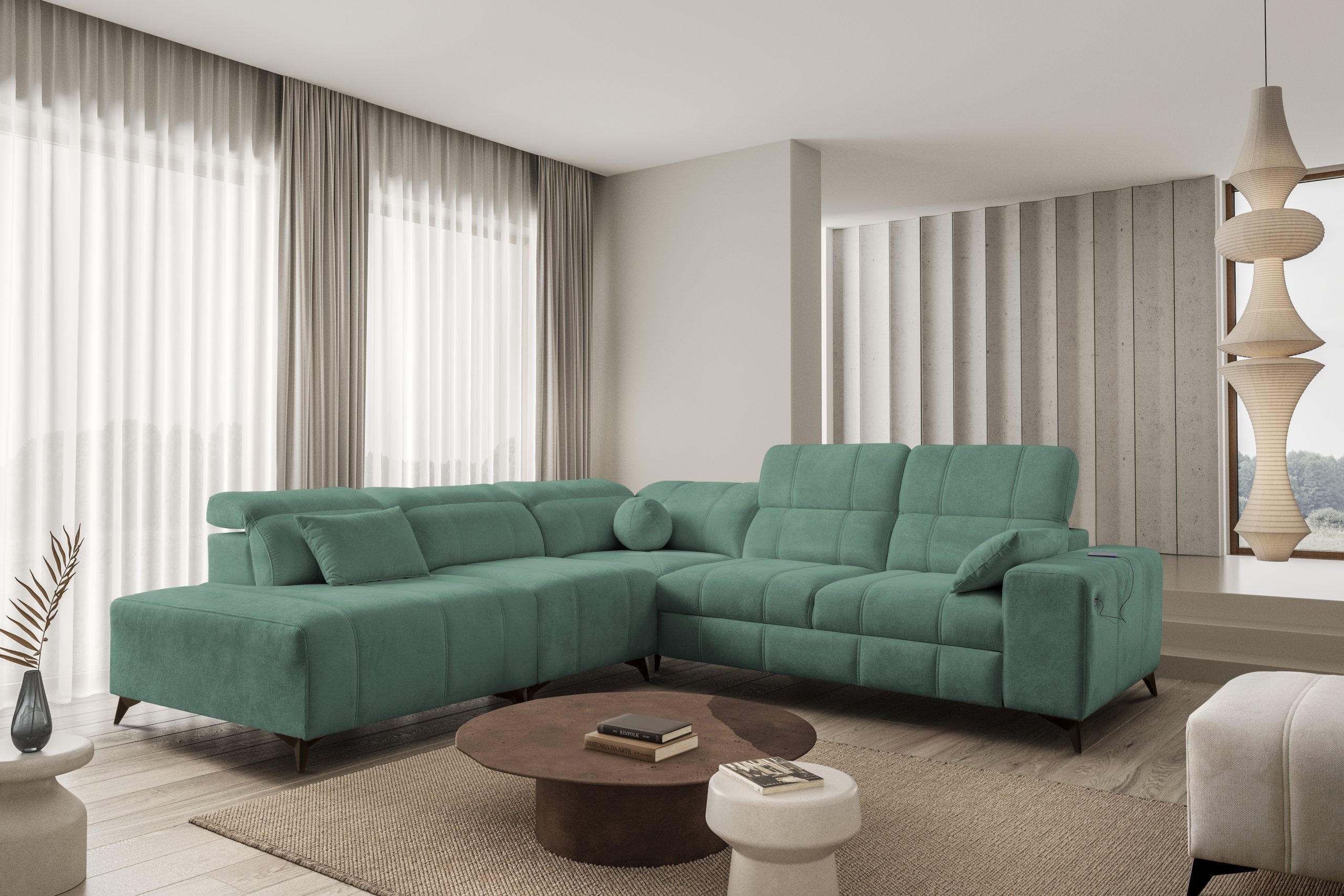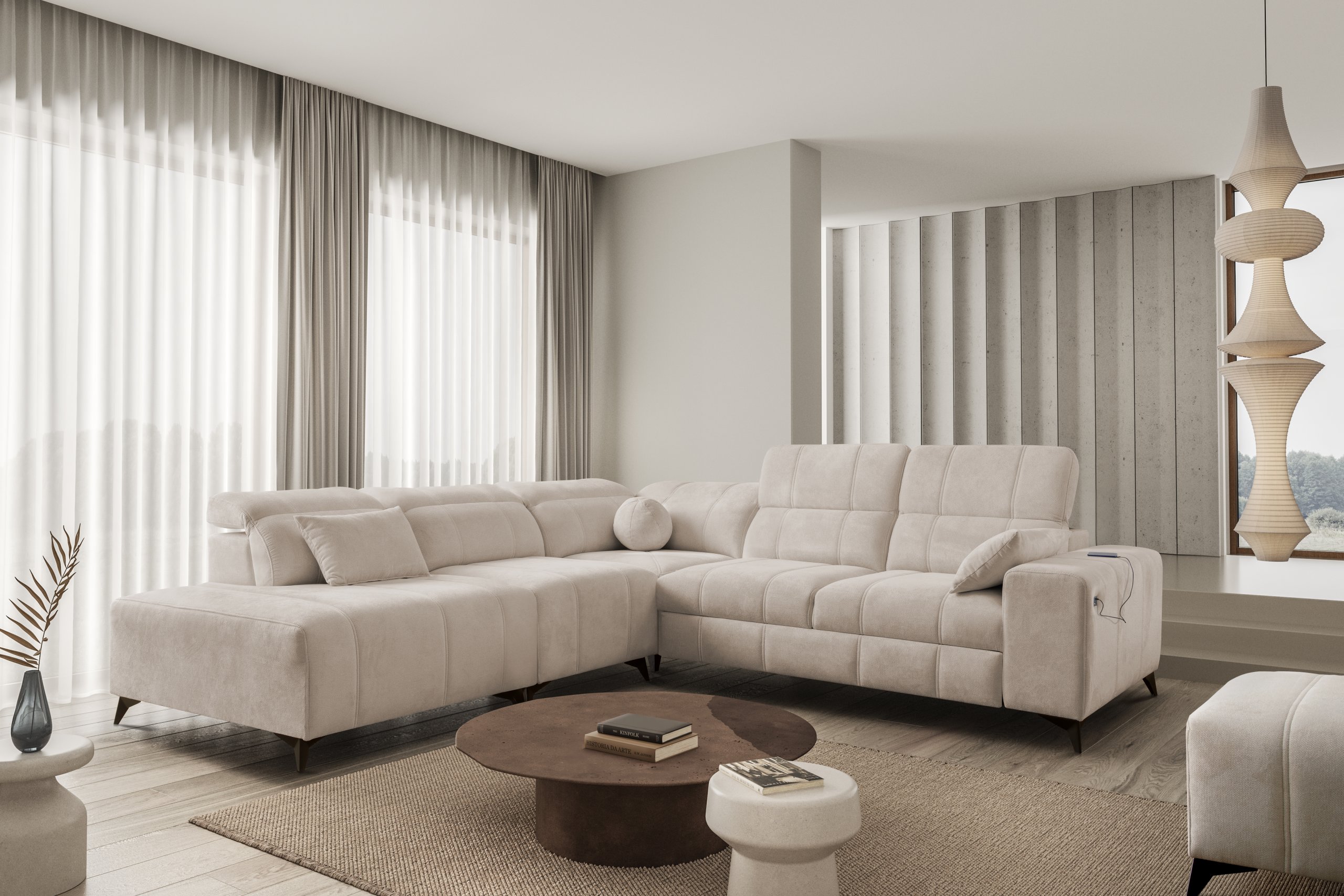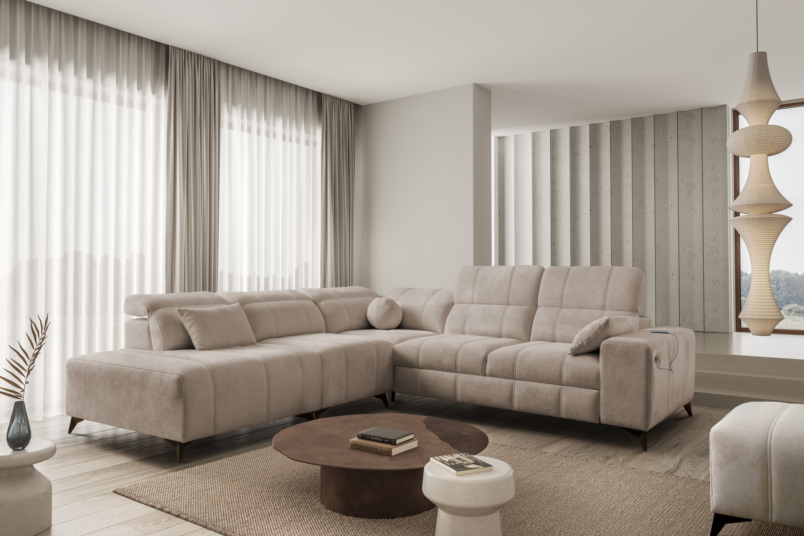 Takav odabir omogućuje potpuno prilagođavanje kutne garniture prema stilu prostora i ostalom namještaju. Bez obzira na odabranu kombinaciju nogica i tkanine, cijeli komad ostaje iznimno stabilan i estetski dovršen.