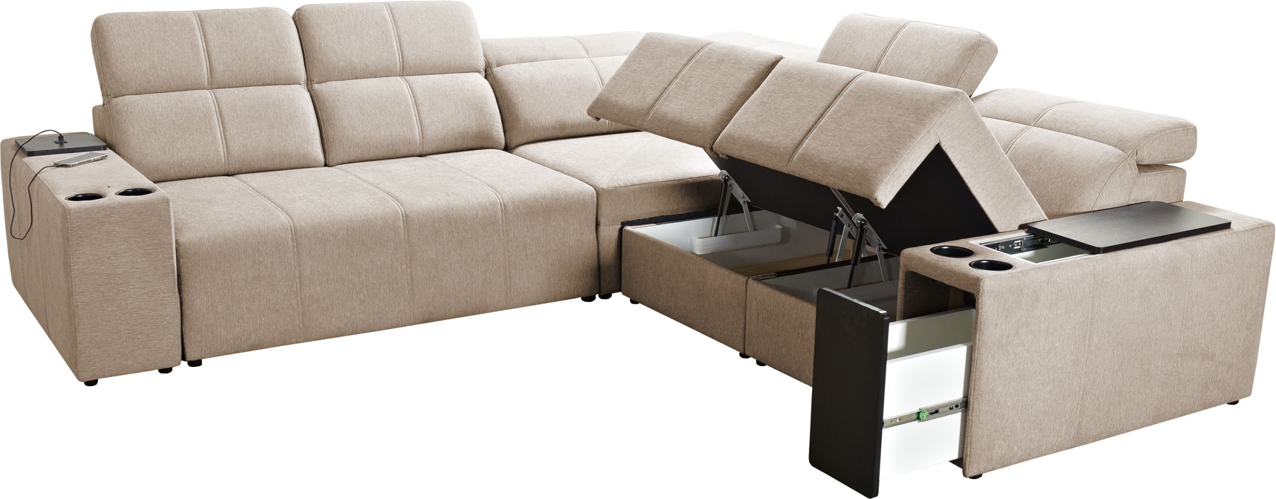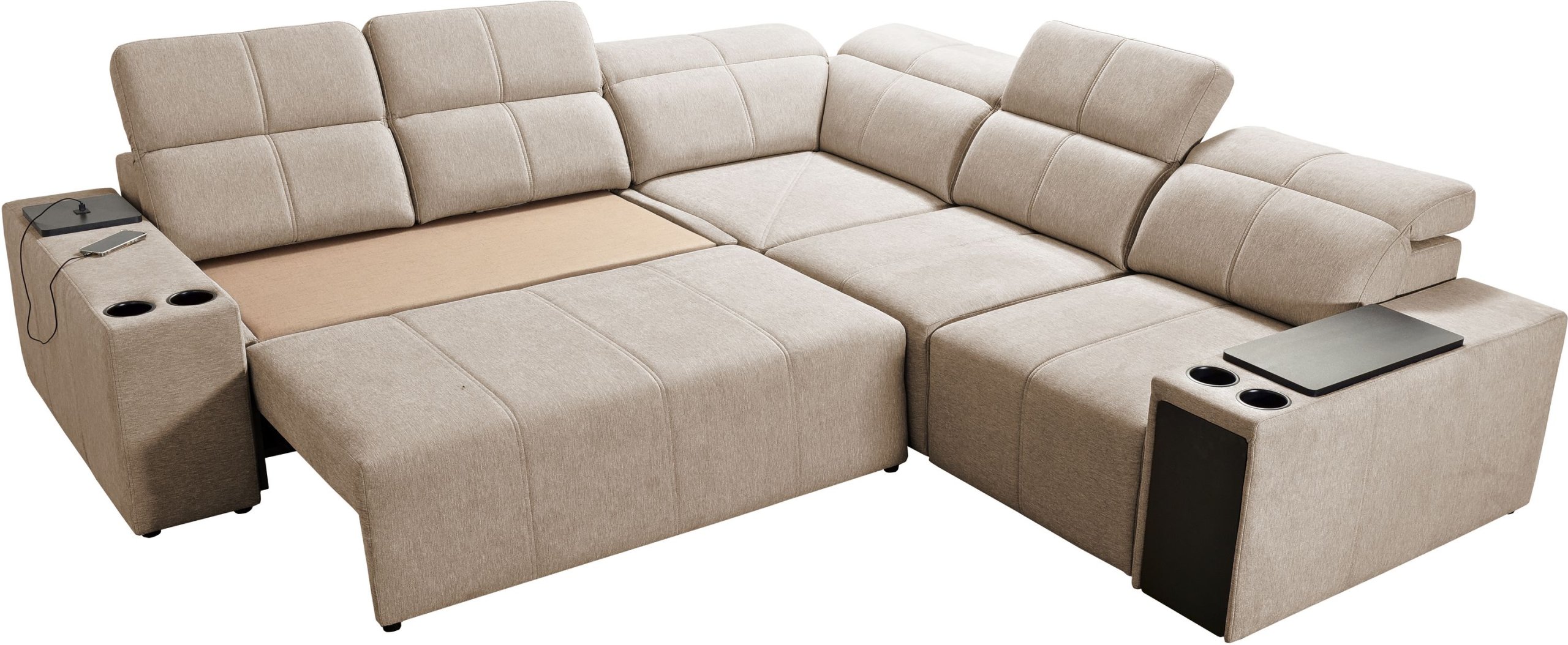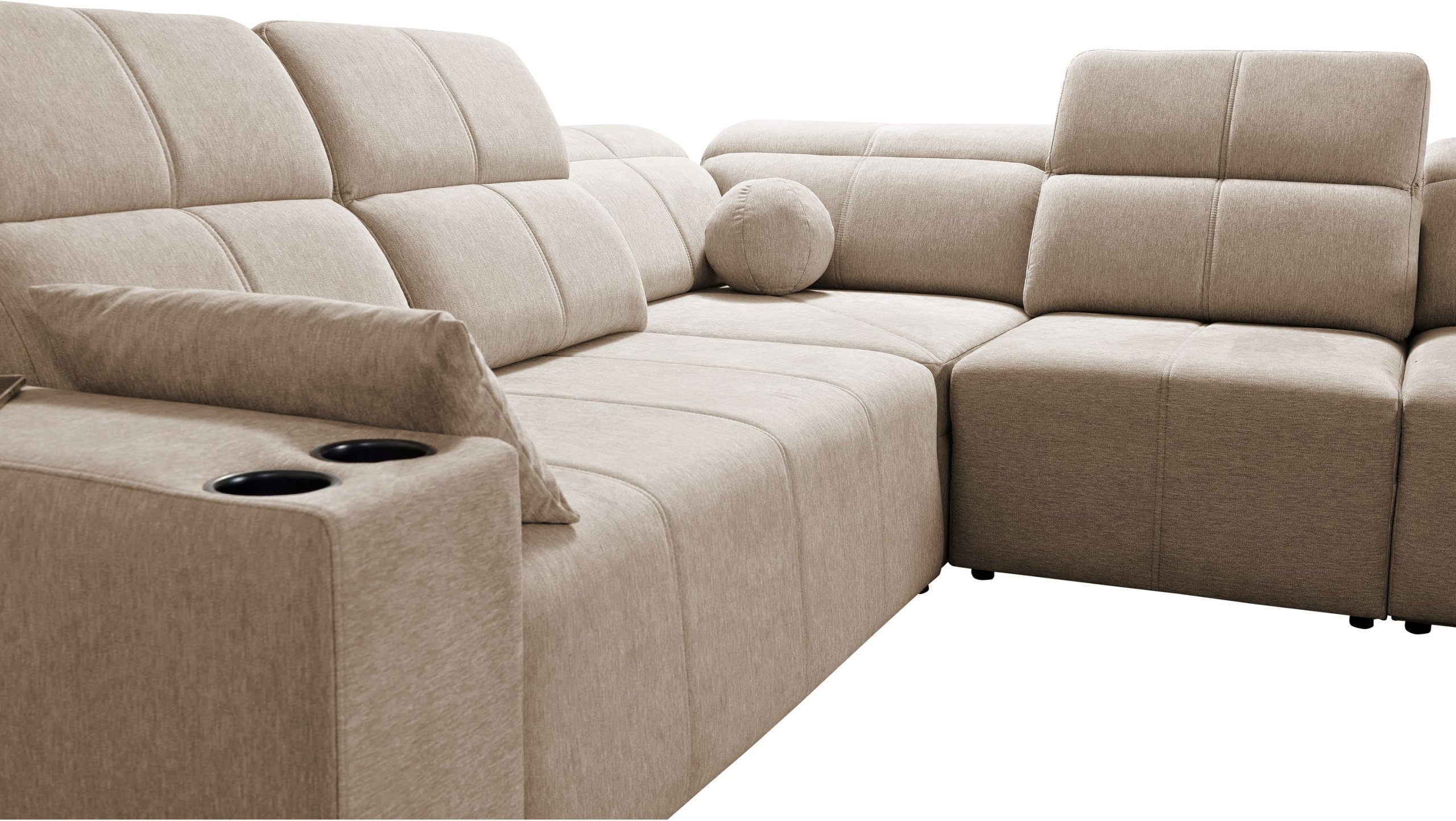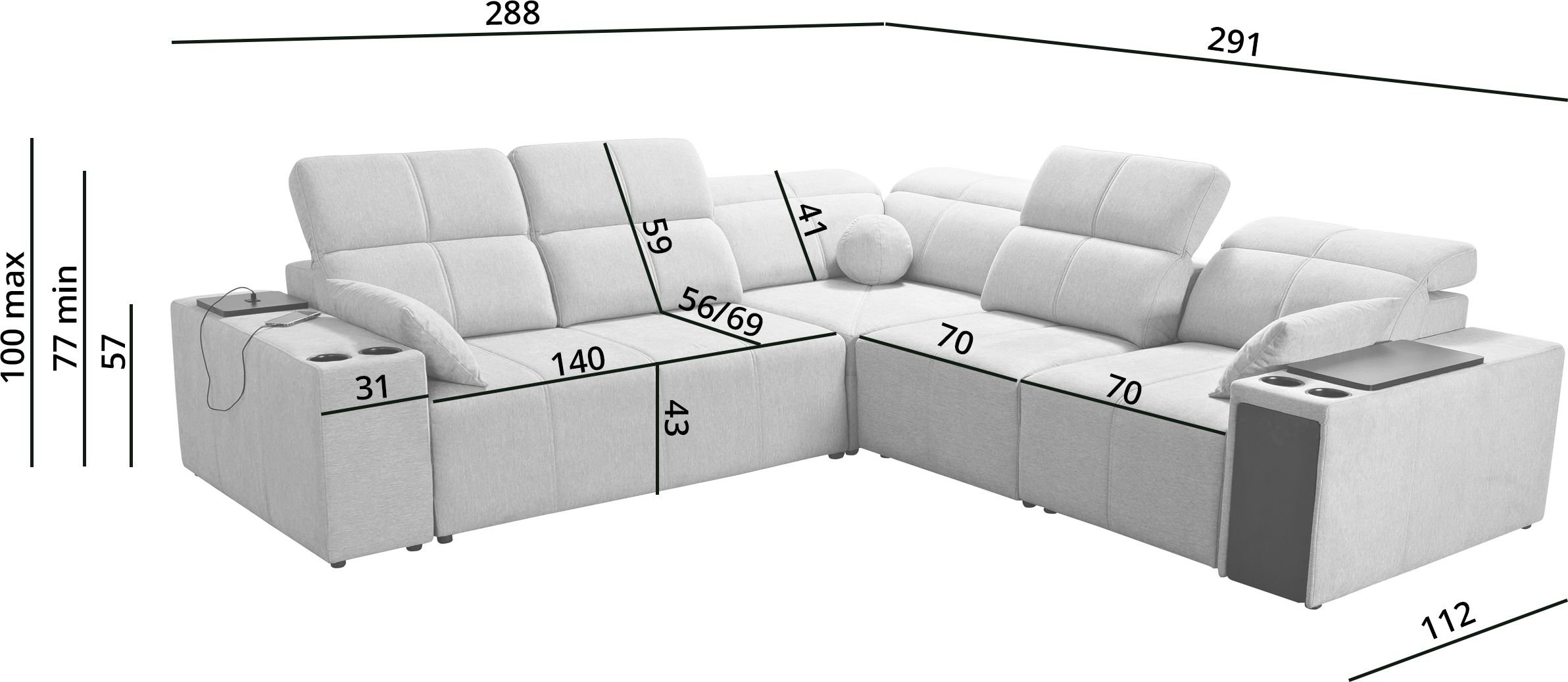 Kutna garnitura Mindy III nudi niz korisnih dodataka koji pojednostavljuju svakodnevnu upotrebu i povećavaju udobnost. Ugrađena su dva ladice za posteljinu, koja omogućuju pohranu deka, jastuka ili drugih tekstilnih dodataka. Osim toga, garnitura ima šest podesivih naslona za glavu, koje možete prilagoditi ovisno o položaju sjedenja ili ležanja.