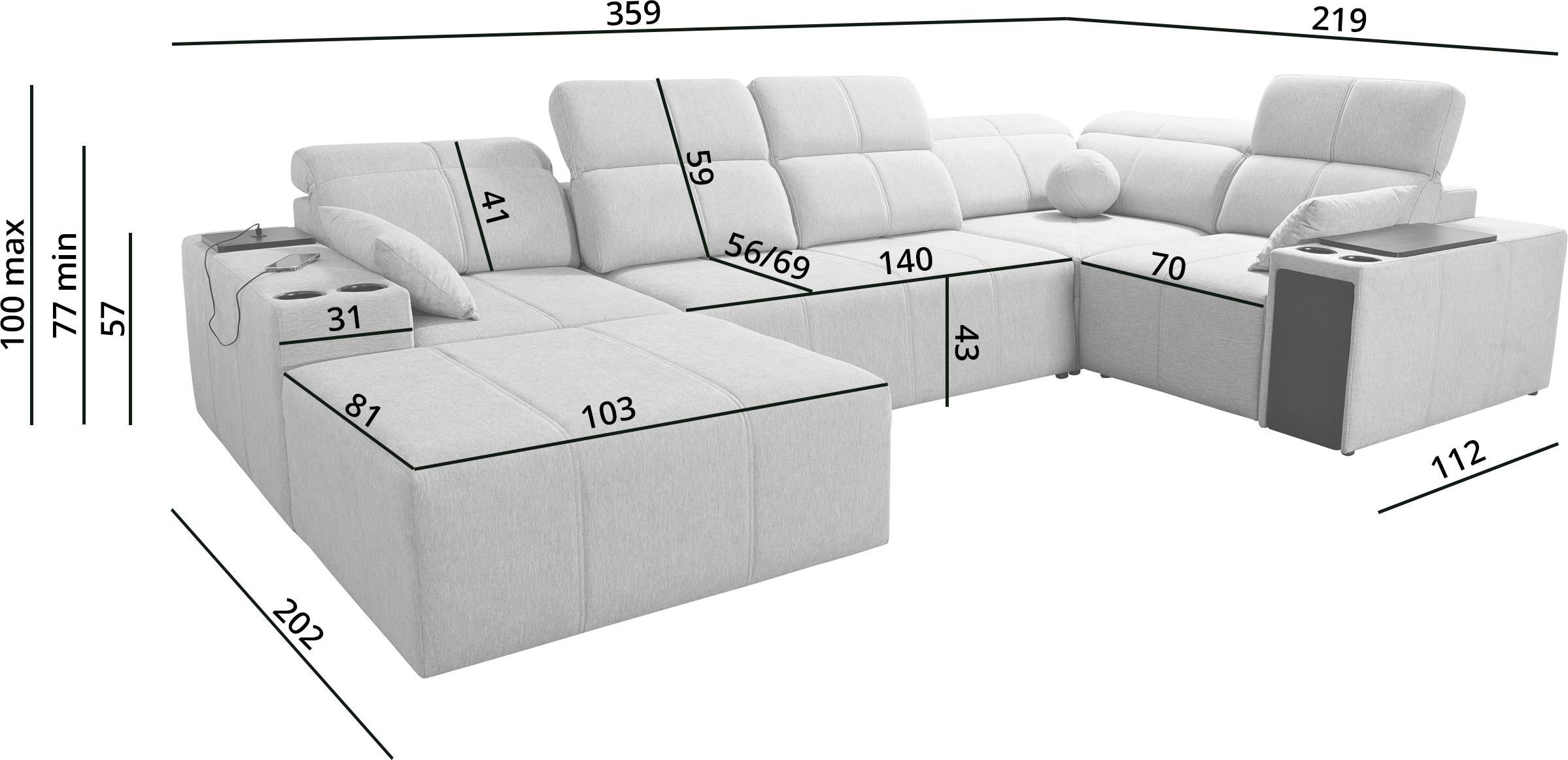 Kutna garnitura u obliku slova U Mindy IV – Brattex je moderan komad tapeciranog namještaja koji spaja elegantan dizajn, visoku funkcionalnost i promišljene detalje. Izrađena je u tvornici Brattex u Poljskoj, što jamči kvalitetnu izradu i pažnju na svaki detalj. Sa svojom impresivnom širinom od 359 cm i dubinom od 202 cm na lijevoj te 219 cm na desnoj strani, nudi mnogo prostora za udobno sjedenje ili opuštanje. Visina sjedala iznosi 43 cm, što omogućuje ugodnu ergonomiju pri sjedenju. Garnitura je presvučena tkaninom Verita 09, koja se odlikuje mekom površinom i modernim izgledom.