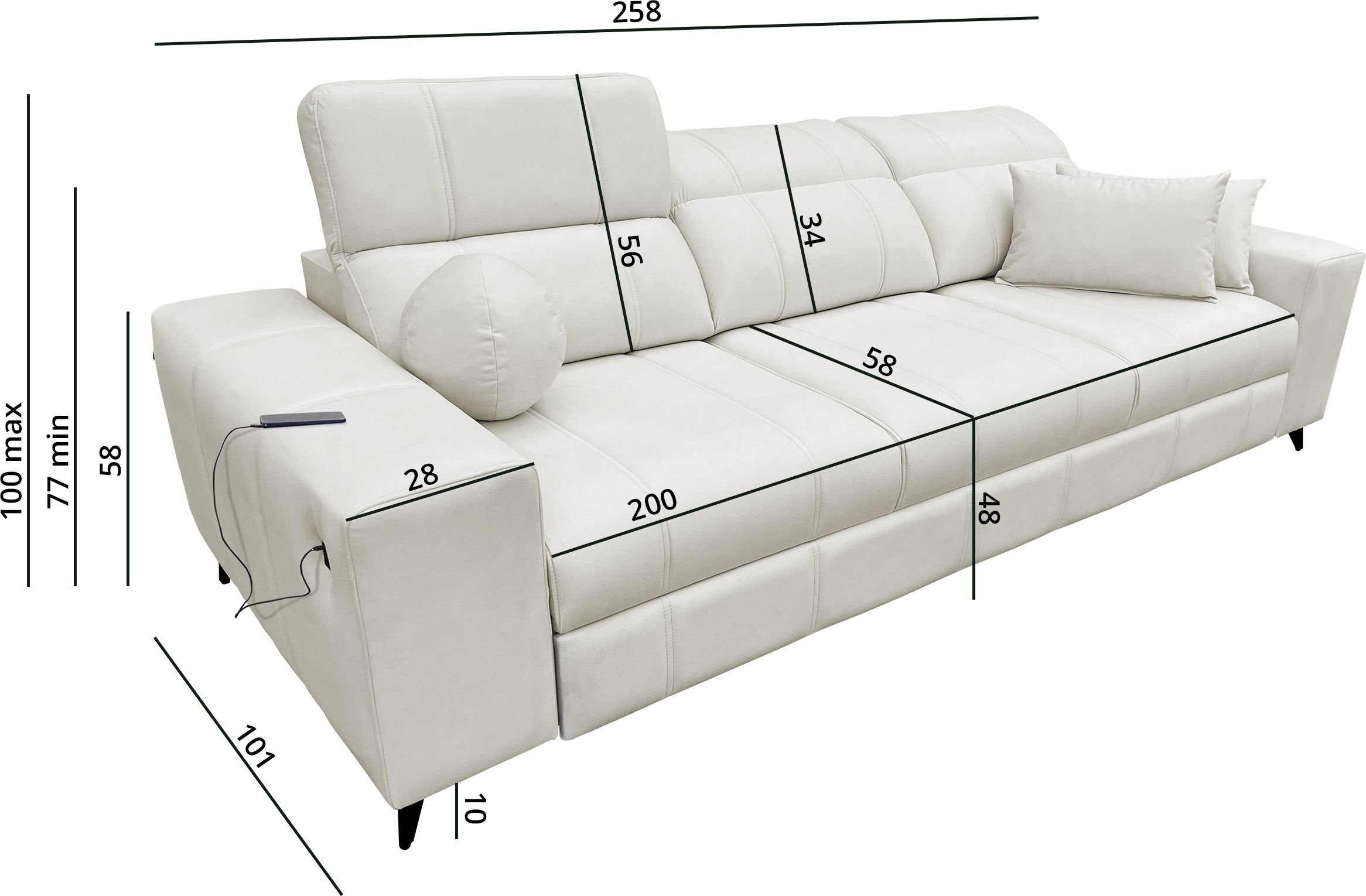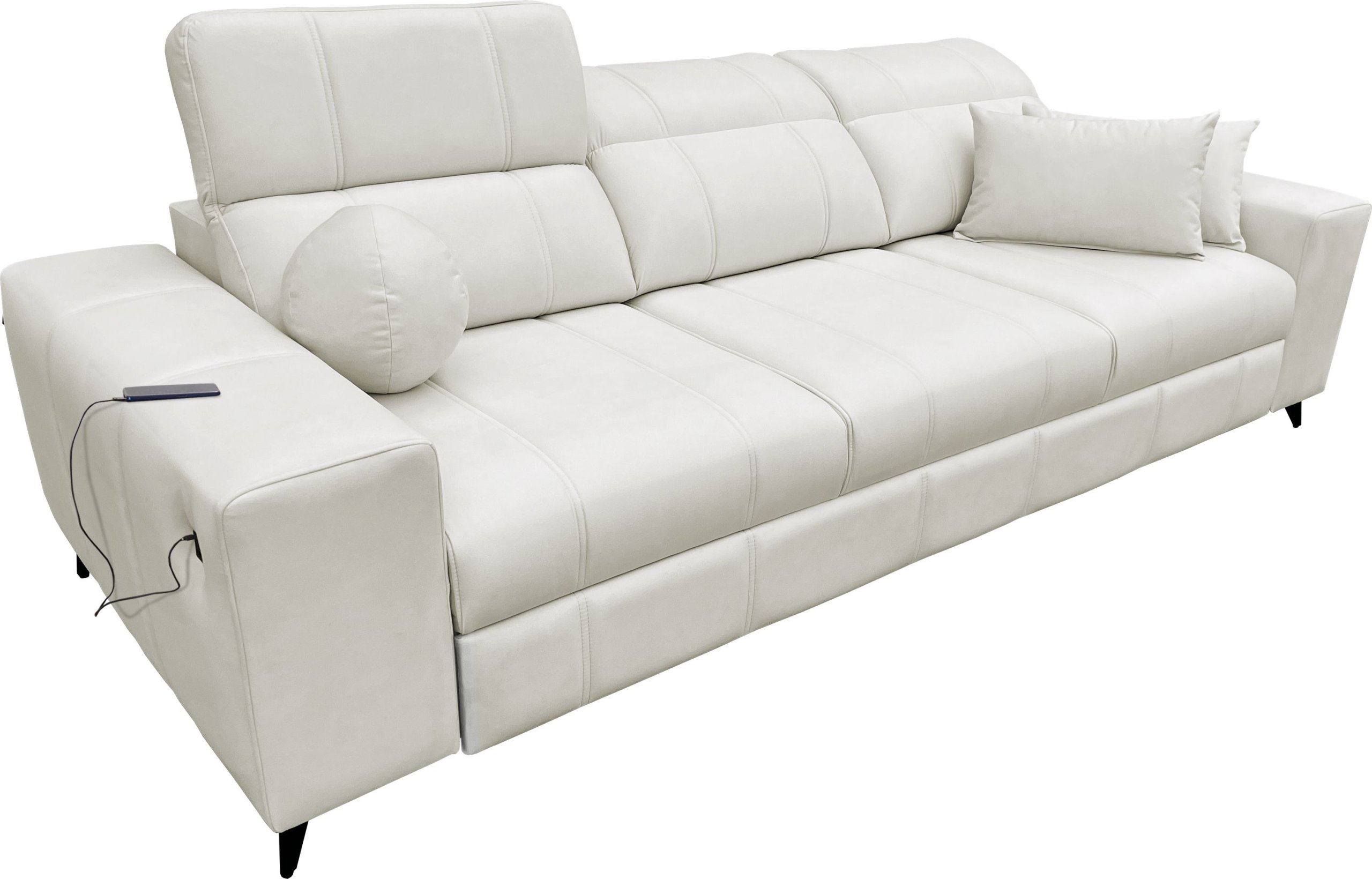 Trosjed Dafne opremljen je s tri podesiva naslona za glavu, koji omogućuju individualno podešavanje nagiba i time veću udobnost pri sjedenju. Ugrađena su i USB vrata tipa A i C, što omogućuje praktično punjenje pametnih uređaja izravno tijekom opuštanja na kauču. Trosjed je samostojeći, što znači da je stražnja strana također estetski obrađena i pogodna za postavljanje i u središte prostorije.