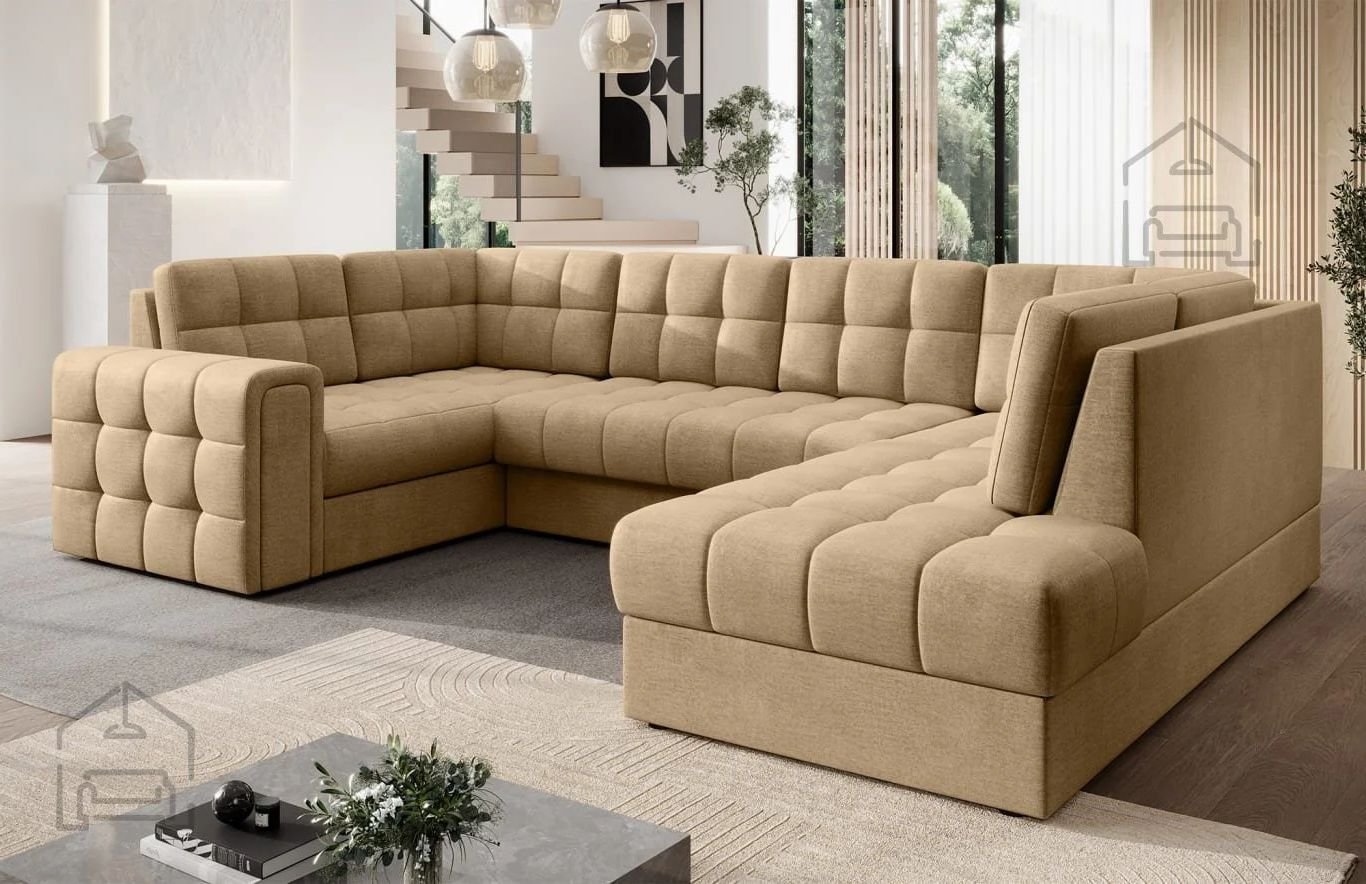 Savršena kombinacija udobnosti, funkcionalnosti i modernog izgleda – to je kutna garnitura u obliku slova U, koja će postati središnji komad vaše dnevne sobe. Svojim impresivnim dimenzijama 299x198x82 cm nudi dovoljno prostora za opušteno druženje s obitelji, prijateljima ili uživanje u potpunom miru. Njezin oblik u U varijanti omogućuje da svaki član kućanstva pronađe svoj kutak za opuštanje, a istodobno stvara ugodan osjećaj povezanosti i domaće atmosfere.