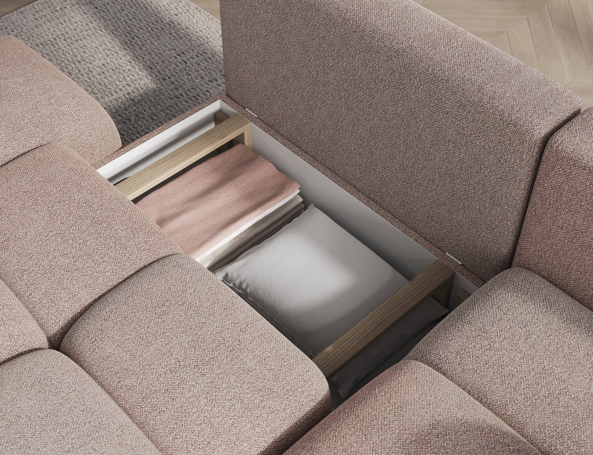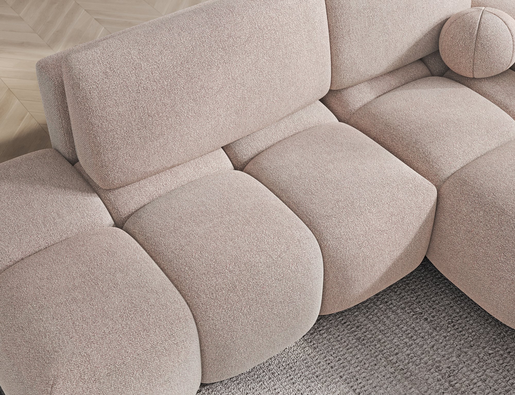 Okvir garniture izrađen je od drveta, što osigurava stabilnost i dug vijek trajanja. Sjedeći dio sadrži wave spring opružnu jezgru, dopunjenu kvalitetnim pjenama HR3030 i T2315, koje zajedno osiguravaju savršenu ravnotežu između mekoće i potpore. Naslon čine mekani jastuci, punjeni pjenastim granulatom, koji se prilagođava obliku tijela i pruža ugodan osjećaj opuštenosti.