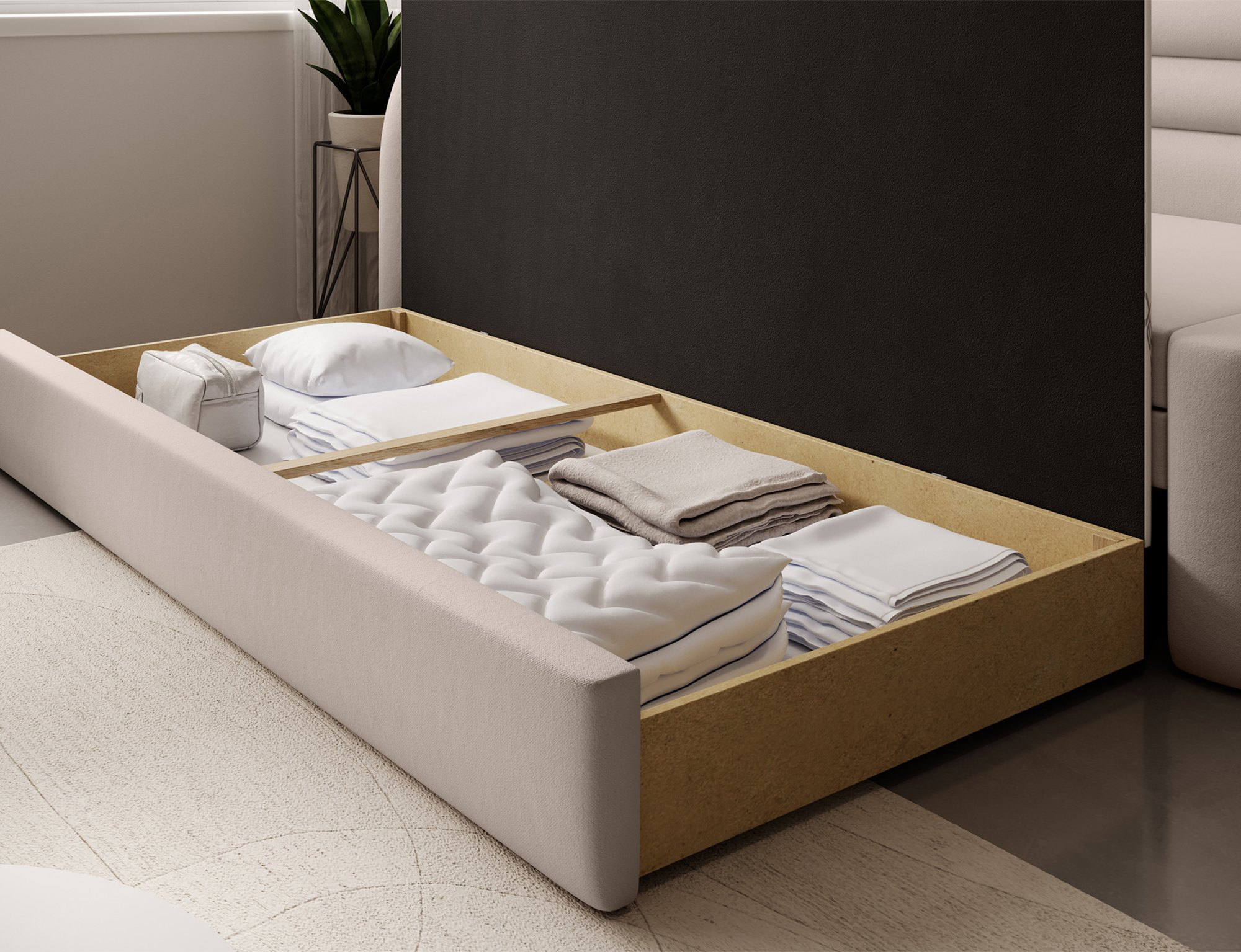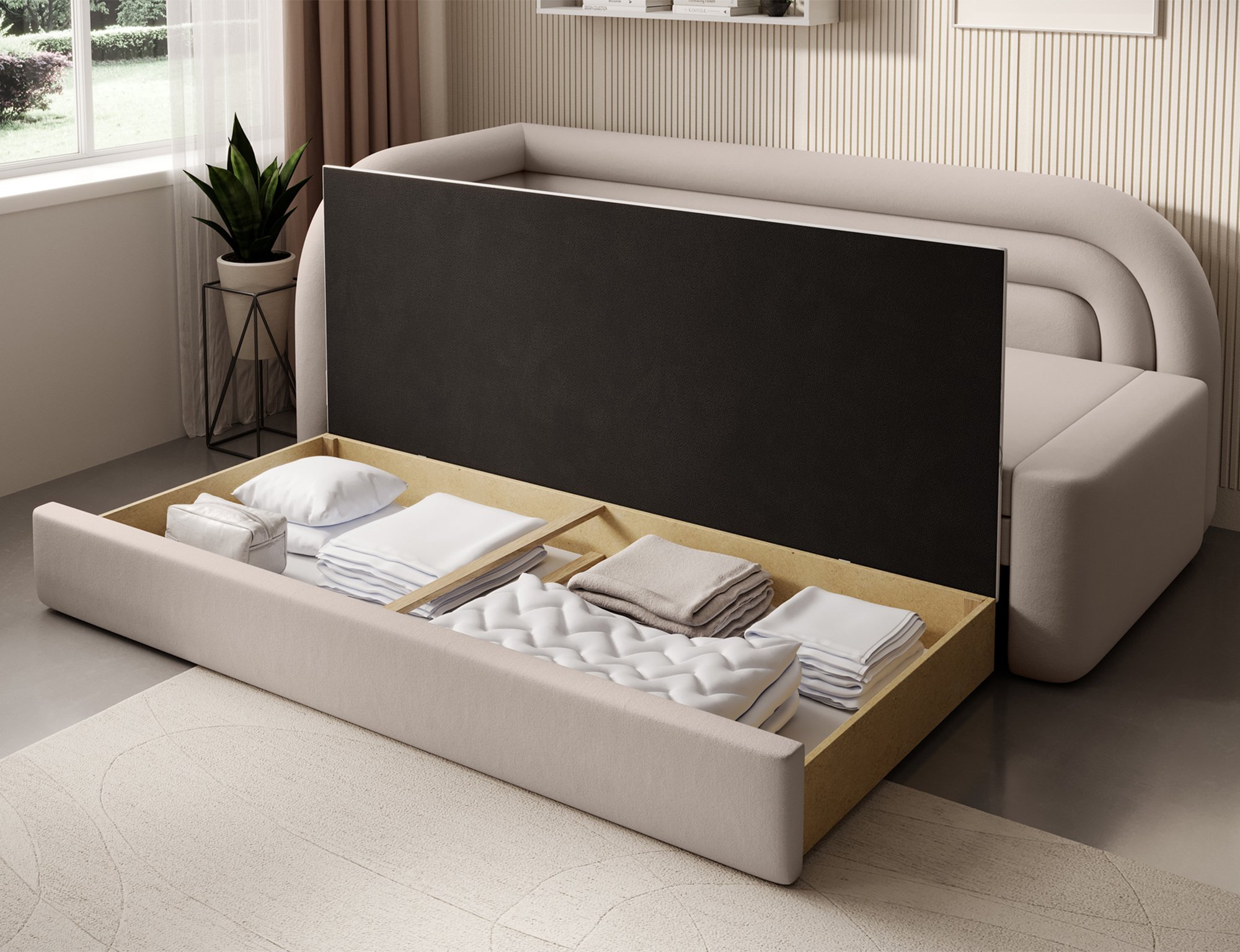Najveća prednost modela Fabillo je teleskopski mehanizam za razvlačenje, koji omogućuje jednostavnu i brzu pretvorbu sjedeće garniture u ležaj. Površina za spavanje mjeri 199x135 cm i ravna je te udobna, što osigurava ugodan odmor ili spavanje gostiju. Mehanizam radi glatko i intuitivno, bez potrebe za većom silom, što znači da trosjed može razvući praktički svaki korisnik. Model nema ladicu za posteljinu, stoga je namijenjen prvenstveno onima koji cijene čiste linije i prostornu lakoću bez dodatnih elemenata.