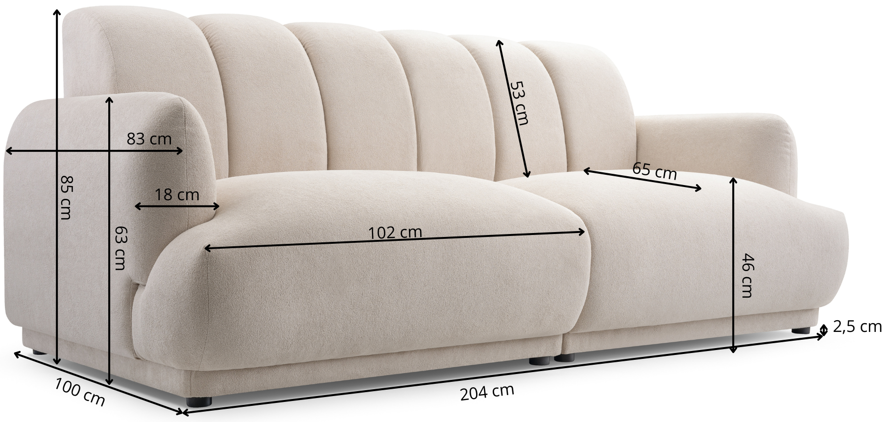 Dimenzije 204x100x85 cm omogućuju da trosjed pruži dovoljno prostora za opuštanje, druženje ili čitanje knjige, a da pritom ne zauzme previše mjesta u prostoriji. U unutrašnjosti se skriva opružna jezgra Wave Spring, koja osigurava ravnomjernu raspodjelu težine i dugotrajnu udobnost sjedenja. Mekana, a istovremeno čvrsta tkanina, poput Gerra 80, pruža ugodan osjećaj na dodir te otpornost na habanje, što je iznimno važno kod svakodnevne upotrebe.