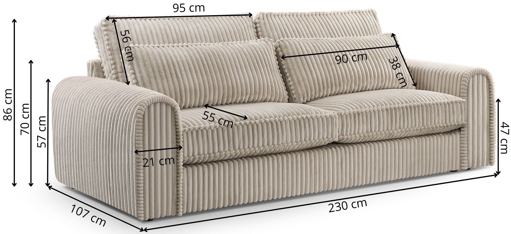 Trosjed Cassini marke Kinas meble predstavlja suvremen komad tapeciranog namještaja koji spaja udobnost, izdržljivost i vizualno privlačan dizajn. Svojim dimenzijama 230x107x86 cm nudi dovoljno prostora za opušteno sjedenje triju osoba, a zahvaljujući uravnoteženim proporcijama ne djeluje preveliko ni u manjim dnevnim sobama. Izrađen je na osnovi čvrste drvene konstrukcije i laminirane iverice, koje osiguravaju stabilnost i dug vijek trajanja. Mekano sjedalo, ispunjeno pjenom tipa VP i poduprto valovitim oprugama (Wave Spring), omogućuje udoban i elastičan osjećaj pri sjedenju, što povećava opću udobnost korištenja.