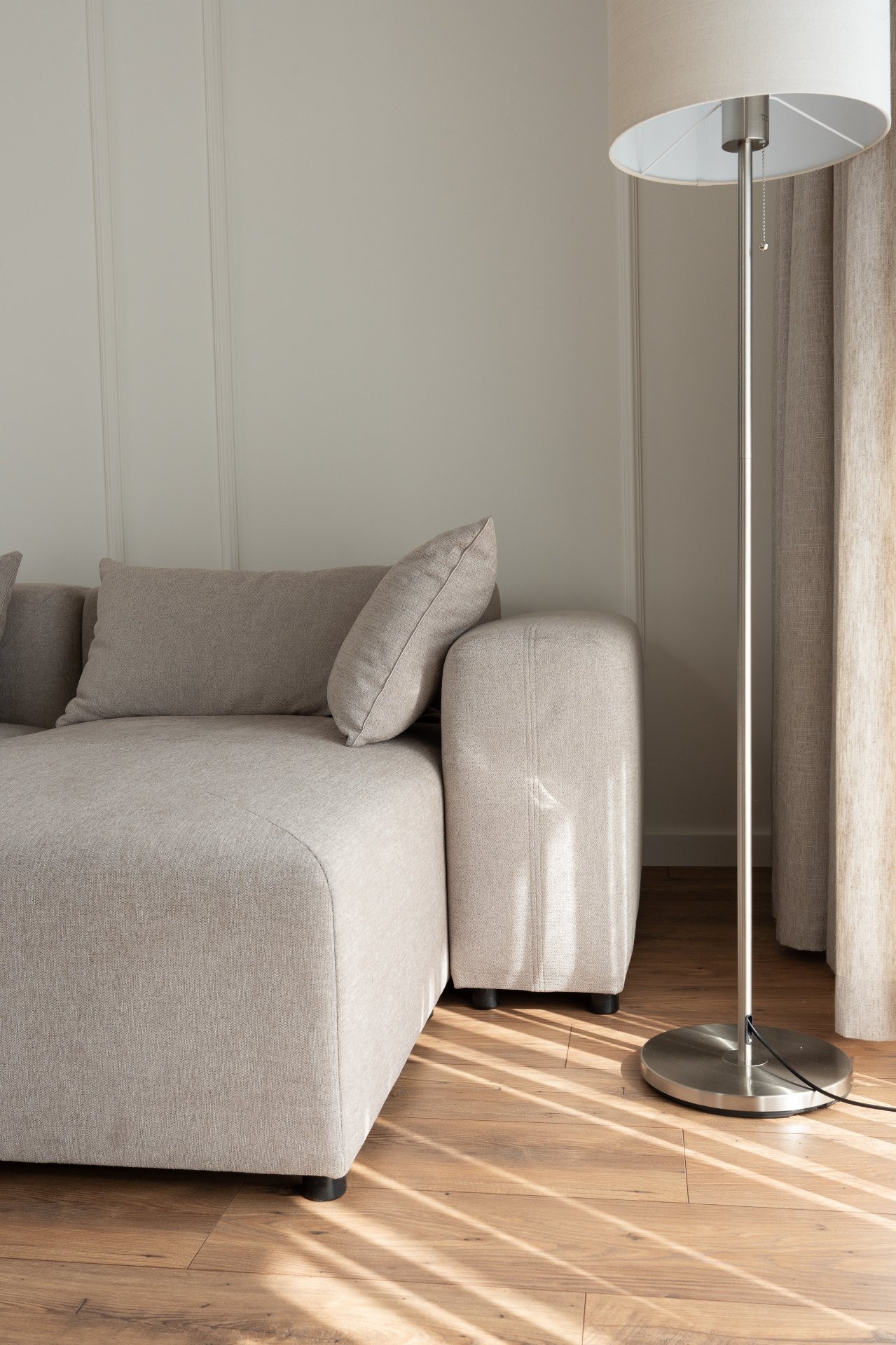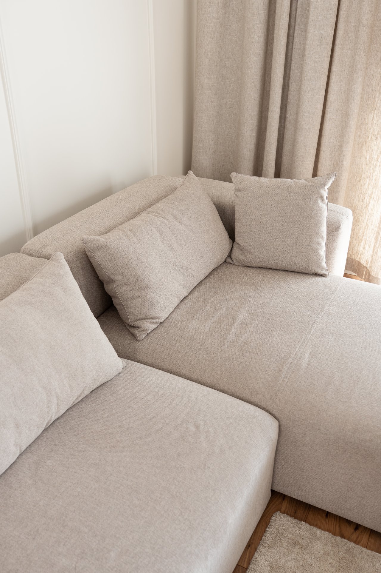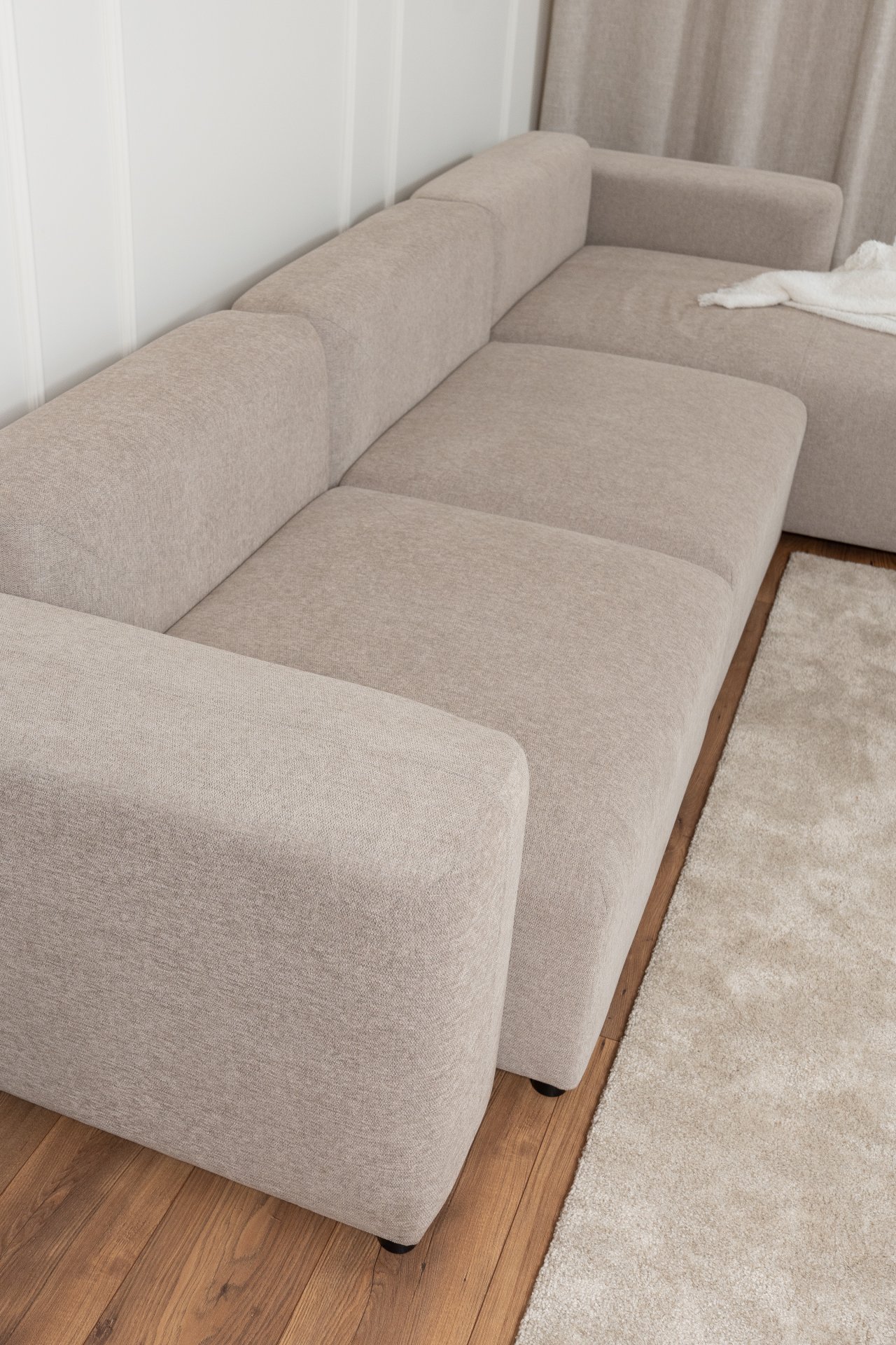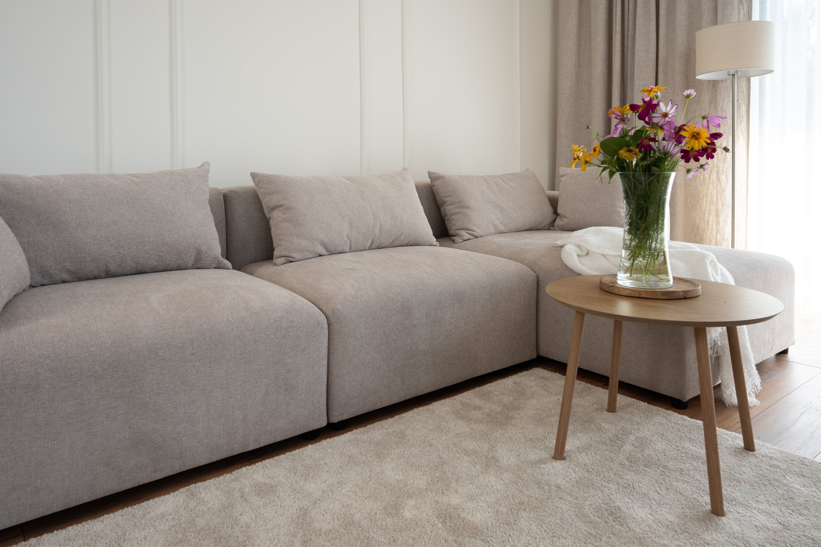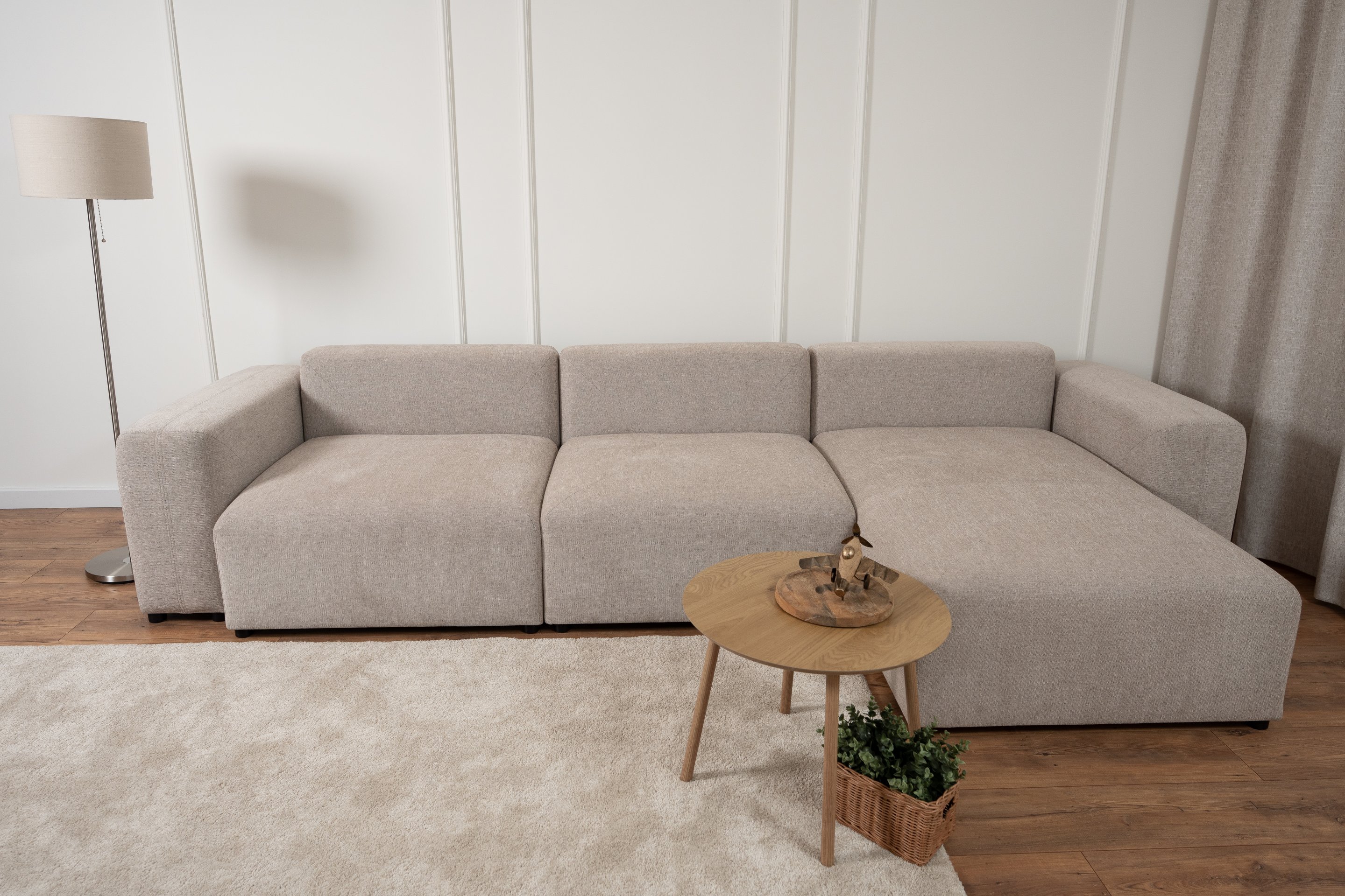 Sjedeća garnitura je presvučena tkaninom Sorella, koja je mekana pletenina s finom teksturom. Osim ugodnog osjećaja na dodir, tkanina donosi i moderan izgled te jednostavno održavanje. Dostupna je u više nijansi boja, što omogućuje da garnituru prilagodite svom prostoru i osobnom stilu. Crne nogice visine 5 cm dodaju kontrast i vizualnu lakoću, a ujedno omogućuju jednostavno čišćenje poda ispod garniture.