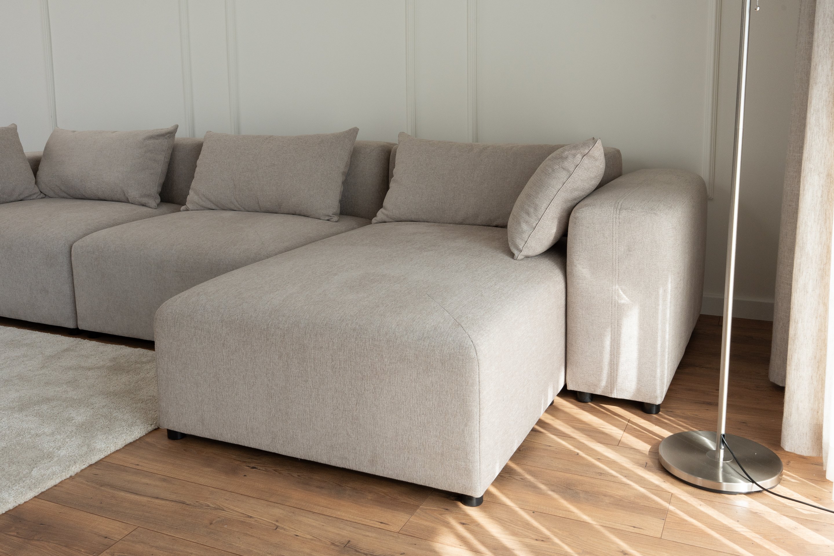 Kutna sjedeća garnitura Modularna s jastucima savršen je izbor za svaki moderan dnevni prostor koji želi spojiti funkcionalnost, udobnost i estetsku profinjenost. S dimenzijama 330x160x68 cm nudi dovoljno prostora za opušteno sjedenje više osoba, a njezin modularni dizajn omogućuje jednostavnu prilagodbu postavljanja jer je dostupna u lijevoj ili desnoj verziji tipa L. Proizvedena je u tvornici PKMebel u Poljskoj, gdje se isprepliću kvalitetna izrada i moderan dizajn.