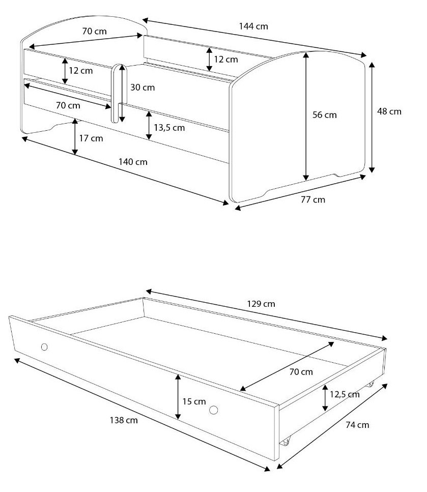 Krevet nije samo lijep, već i izuzetno funkcionalan. U kompletu je već uključен madrac, što znači da roditelji ne moraju tražiti dodatna rješenja. Osim toga, krevet ima prostranu ladicu koja se nalazi ispod ležaja i pruža dodatni prostor za pohranu posteljine, igračaka ili drugih dječjih potrepština. Tako će soba uvijek biti uredna, a dijete će imati više prostora za igru.