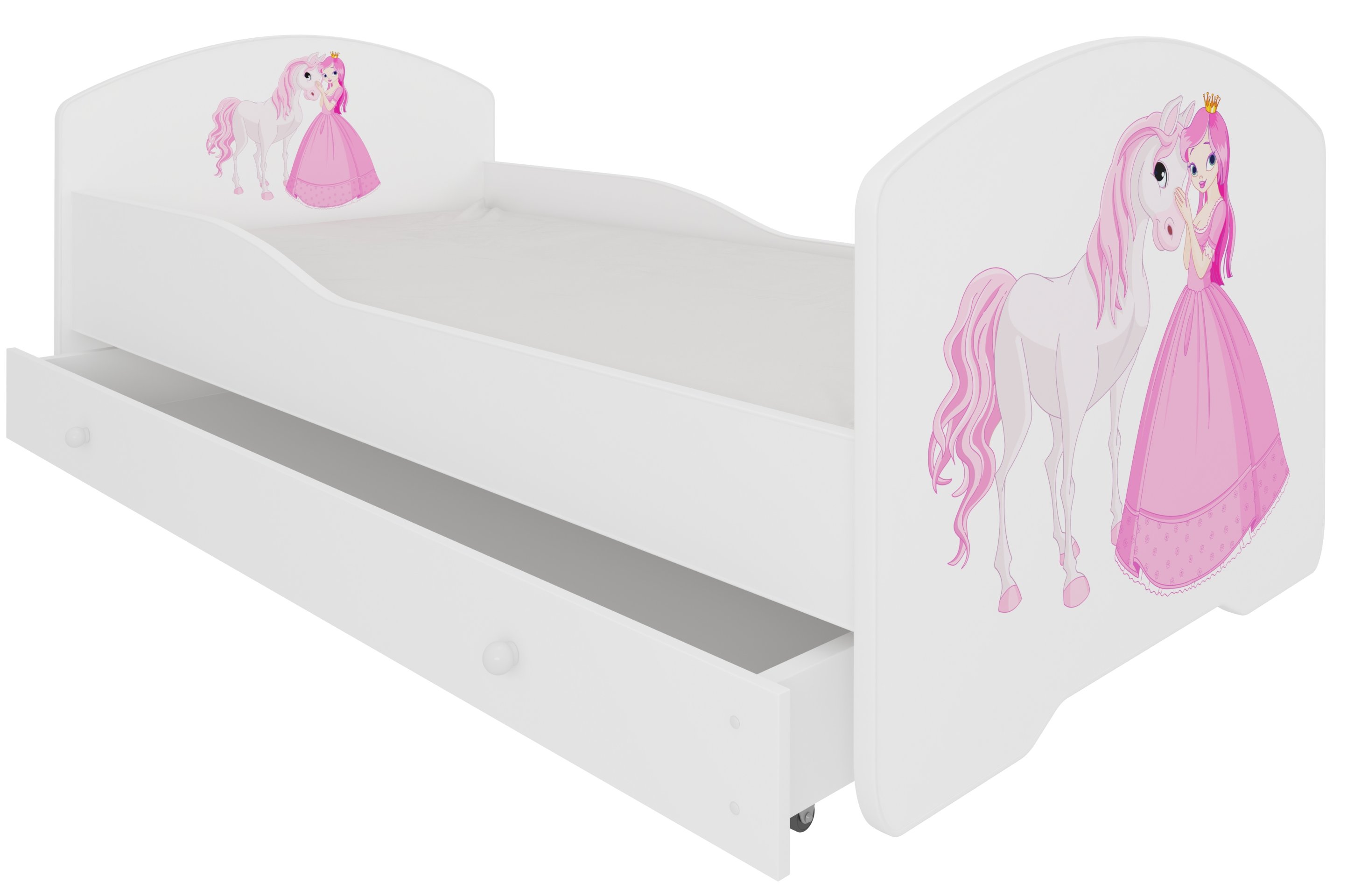 Motiv princeze i konja na bijeloj podlozi stvara čaroban izgled koji će oduševiti svakog malog sanjara. Krevet je više od komada namještaja – to je bajkoviti kutak u kojem se dijete osjeća sigurno i opušteno. Zbog šarenog i nježnog dizajna lijepo se uklapa u različite stilove dječjih soba te stvara ugodnu, maštovitu atmosferu.