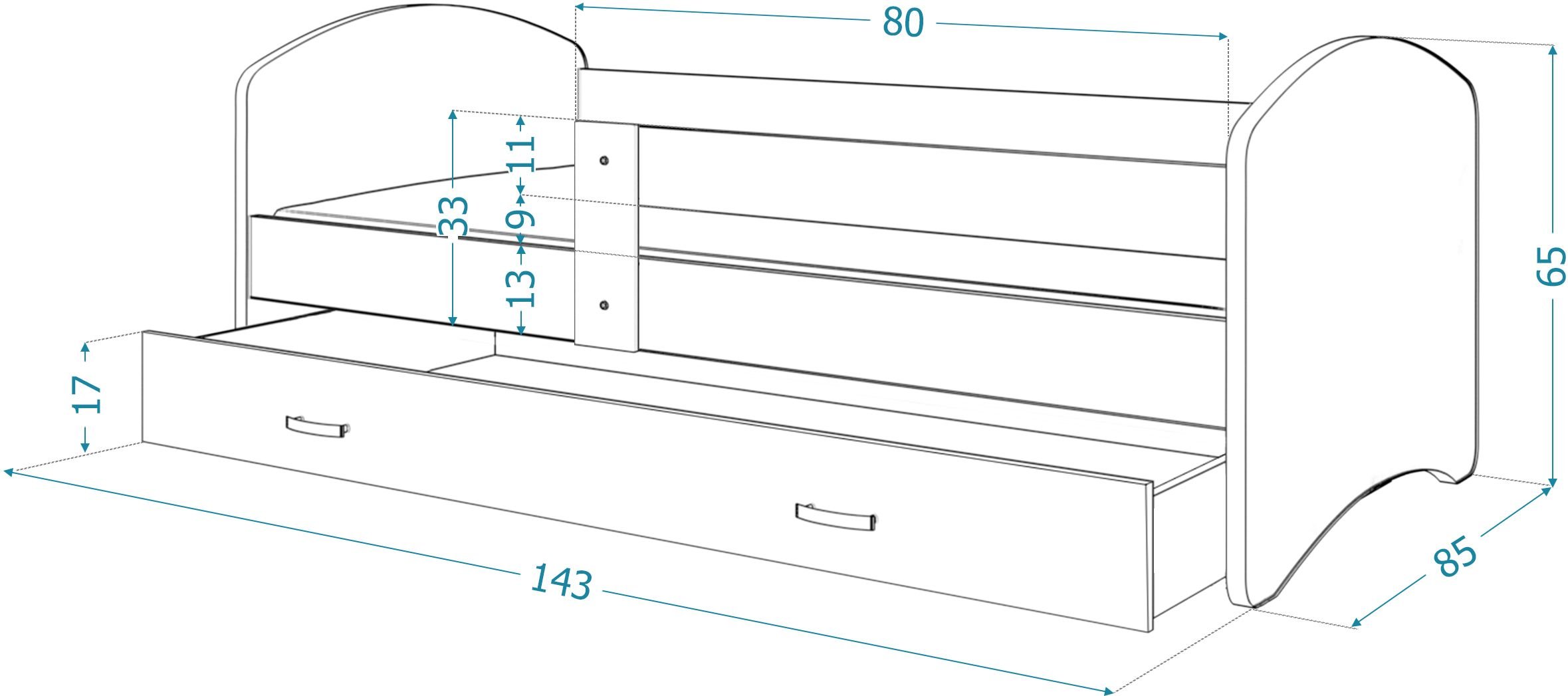 Sadrži prostranu ladicu na izvlačenje za pohranu stvari koja dodatno štedi prostor. Krevet je primjeren za malu djecu jer ima zaštitnu ogradicu koja štiti od padova i ozlijeda.