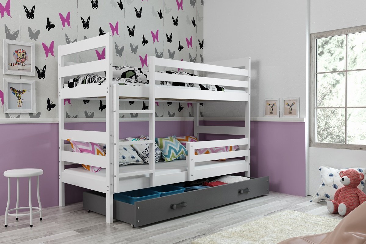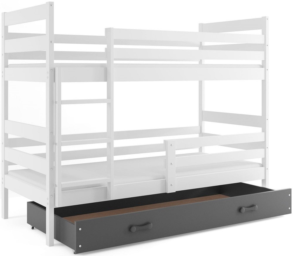 Krevet na kat Eryk je dostupan u više boja, ističe se jednostavnim dizajnom koji će vas osvojiti na prvi pogled i omogućiti vašoj djeci ugodan boravak u sobi. Klasičan dizajn kreveta na kat Eryk nudi mnogo mjesta za odmor, neupadljive ljestve i zaštitnu ogradu na oba ležaja zbog koje će vaša djeca sigurno i bezbrižno spavati bez mogućnosti ozljeda i padova s kreveta. Ladica za odlaganje nudi dodatan prostor za pospremanje posteljine i drugih dječjih stvari ili predmeta u sobi.