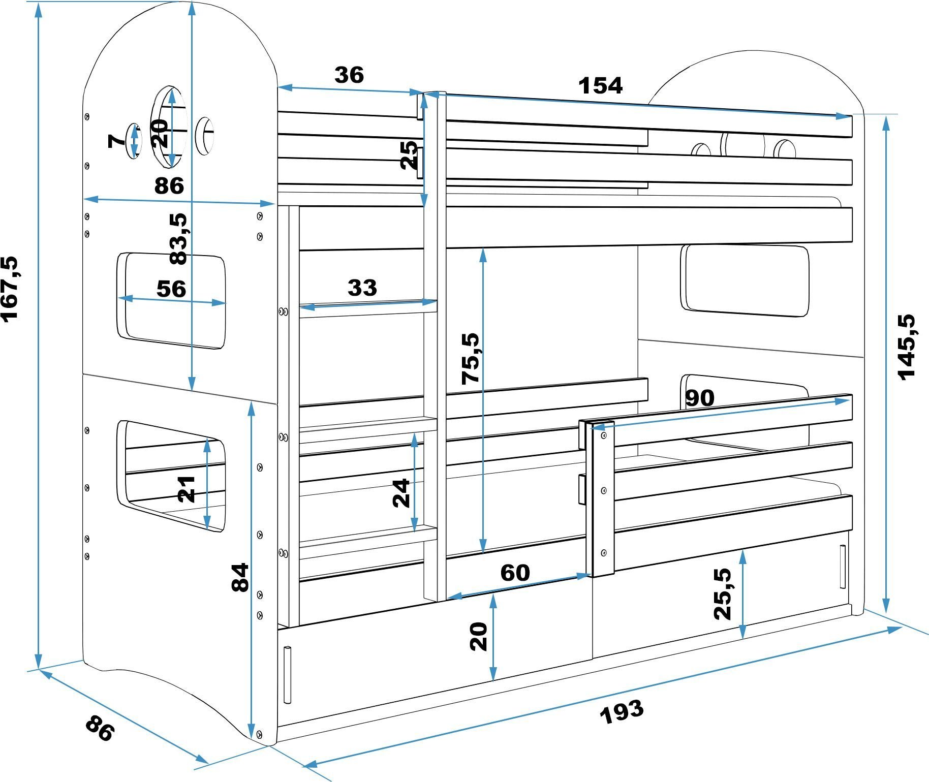 Krevet na kat Dominik - 80x190 cm - graphite/roza 17801