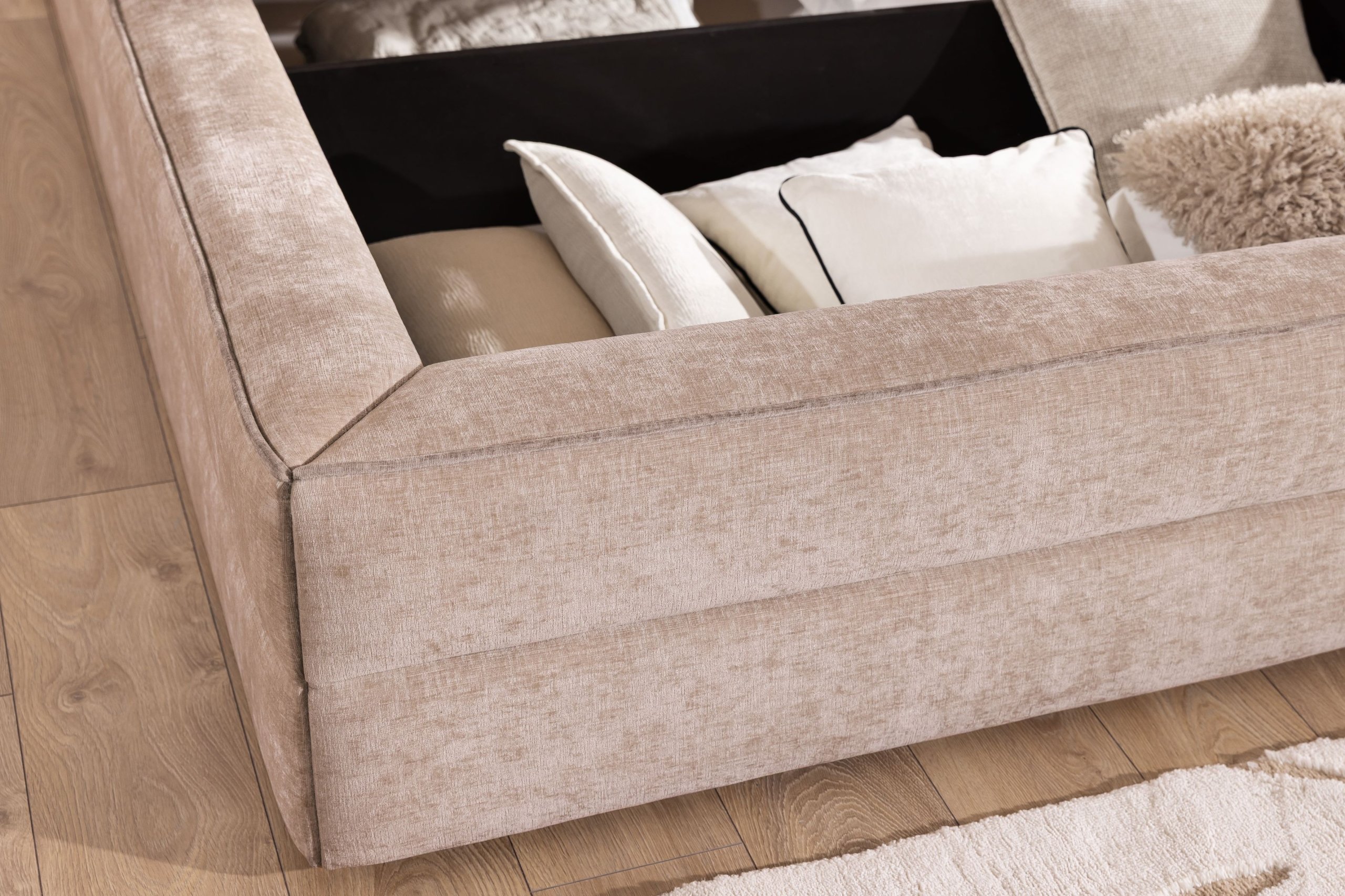 Okvir kreveta Tulia II je tapeciran, što znači da je cijela konstrukcija obložena mekom tkaninom, ugodnom na dodir i jednostavnom za održavanje. Upotrijebljeni materijali – drvo i iverica – omogućuju čvrstoću i dug vijek trajanja, a pritom zadržavaju umjerenu težinu kreveta za lakše postavljanje. Krevet stoji na plastičnim nogama u crnoj boji, koje osiguravaju dobru stabilnost i suvremeni vizualni kontrast s tkaninom.