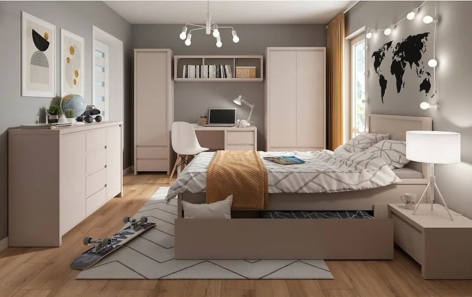 Krevet Kaspian 160/T dizajniran je tako da se savršeno uklapa s drugim elementima kolekcije Kaspian. U prostoru ga možete nadopuniti noćnim ormarićima, komodama ili ormarima u istom dekoru, što omogućuje stvaranje jedinstvenog, mirnog spavaćeg ambijenta. Minimalistički dizajn bez ručkica pridonosi uređenom, suvremenom izgledu, dok boja kašmir unosi toplinu i osjećaj domaćeg ugođaja.