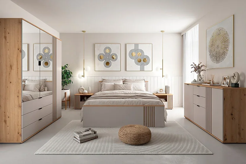 Kombinacija boja hrasta artisan i kašmira omogućuje jednostavno kombiniranje s namještajem u prirodnim ili pastelnim tonovima. Krevet se lijepo slaže s ormarima, noćnim ormarićima ili komodama iz iste kolekcije Brevas, što omogućuje jedinstven i harmoničan izgled spavaće sobe. Površine su glatke, linije čiste i bez nepotrebnih detalja, što naglašava moderan dizajn s osjećajem za toplinu doma.