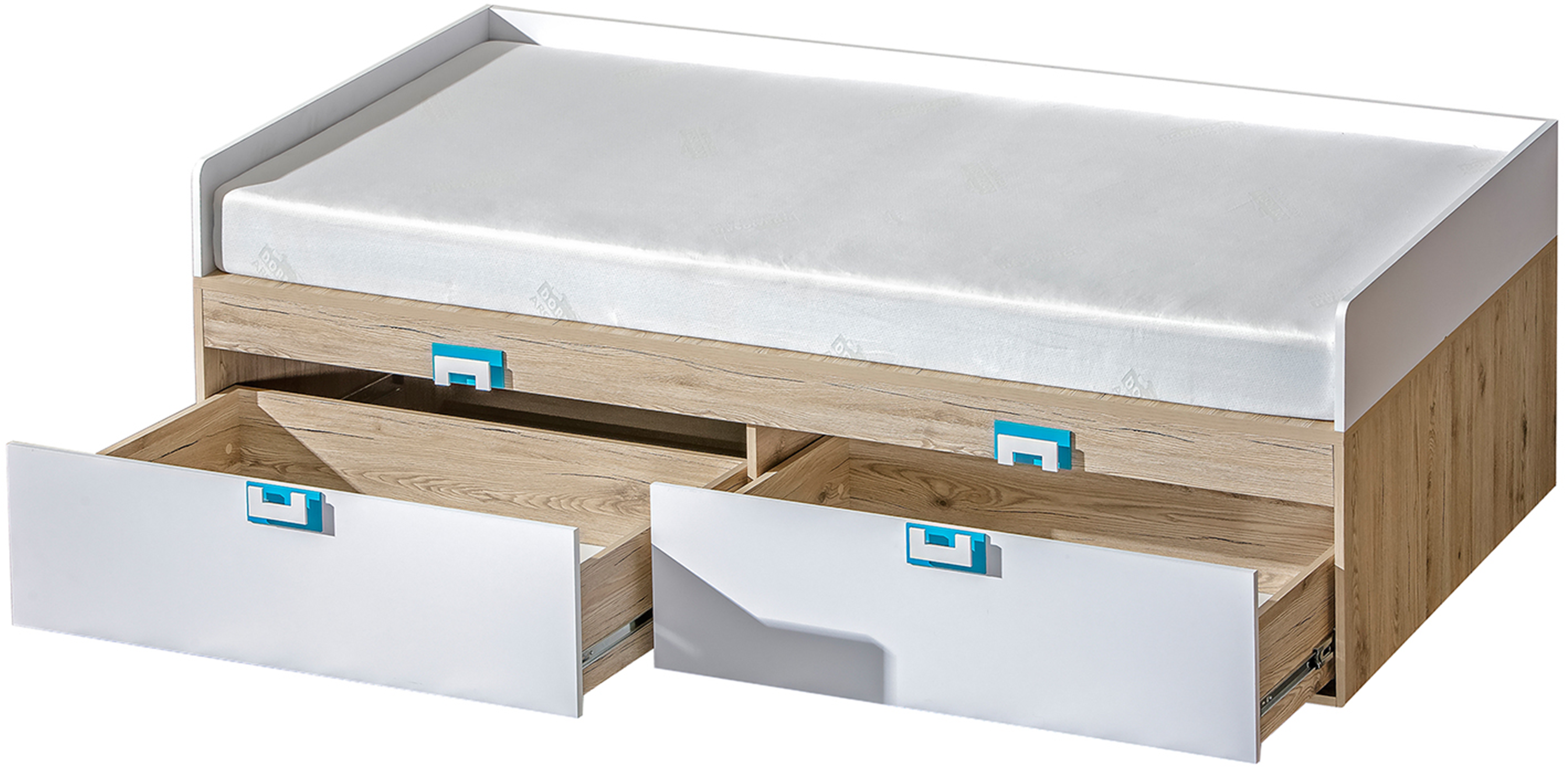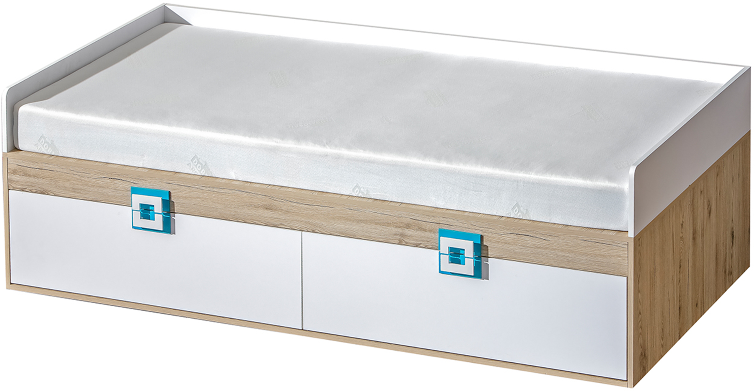 Krevet Nico spaja moderan dizajn s nježnim kolorističkim naglascima. Osnovna boja konstrukcije je svijetli hrast, koji se odlično slaže s bijelim površinama i tirkiznim ručkama. Takva paleta boja donosi osjećaj svježine i razigranosti, karakterističan za dječje prostore. Krevet se može kombinirati s različitim namještajem u sličnim tonovima, čime nudi mnogo mogućnosti za stvaranje harmonične i ugodne spavaće sobe.