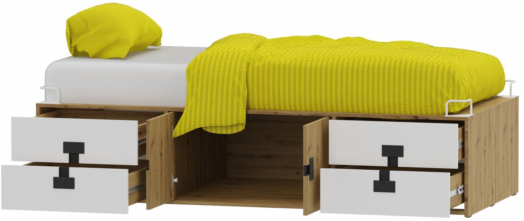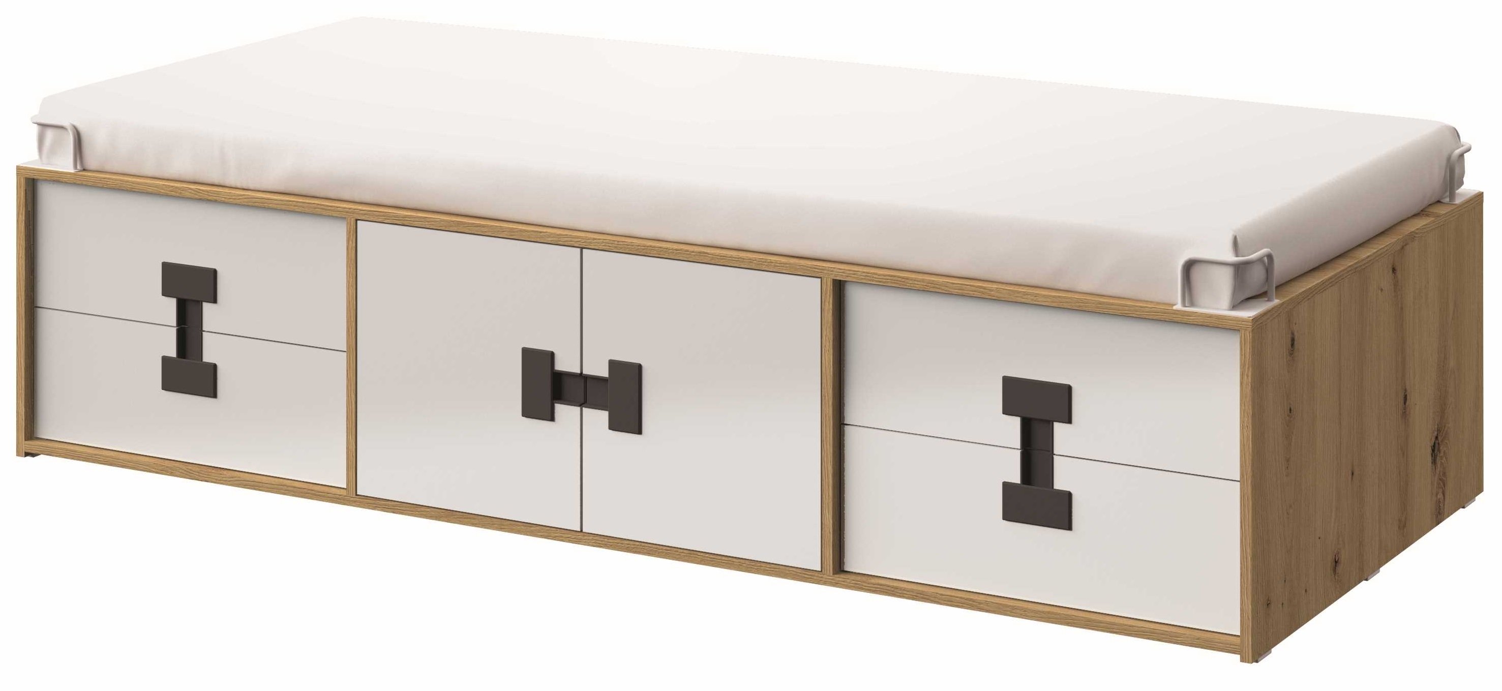 Poseban naglasak stavljen je na kombinaciju boja bijela/artisan hrast, koja spaja moderan izgled s prirodnim dojmom. Bijela boja vizualno povećava prostor i čini ga svjetlijim, dok nijansa artisan hrasta dodaje toplinu i osjećaj doma. Krevet je opremljen ručkama u četiri boje – bijela, crna, hrast i siva – što omogućuje savršeno usklađivanje s ostalim namještajem u sobi ili osobnošću djeteta.