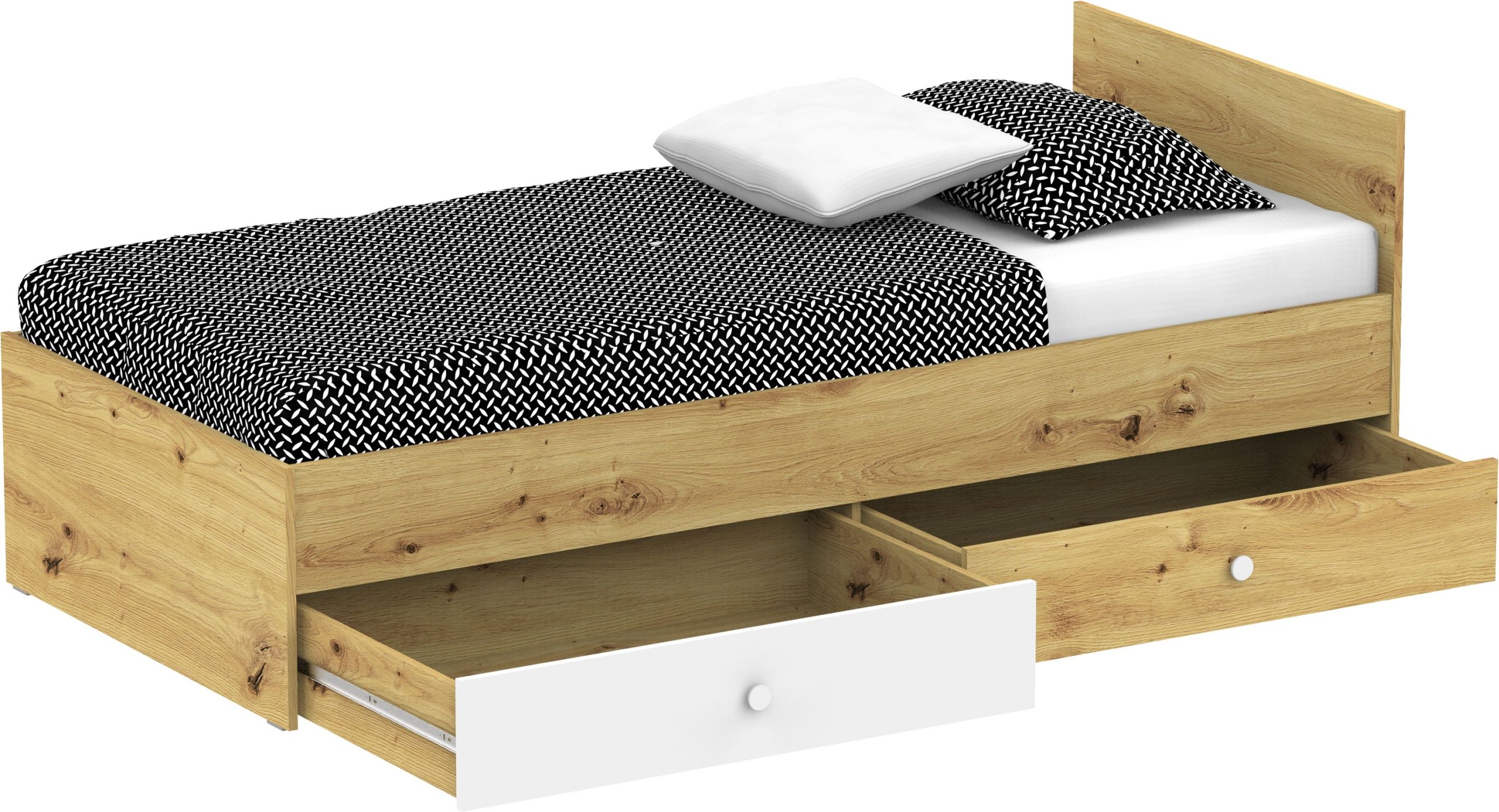 Korpus u nijansi hrasta artisan stvara osjećaj topline, dok bijela sjajna fronta osigurava svježinu i svjetlinu prostora. Ova kombinacija boja omogućuje jednostavno usklađivanje s ostalim elementima unutarnjeg uređenja – prikladna je i za djevojačke i za dječačke sobe. Krevet je opremljen ručkama u tri nijanse – bijeloj, crnoj i sivoj – što daje mogućnost personalizacije i prilagodbe izgleda prema ostatku namještaja.