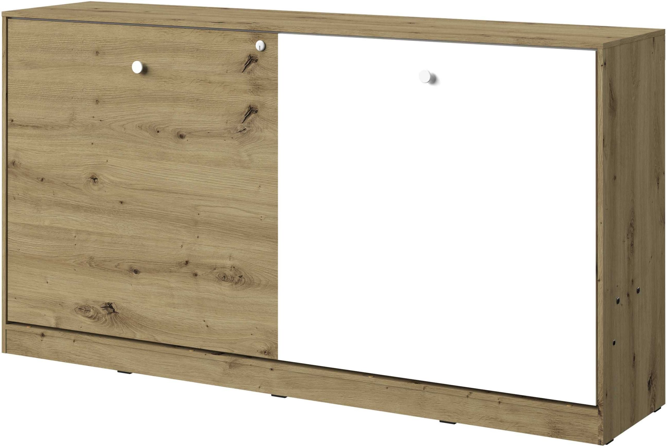Krevet je izrađen od iverne laminirane ploče debljine 16 mm, što mu daje stabilnost i dug vijek trajanja. Površina je otporna na svakodnevnu uporabu i jednostavna za čišćenje. Kombinacija korpusa u boji artisan hrasta i bijele mat fronte stvara uravnotežen kontrast koji u prostor unosi osjećaj prirodnosti i svjetlosti. Ručke su dostupne u tri boje – bijeloj, crnoj ili sivoj – pa je moguće odabrati nijansu koja se najbolje uklapa s ostatkom namještaja.