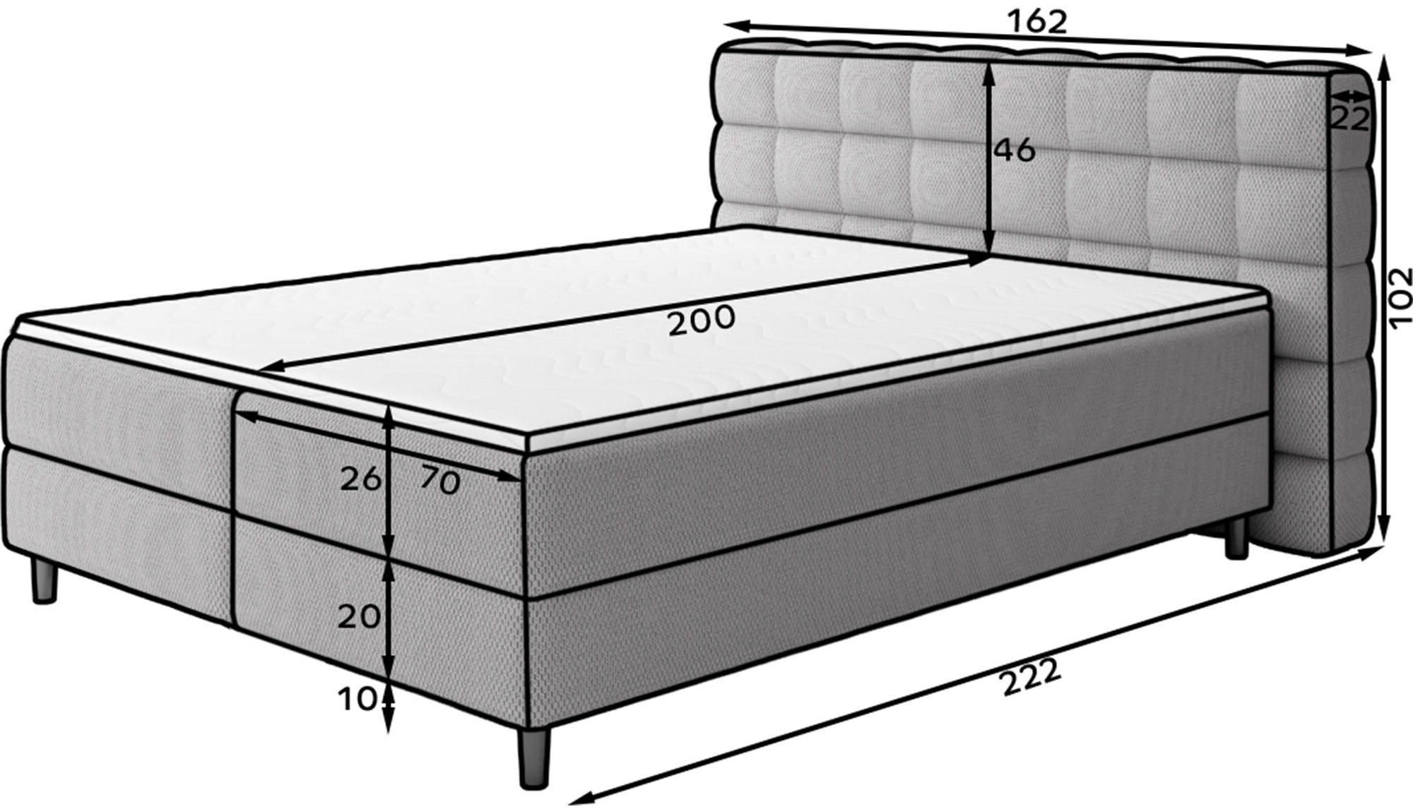 Camma je tipičan predstavnik modernih boxspring kreveta, kod kojih je udobnost spavanja postavljena u prvi plan. Ukupna visina konstrukcije iznosi 102 cm, dok duljina doseže 222 cm. Model je dostupan s ležajnom površinom širine 140 cm, a sve varijante imaju istu duljinu od 200 cm. Takve dimenzije omogućuju optimalno prilagođavanje prostoru i različitim potrebama korisnika – od pojedinaca do parova koji cijene prostranost spavanja.
