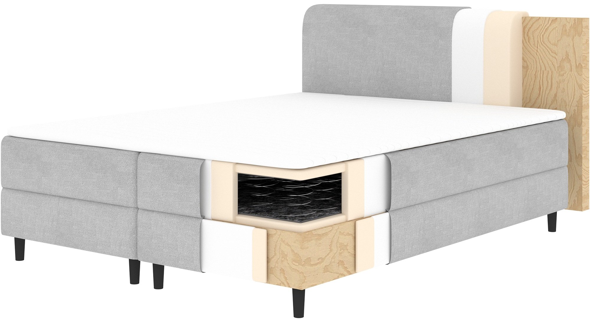 Osnova kreveta izrađena je od kvalitetnog drva, što osigurava čvrstoću i dug vijek trajanja konstrukcije. Tapecirani okvir presvučen je tkaninom Modullo 35, koja je ugodna na dodir i jednostavna za održavanje. Unutrašnjost ležišta sadrži kombinaciju bonell opruga i pjene T2540, što stvara optimalnu potporu i elastičnost. Uzglavlje je dodatno obloženo pjenom T2130, što doprinosi mekšem naslonu i većoj udobnosti.