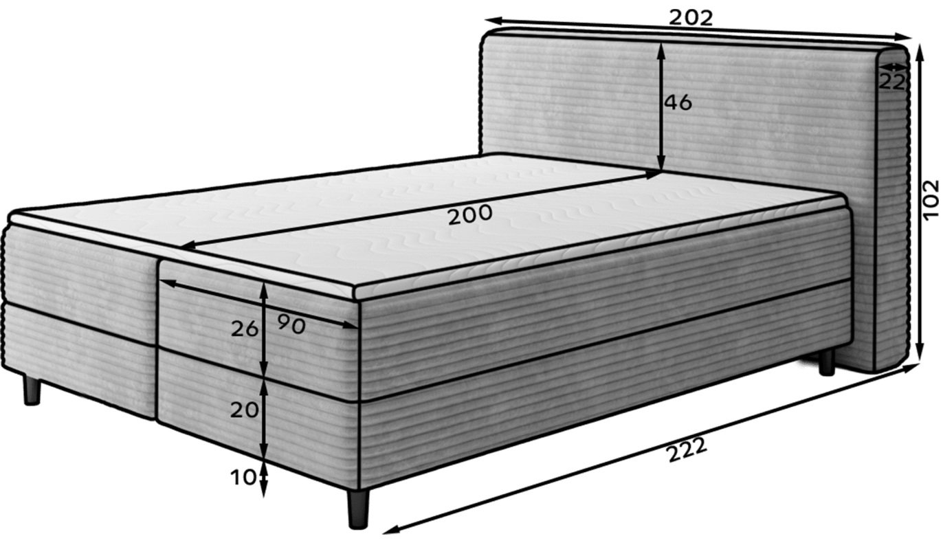 Visina sjedenja iznosi 46 cm, što omogućuje udoban i ergonomski pristup ležištu. Kombinacija pjene T2540 i bonell opruga osigurava optimalnu raspodjelu težine, što znači da se tijelo tijekom sna potpuno opušta. Takva struktura idealna je za one koji žele kombinaciju čvrste potpore i ugodne mekoće. Drvene noge u crnoj boji dodaju eleganciju, a istovremeno osiguravaju stabilnost cijele konstrukcije.