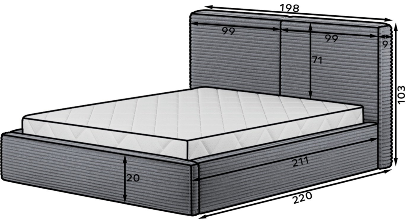 Ukupna duljina kreveta iznosi 220 cm, visina uzglavlja 103 cm. Ovisno o odabranoj varijanti, ležajna površina dostupna je u tri dimenzije: 140x200 cm, 160x200 cm i 180x200 cm. Širina kreveta mijenja se prema modelu i omogućuje optimalno prilagođavanje prostoru. Unatoč modernom obliku, krevet zadržava kompaktnost, pa se lijepo uklapa i u veće i u manje spavaće sobe.