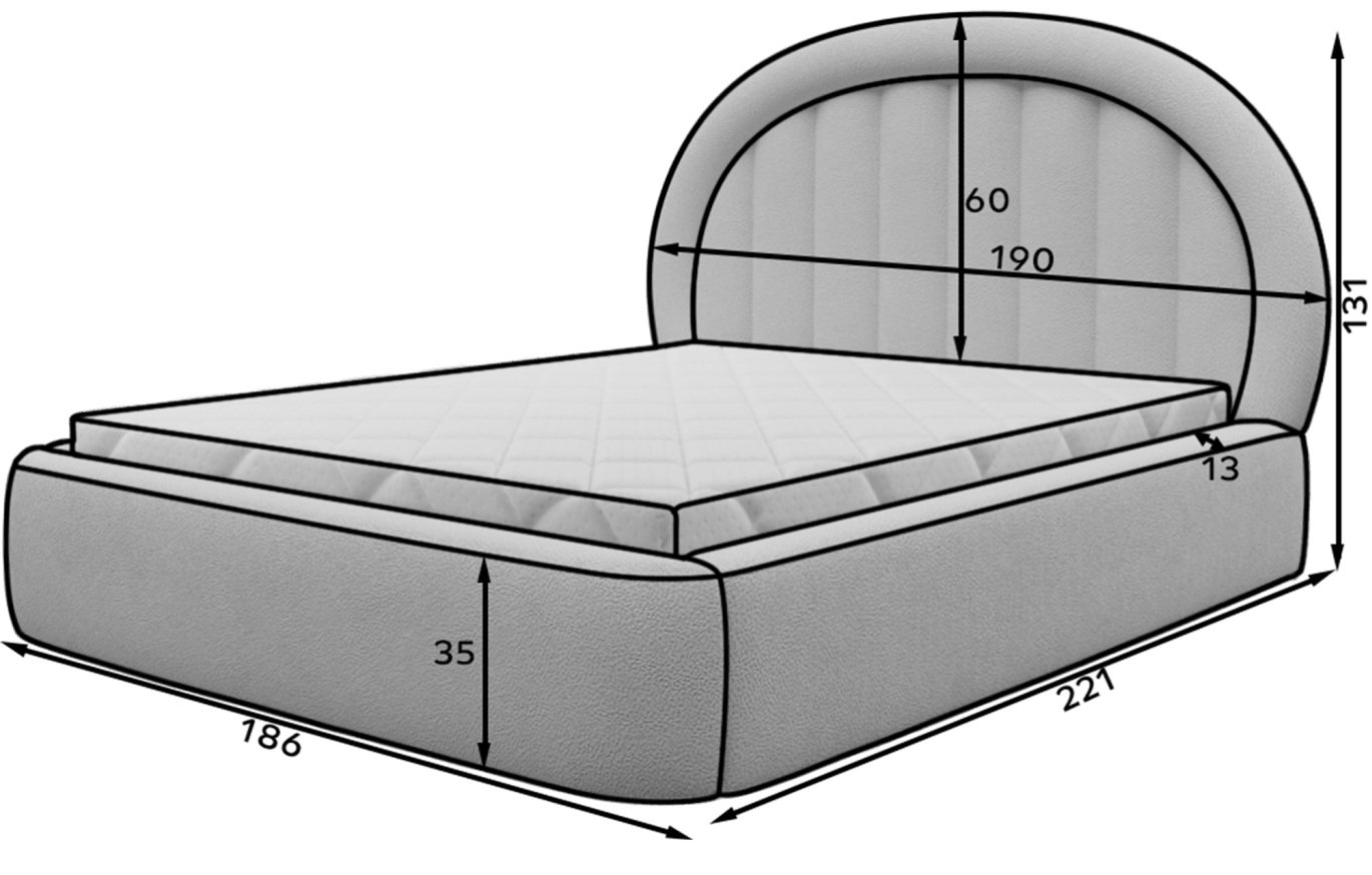 Model Tapedo ima ukupne vanjske mjere 221 cm duljine i 131 cm visine. Dostupan je u tri izvedbe ležajne površine – 140x200 cm, 160x200 cm i 180x200 cm – što omogućuje da se krevet optimalno prilagodi veličini prostora i potrebama korisnika. Bez obzira na odabranu širinu, krevet zadržava harmonične proporcije i vizualno uravnoteženu siluetu, koja pridonosi elegantnom izgledu spavaće sobe.