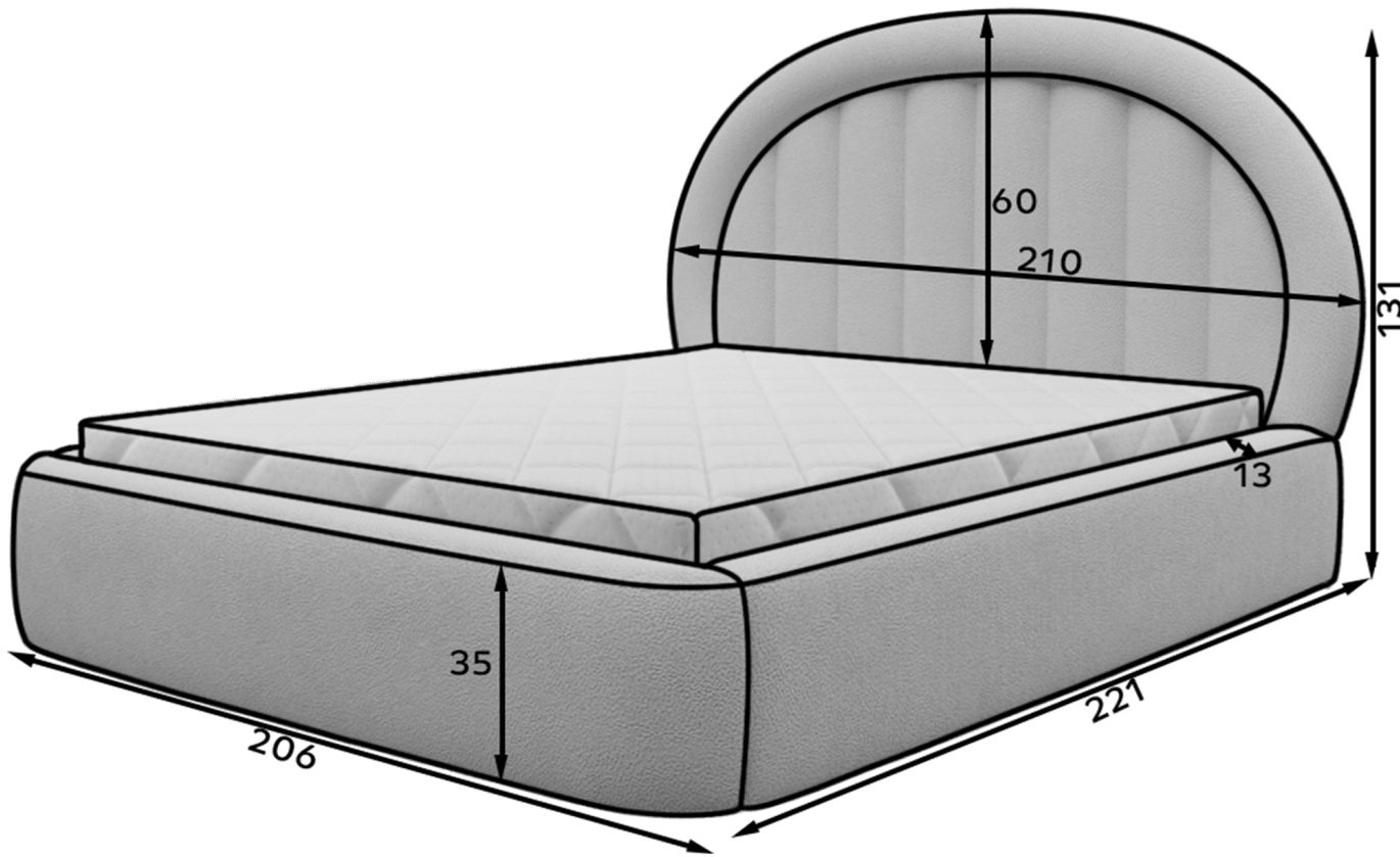 Model Tapedo ima ukupne vanjske mjere 221 cm duljine i 131 cm visine. Dostupan je u tri izvedbe ležajne površine – 140x200 cm, 160x200 cm i 180x200 cm – što omogućuje da se krevet optimalno prilagodi veličini prostora i potrebama korisnika. Bez obzira na odabranu širinu, krevet zadržava harmonične proporcije i vizualno uravnoteženu siluetu, koja pridonosi elegantnom izgledu spavaće sobe.