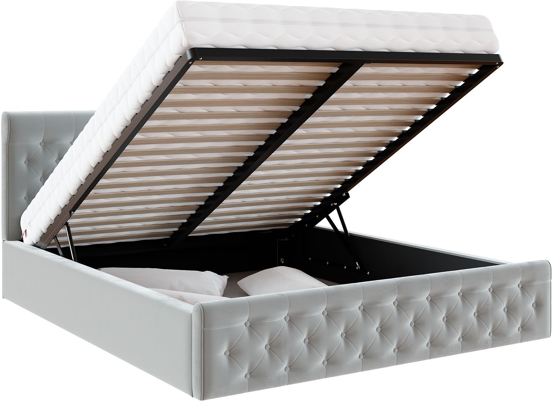 Okvir kreveta je tapeciran i izrađen od kombinacije drveta i kvalitetne iverice, što osigurava stabilnost i dug vijek trajanja. Jezgru čini pjena T-25, poznata po svojoj elastičnosti i otpornosti na udubljenja. Ova vrsta pjene često se koristi u konstrukcijama kreveta jer zadržava oblik i pruža udobnu potporu kralježnici. Cijela konstrukcija dodatno je ojačana čeličnim podiznim mehanizmom koji omogućuje jednostavno podizanje ležišta i pristup prostranoj ladici za posteljinu.