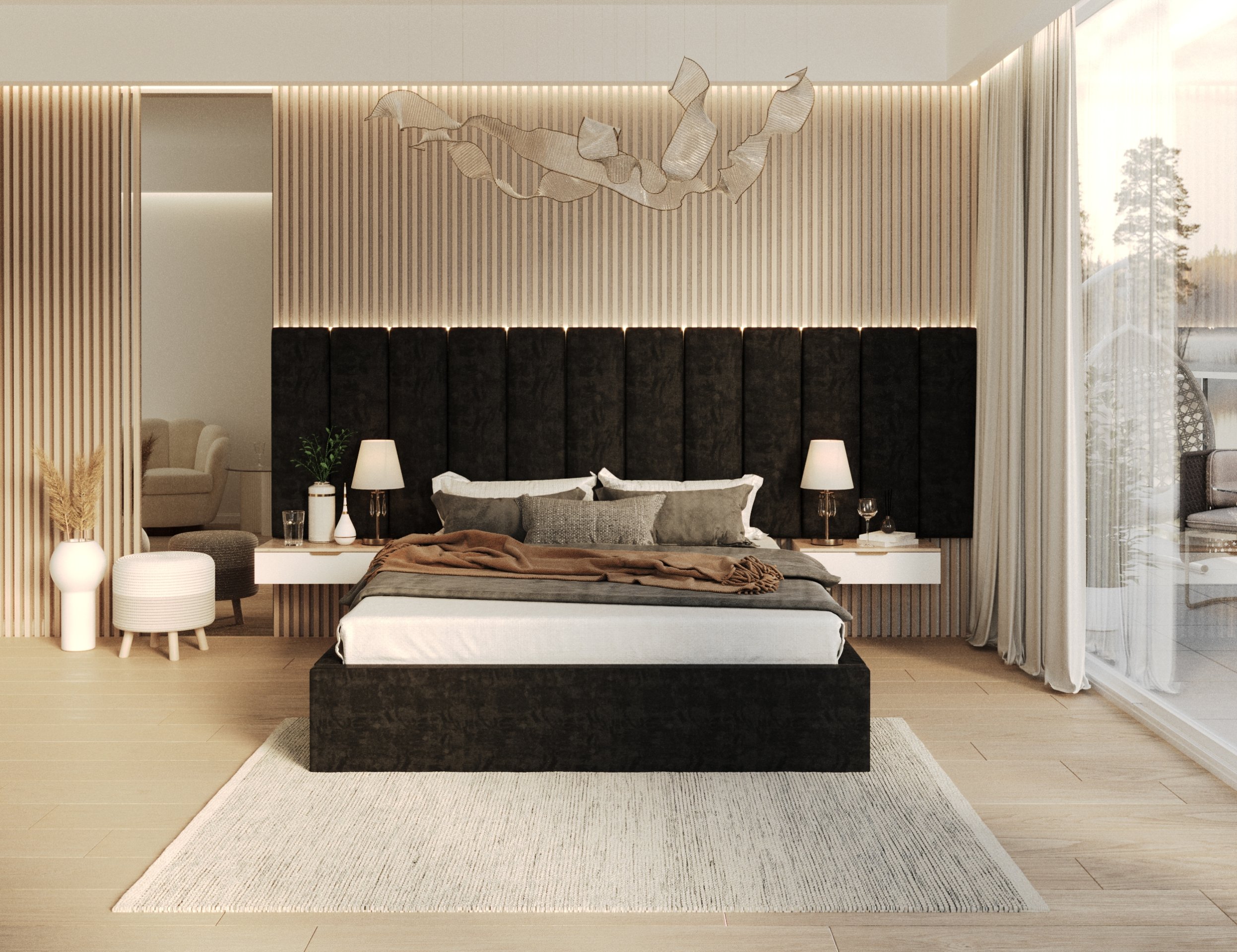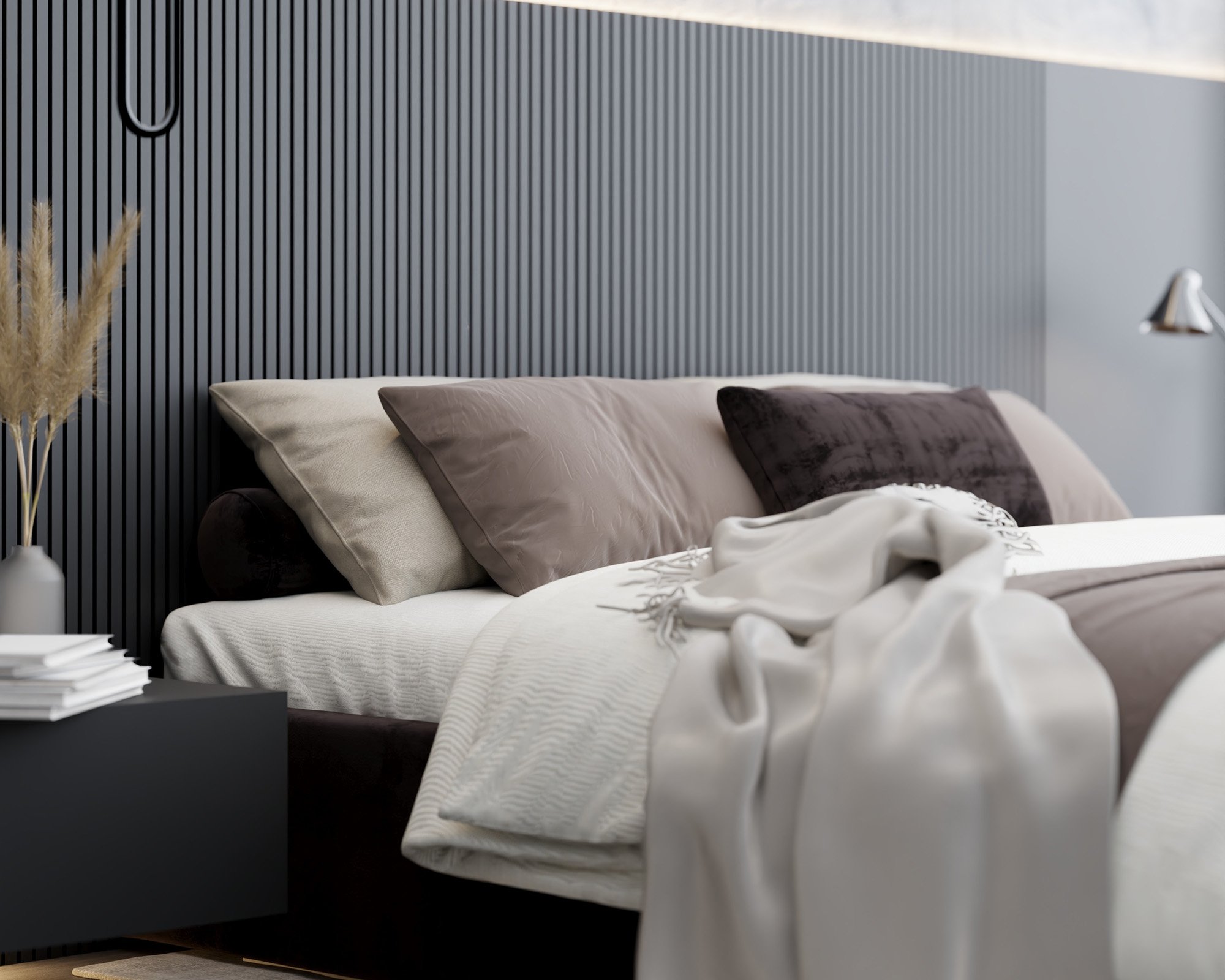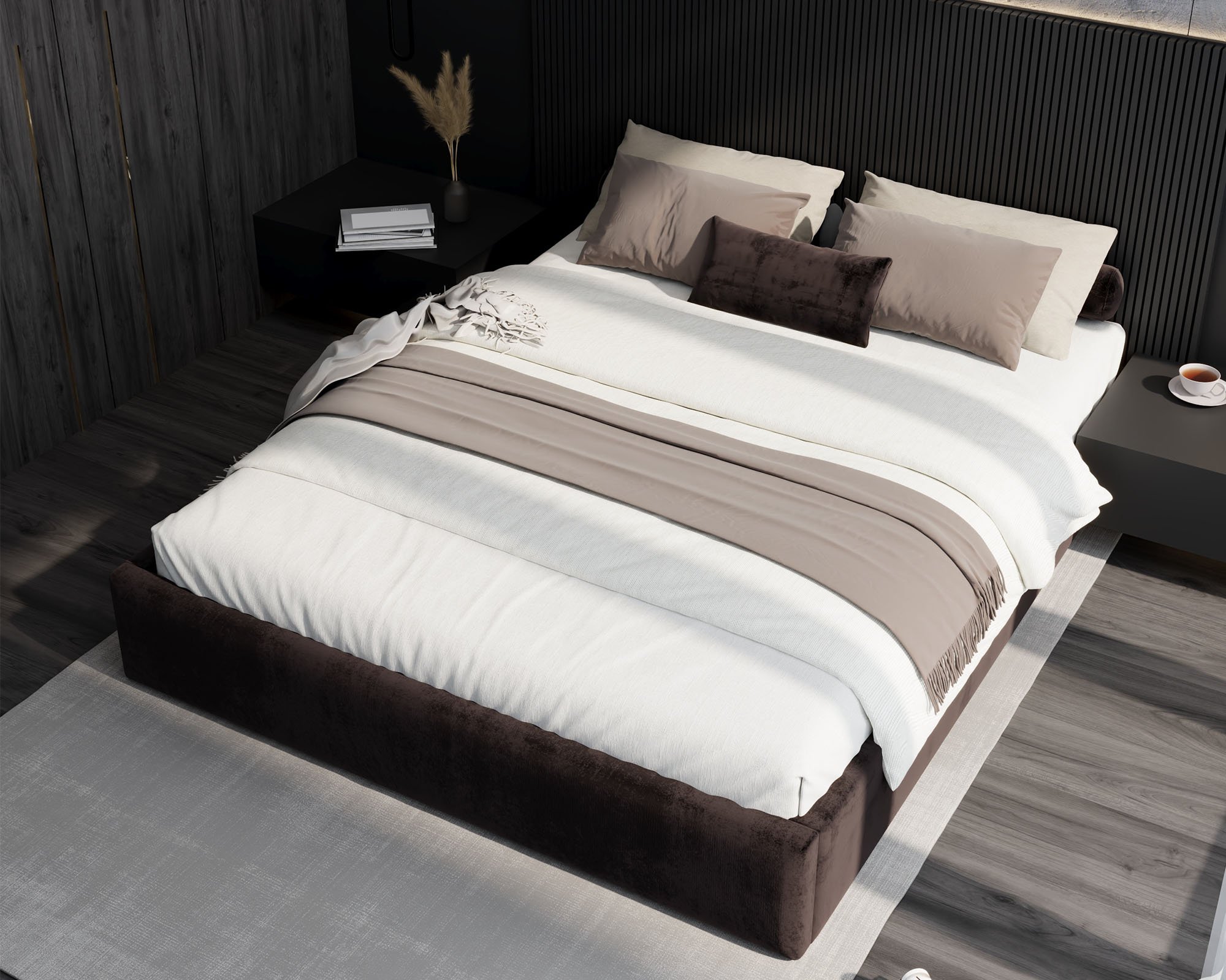 Model Orlando dostupan je u više boja i tkanina, što omogućuje potpunu usklađenost s ostatkom interijera. Osnovna tkanina na slici – Trinity Black – naglašava eleganciju i suvremenost, ali moguće je odabrati i druge nijanse boja za osobniji izgled spavaće sobe. Bez obzira na odabranu boju, krevet zadržava svoj profinjeni karakter i lijepo se uklapa s različitim dekorativnim elementima.